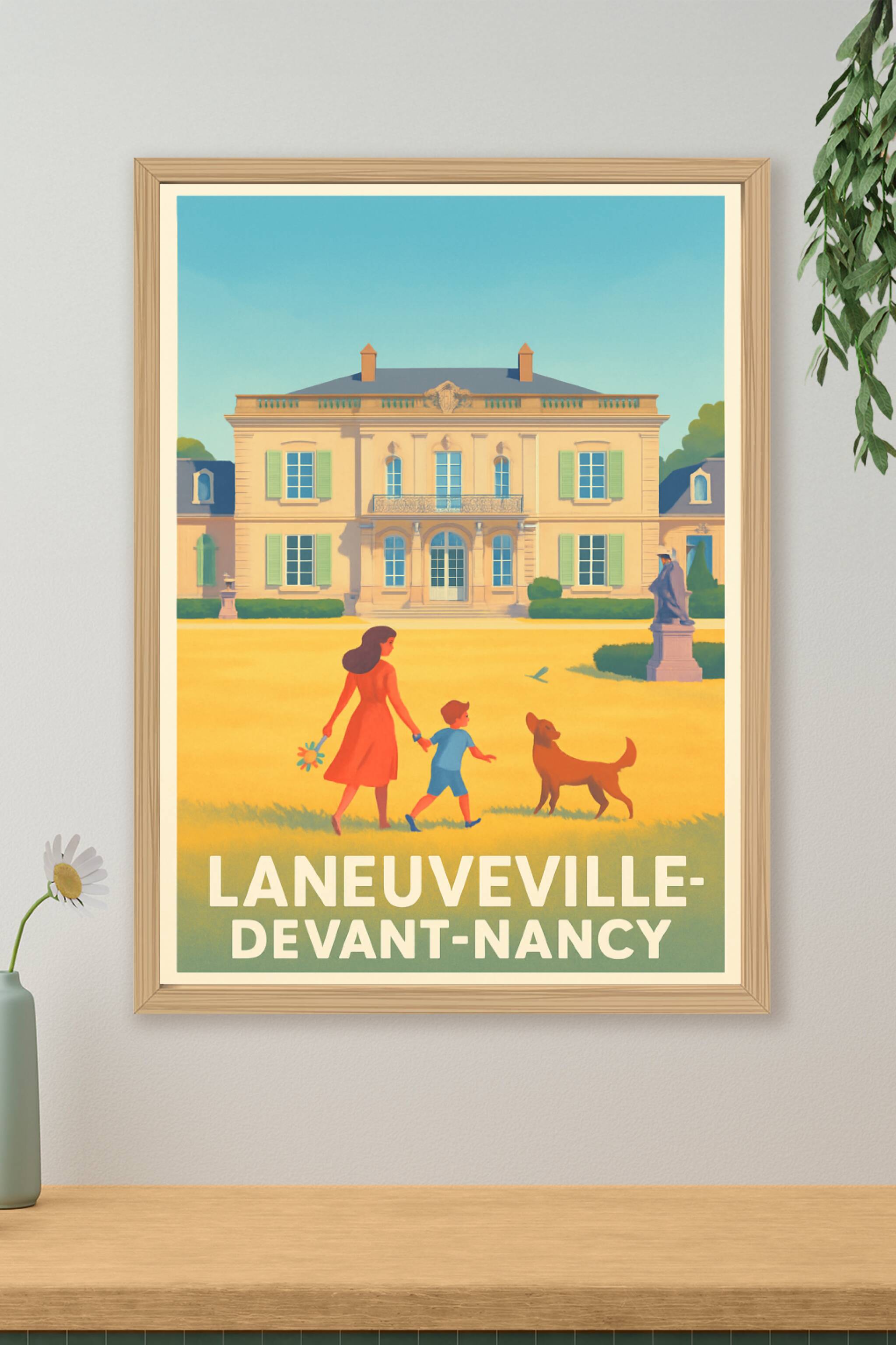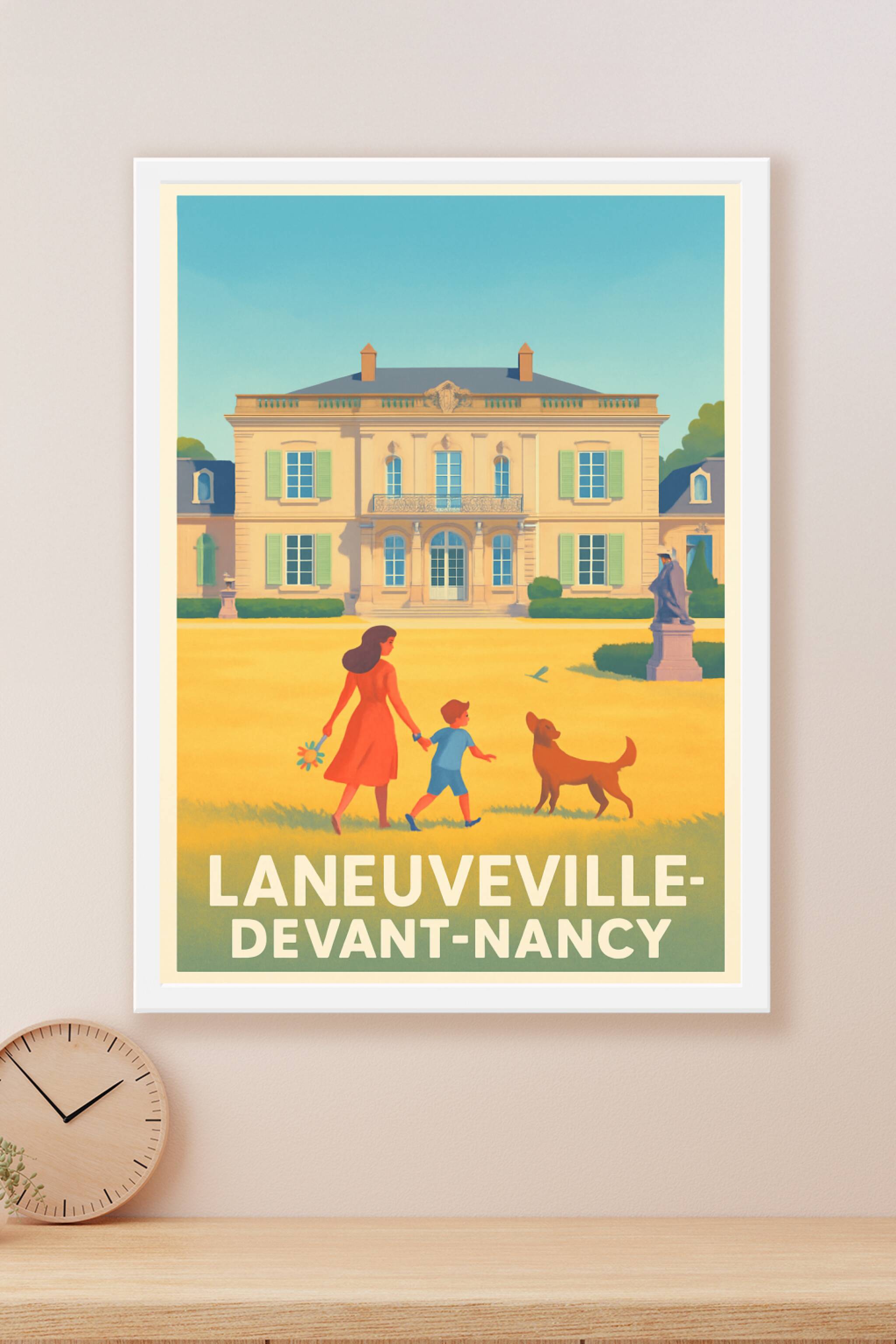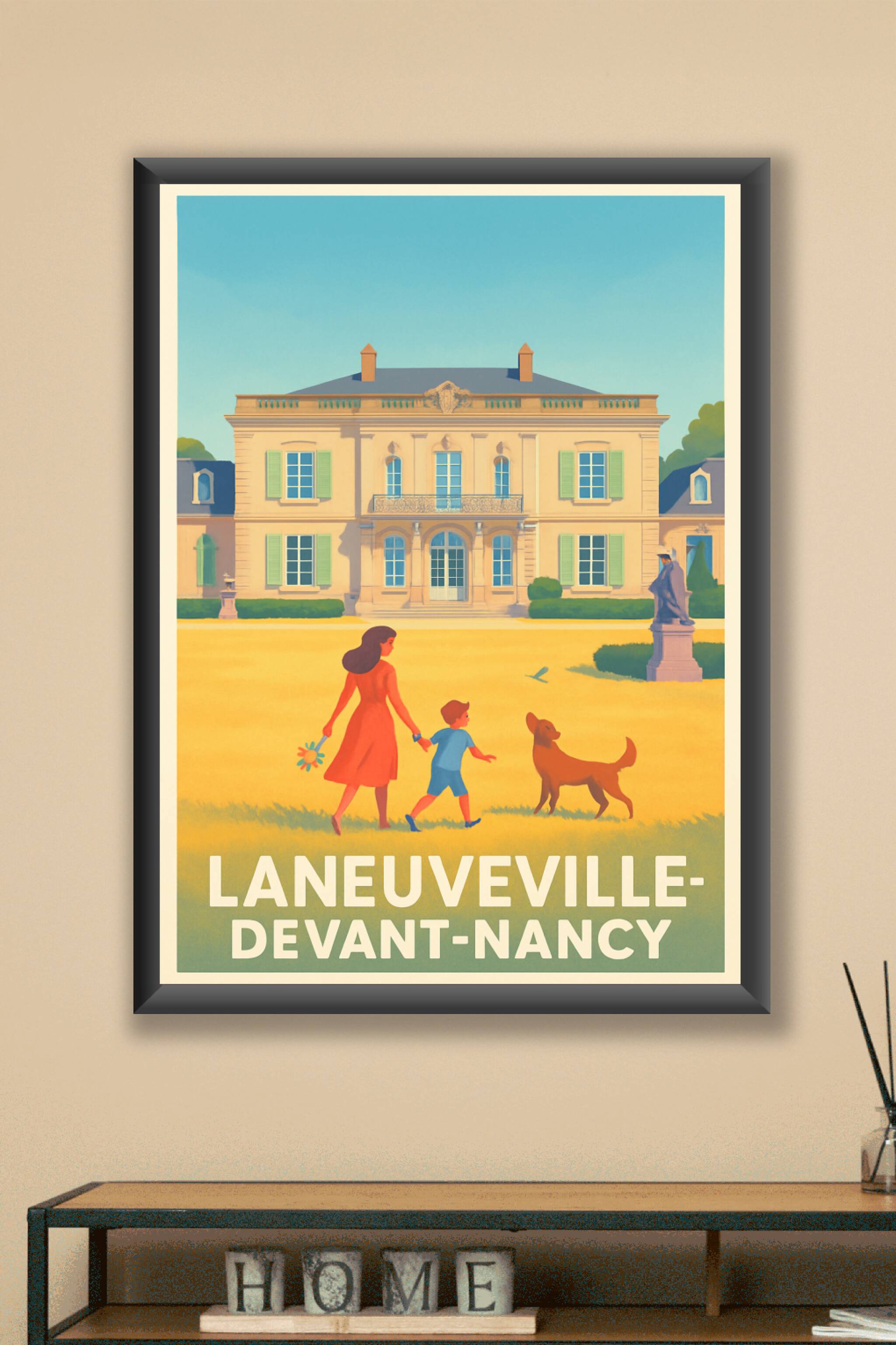Découvrez cette magnifique affiche illustrant une scène paisible devant une élégante bâtisse de Laneuveville-devant-Nancy, mettant en valeur l'harm...
