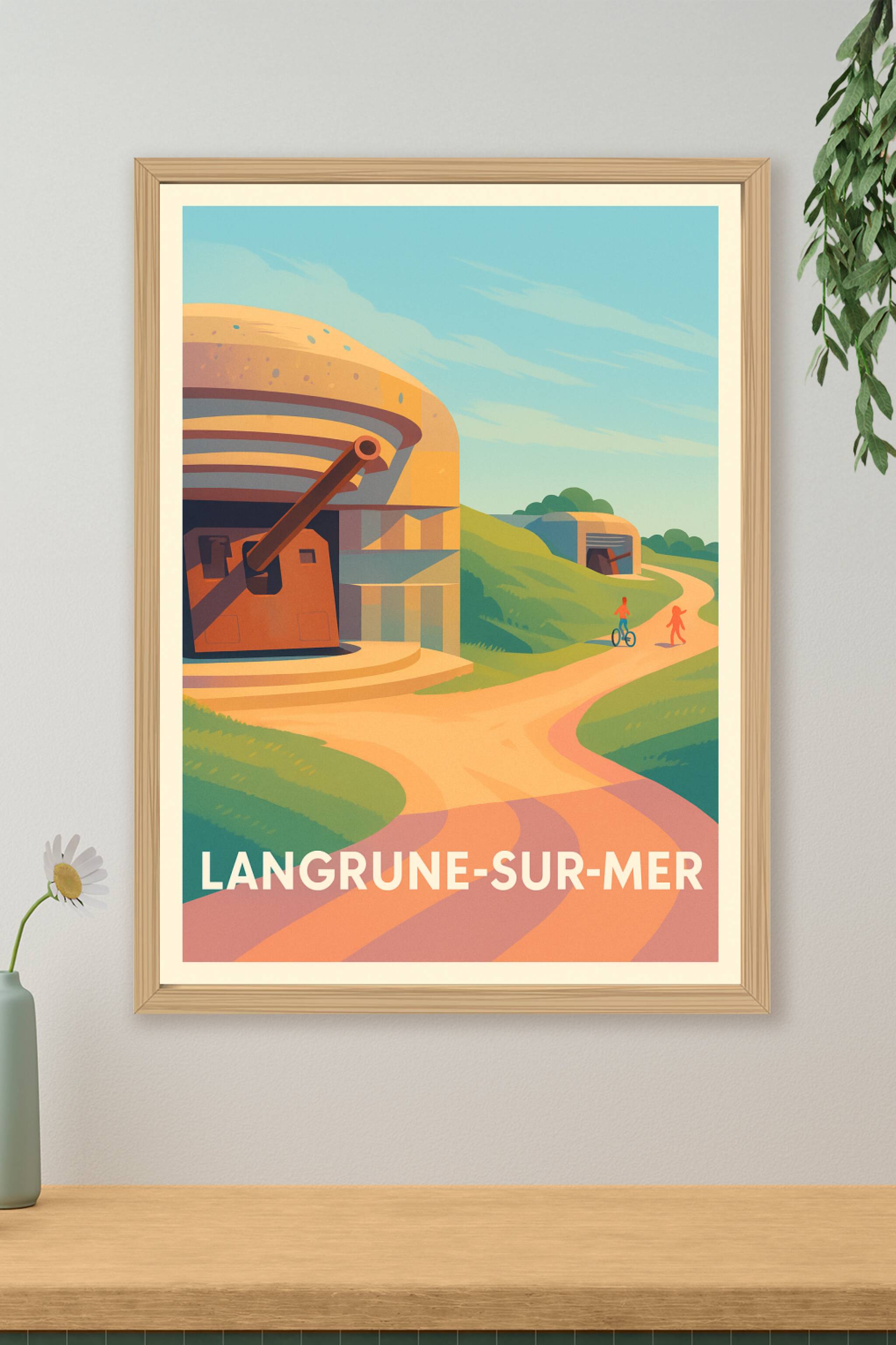 Découvrez Langrune-sur-Mer à travers cette affiche aux couleurs douces et au style vintage, mettant en scène les célèbres blockhaus de la côte norm...