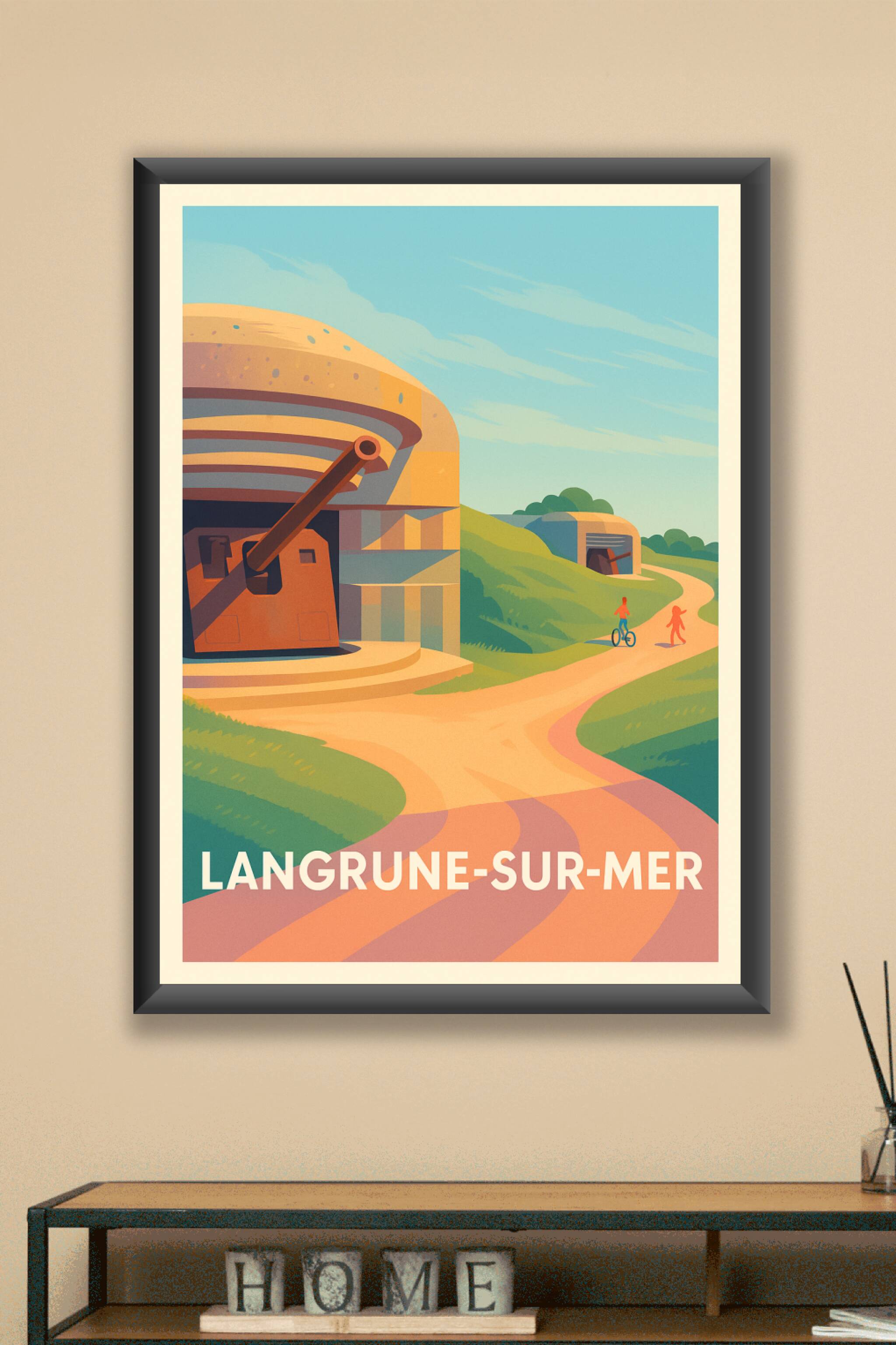 Découvrez Langrune-sur-Mer à travers cette affiche aux couleurs douces et au style vintage, mettant en scène les célèbres blockhaus de la côte normande sous un ciel serein. Ce poster évoque à la fois mémoire historique et douceur de vivre, avec deux silhouettes s’adonnant à la promenade et au vélo sur des chemins sinueux. Imprimé en tirage « Fine Art » sur papier 305g coton, ce poster garantit une qualité d’impression exceptionnelle et un rendu des couleurs parfait. Disponible en formats A1, A2, A3 et A4, avec ou sans cadre, cette affiche s’adapte parfaitement à votre décoration intérieure ou à un cadeau unique pour les passionnés d’histoire et de nature. Profitez d’un produit premium 100% fabricé en France pour une touche élégante et authentique.