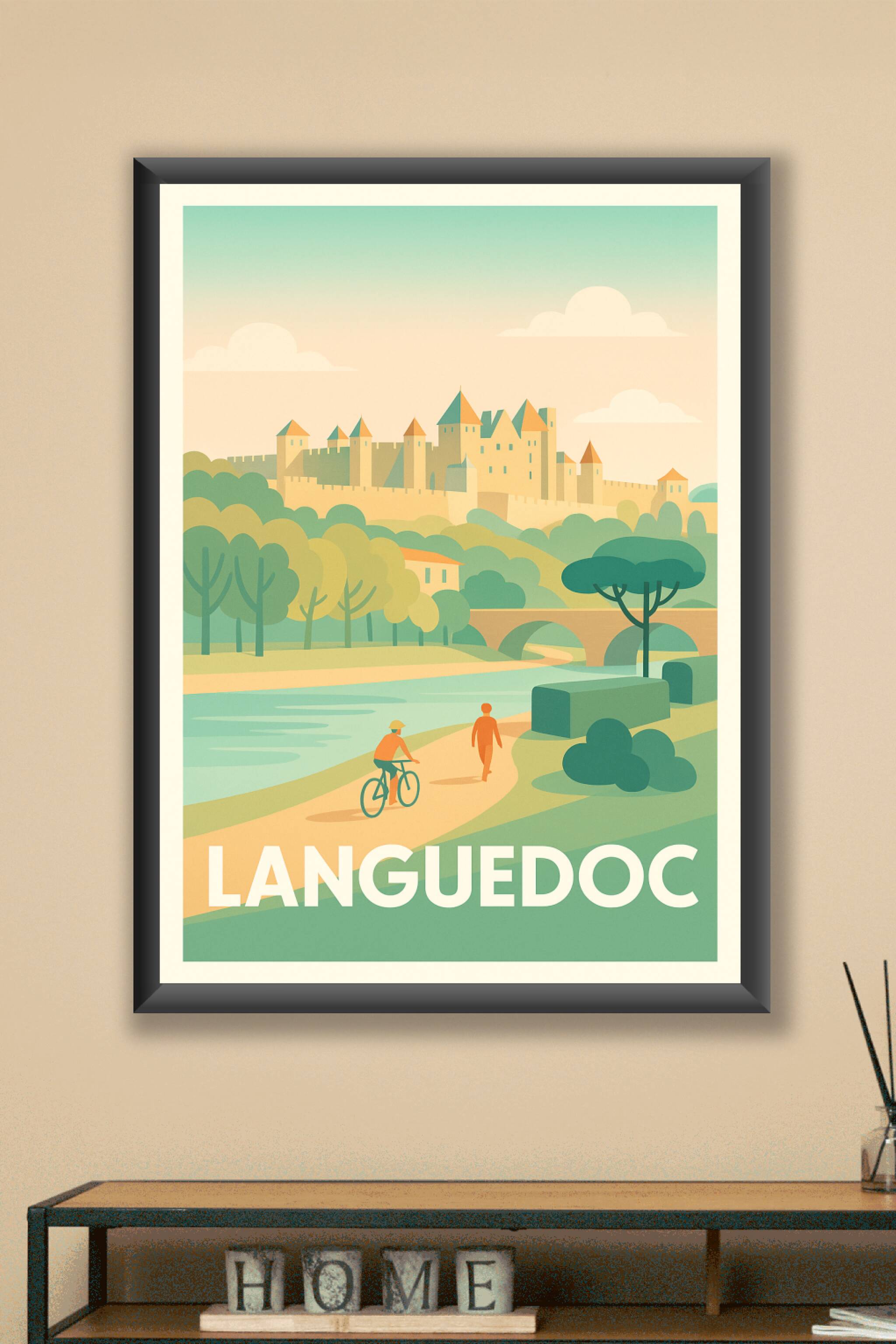 Découvrez la beauté intemporelle du Languedoc avec cette affiche au design rétro mettant en scène un paysage paisible où promeneurs et cyclistes lo...