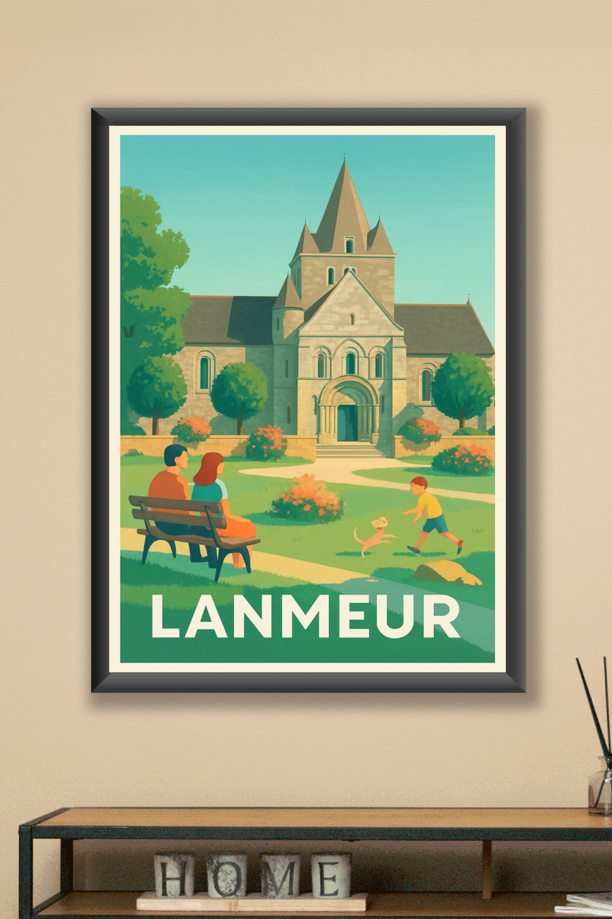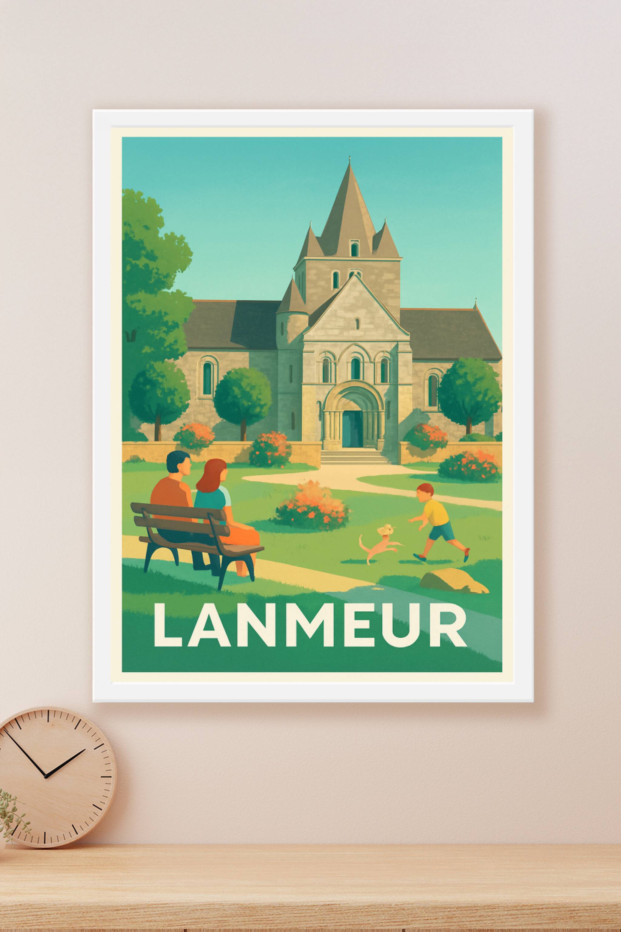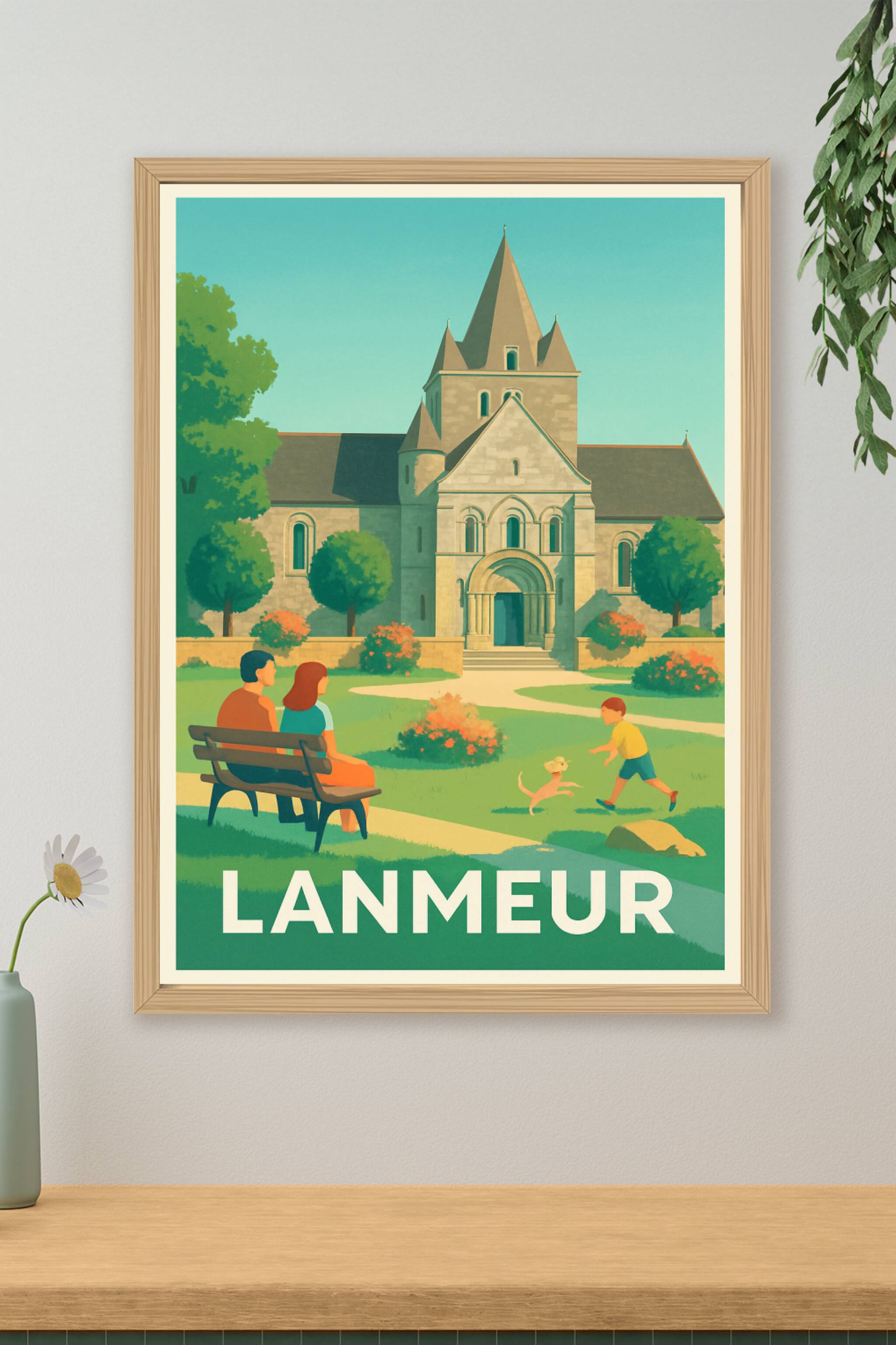 Découvrez la douceur de vivre à Lanmeur avec cette affiche illustrée qui met en valeur l'architecture emblématique de sa charmante église, entourée...