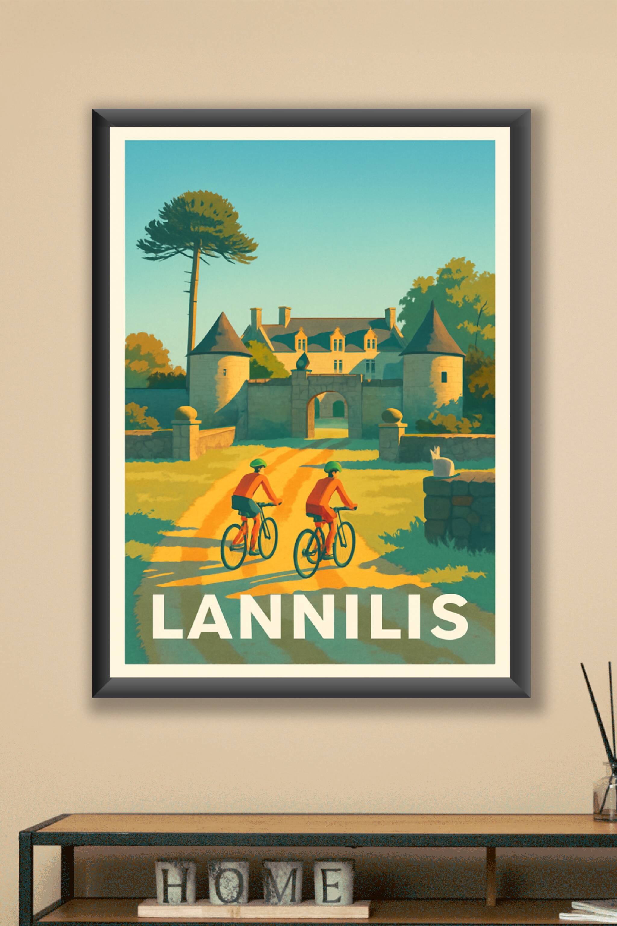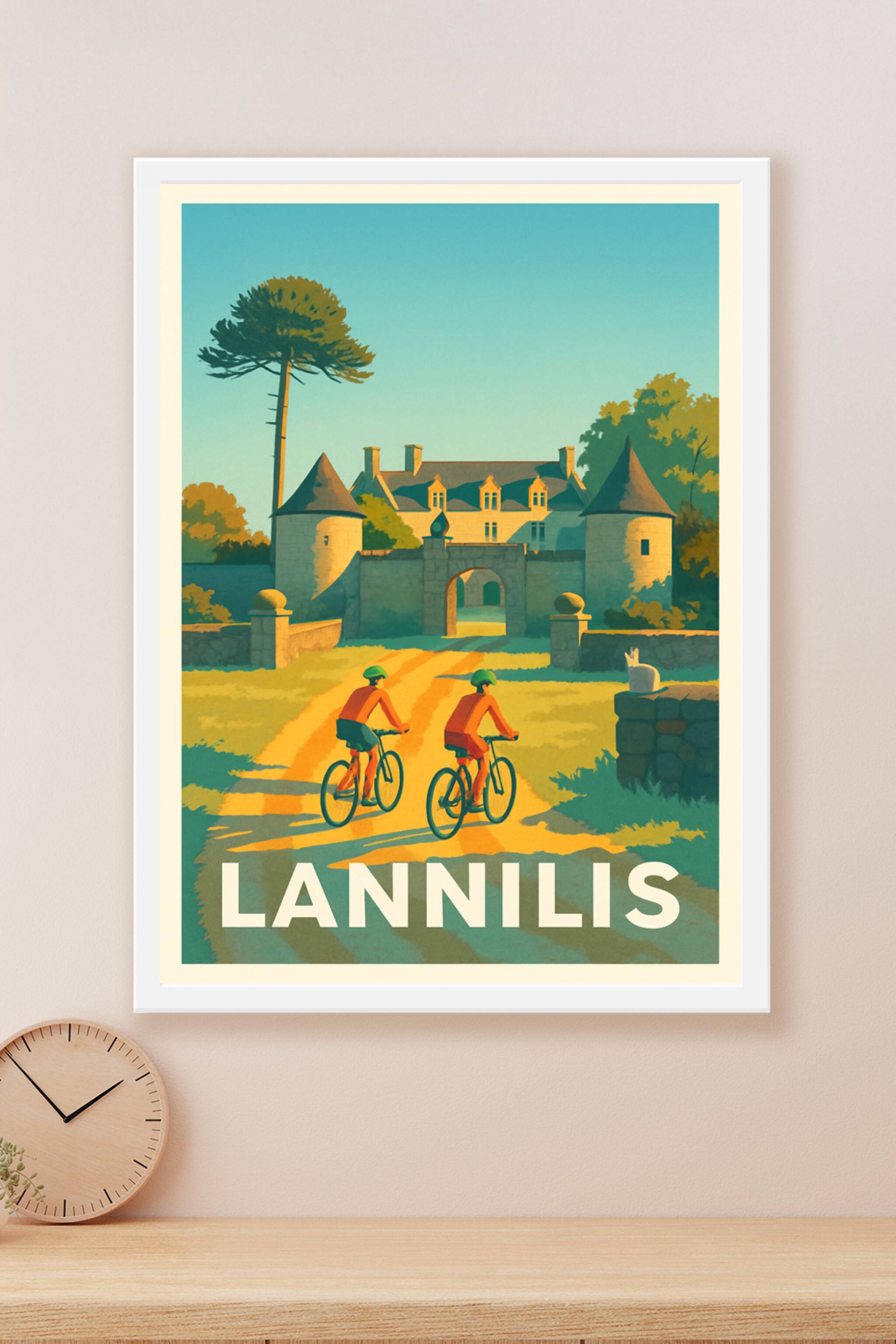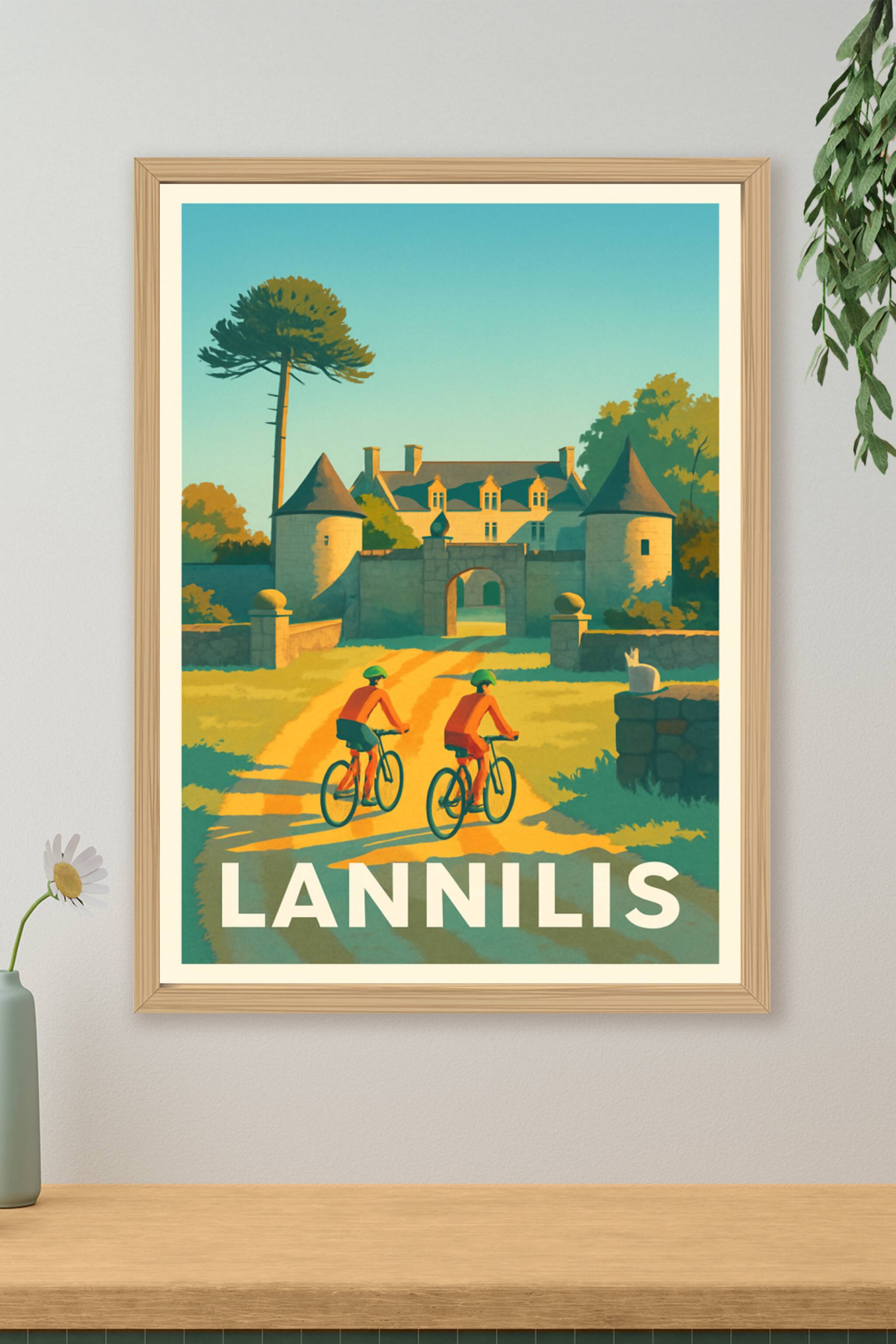 Découvrez le charme authentique de Lannilis avec cette affiche illustrée représentant deux cyclistes explorant un château emblématique baigné par l...