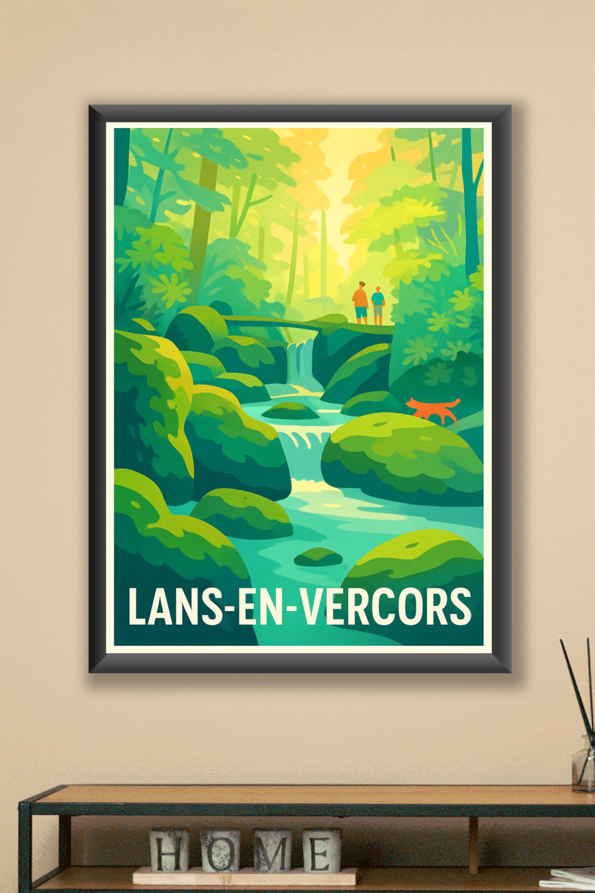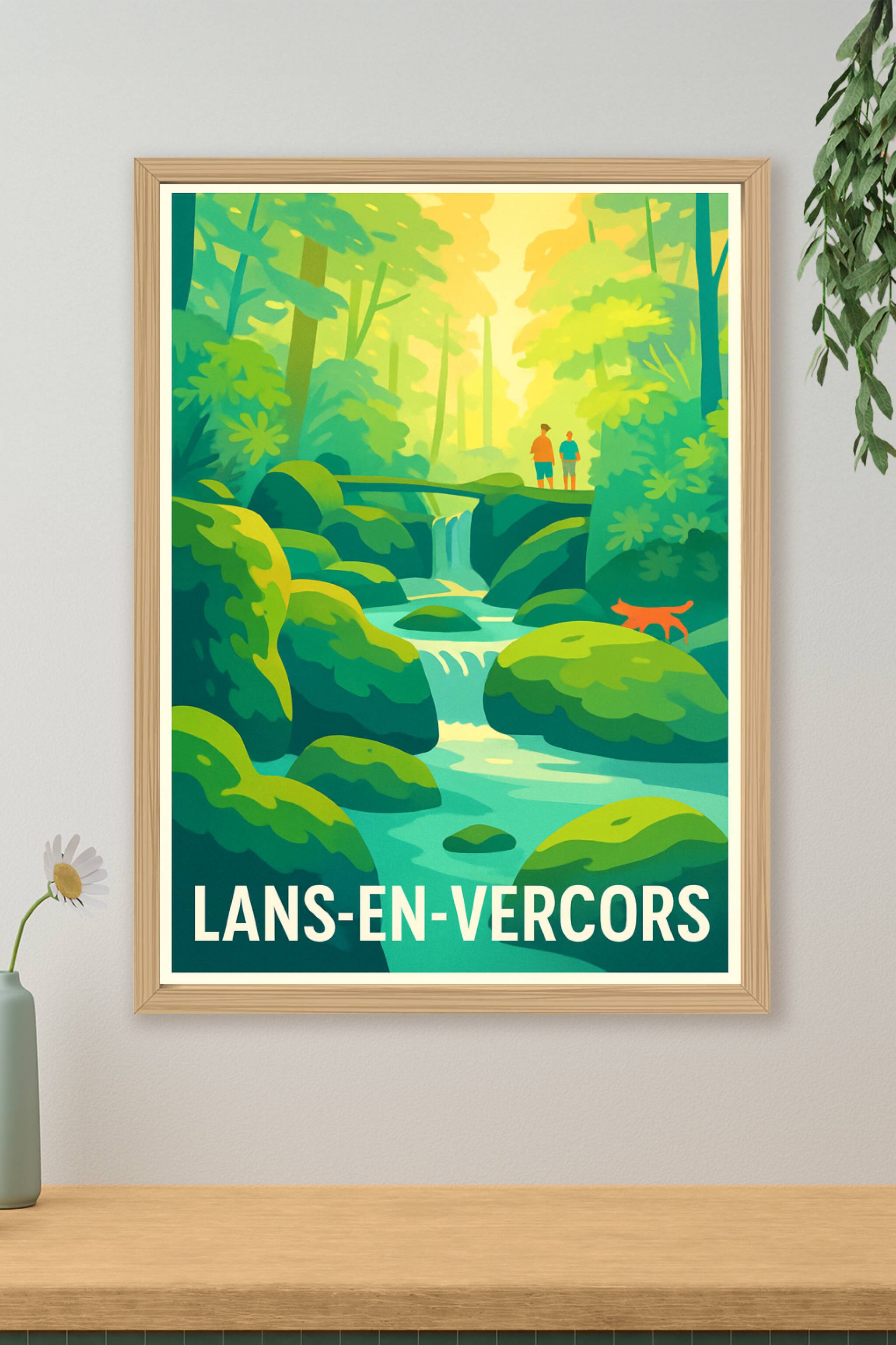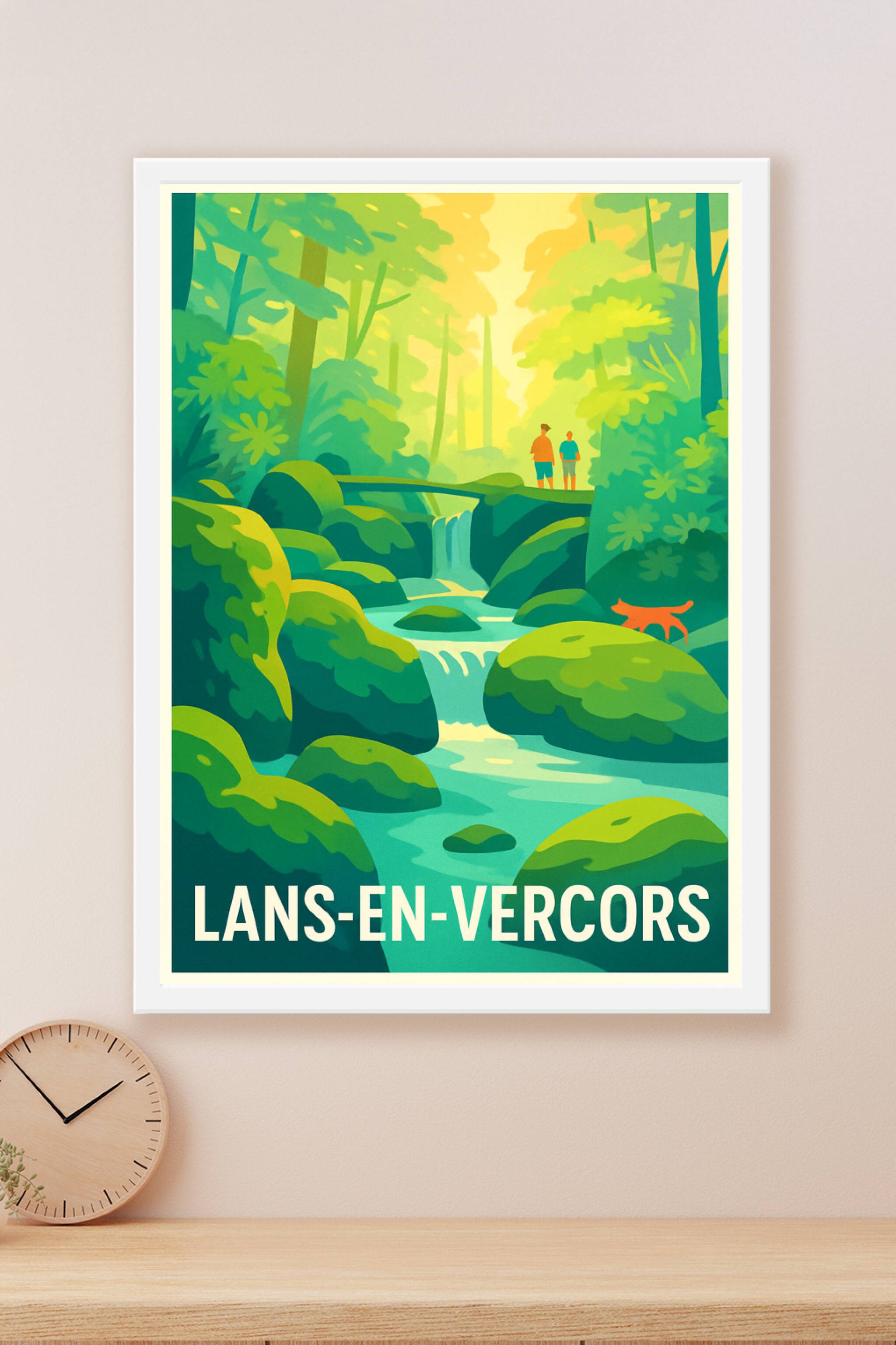 Découvrez la beauté paisible de Lans-en-Vercors avec cette affiche au style illustratif vibrant et lumineux. Ce poster met en scène une cascade enc...