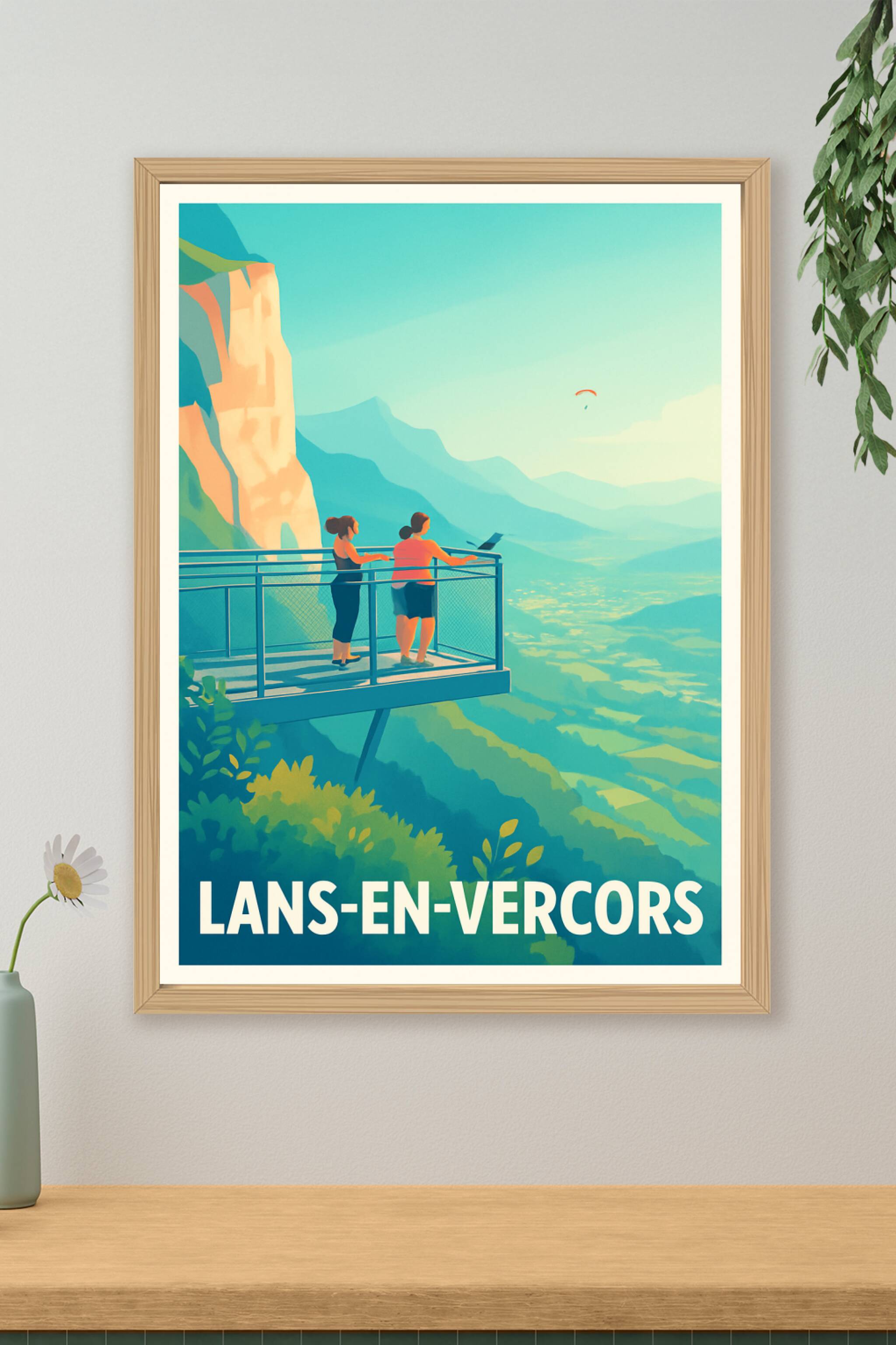 Découvrez la beauté époustouflante des paysages alpins de Lans-en-Vercors avec cette affiche aux couleurs douces et lumineuses, illustrant une plat...