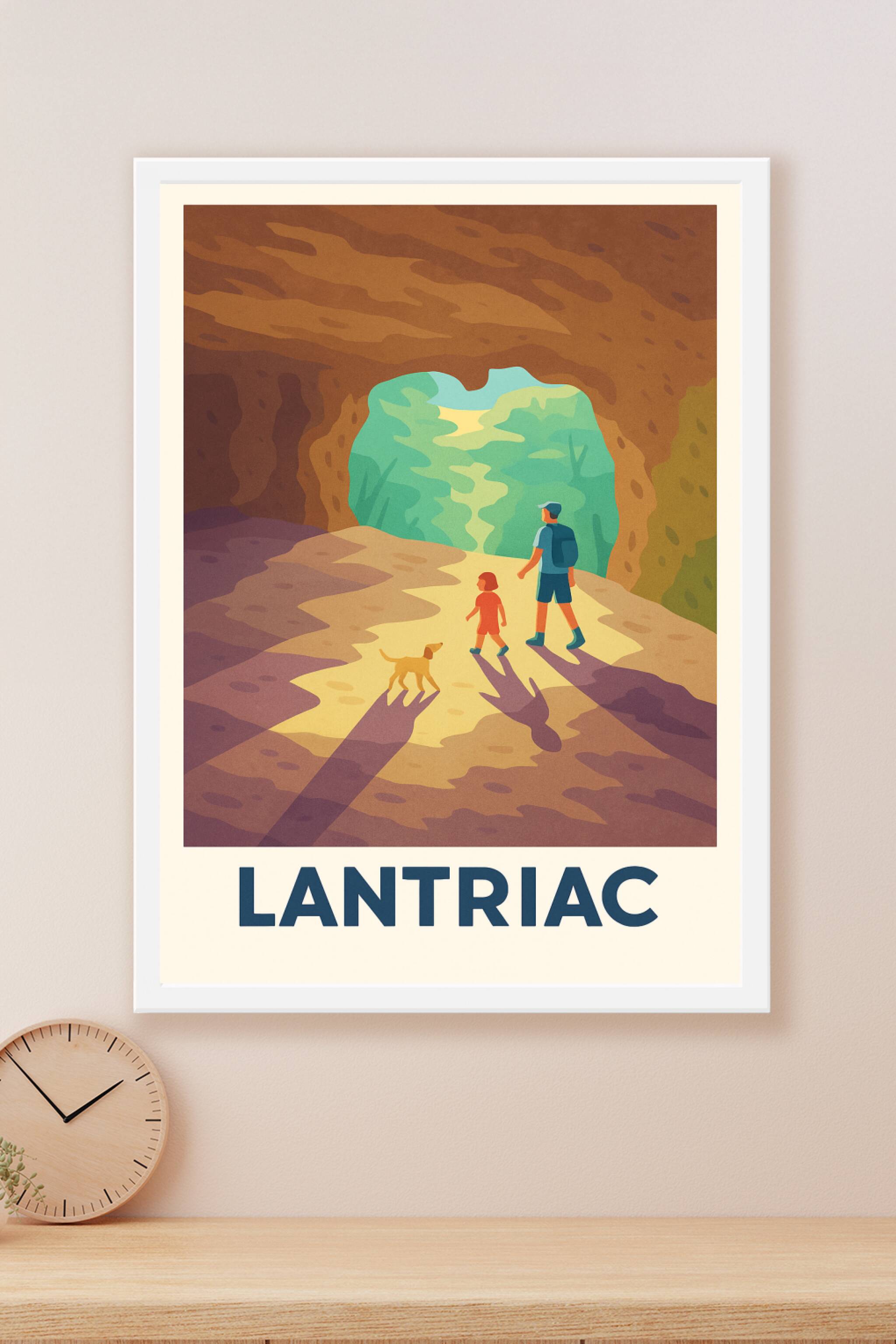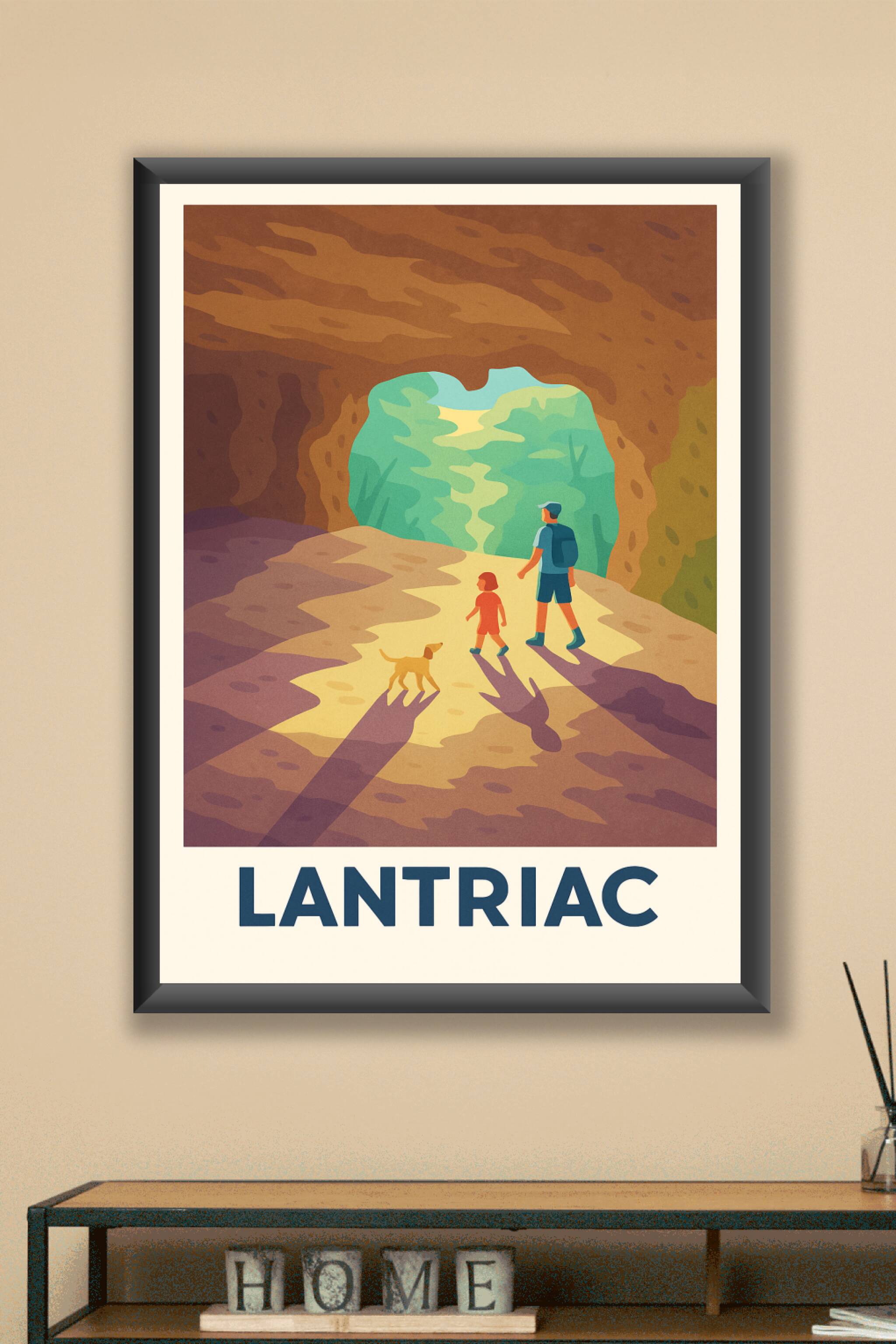 Découvrez la beauté naturelle de Lantriac avec cette affiche au style rétro illustrant une scène paisible de randonnée en famille, accompagnée d’un chien, dans un cadre enchanteur. Ce poster met en lumière la lumière douce filtrant à travers l’entrée d’une grotte, évoquant un sentiment d’aventure et de tranquillité.Ce poster est imprimé en tirage "Fine Art" sur un papier 305g coton, garantissant une qualité d’impression exceptionnelle et des couleurs vibrantes qui dureront dans le temps. Disponible en plusieurs formats allant de A1 à A4, avec ou sans cadre, cette affiche est le choix idéal pour apporter une touche authentique et chaleureuse à votre intérieur. Profitez d’une fabrication 100% française et d’une finition soignée pour vous offrir ou offrir un souvenir unique de Lantriac.