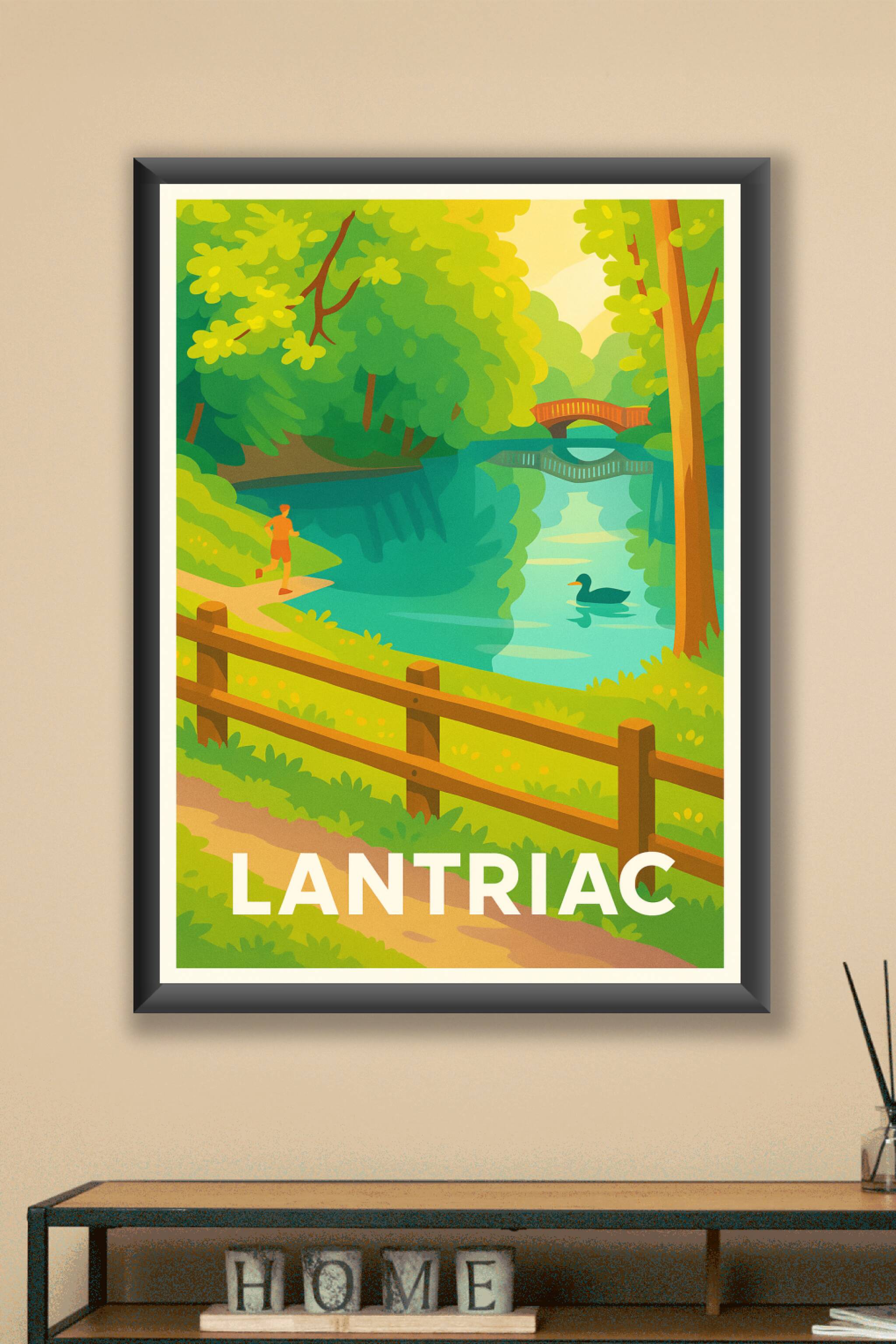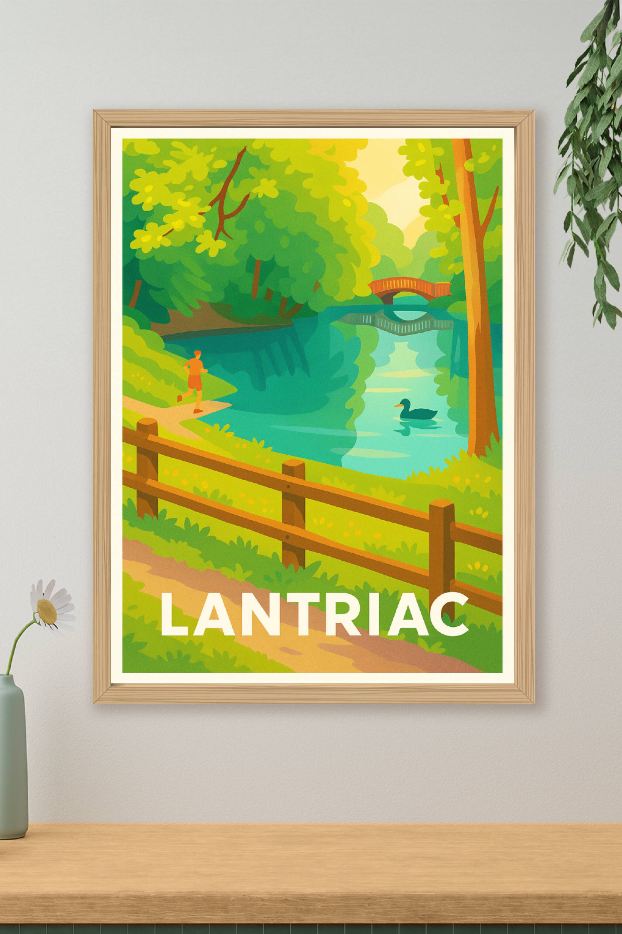 Découvrez la quiétude de Lantriac à travers cette affiche illustrée représentant un paysage naturel paisible avec une rivière, un pont en bois et u...