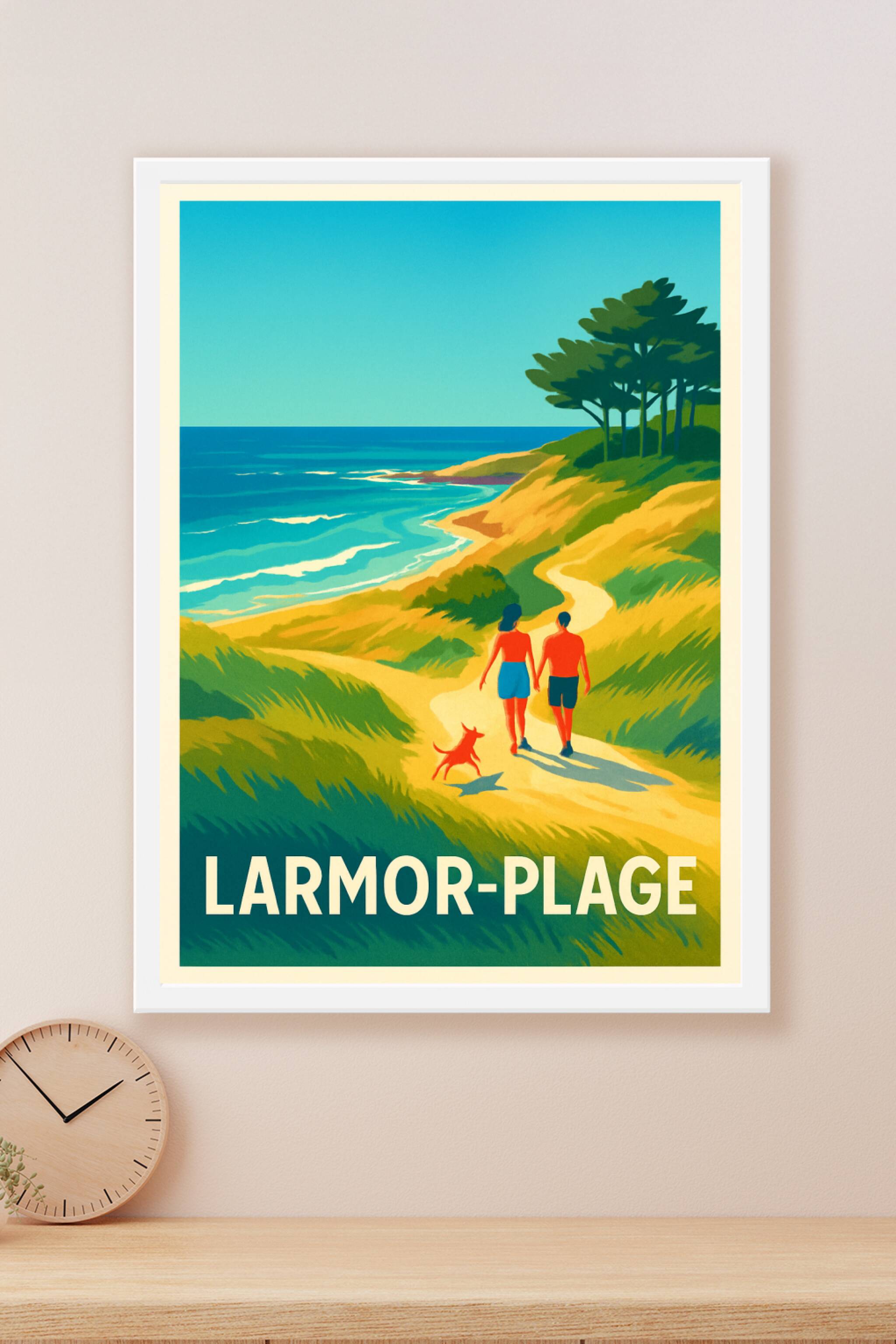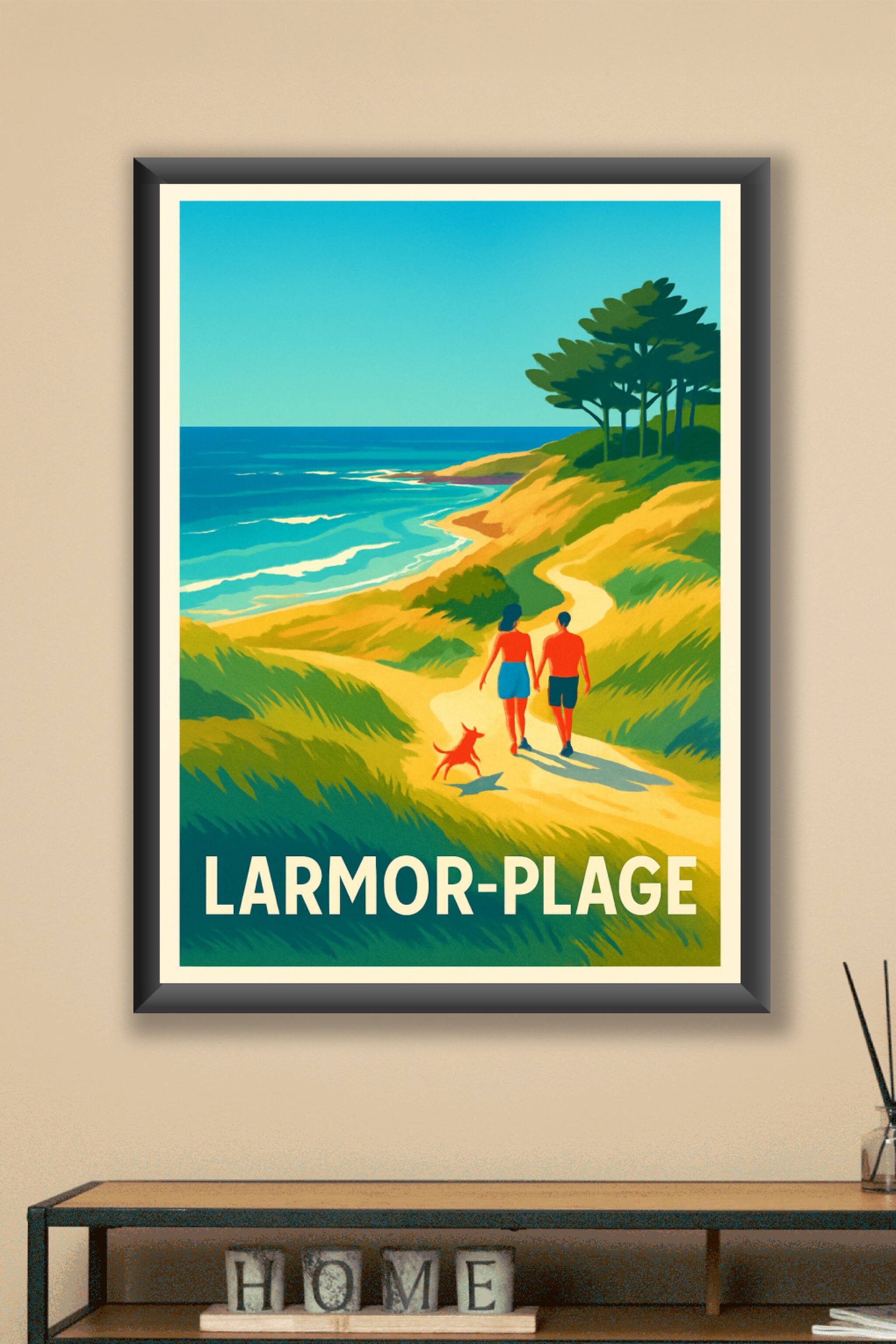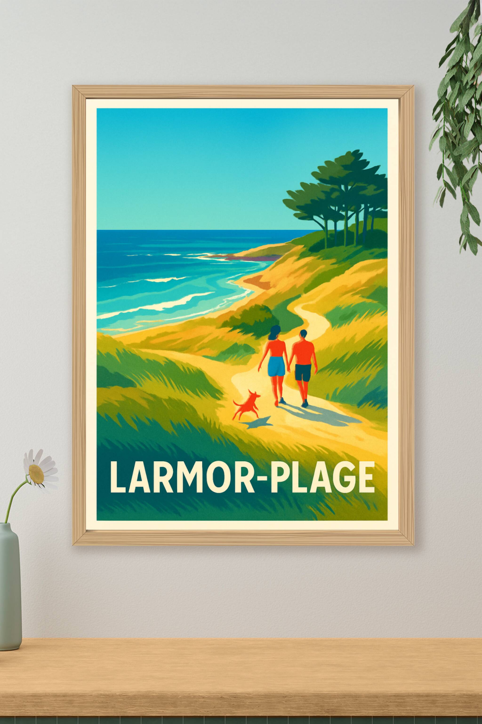Découvrez le charme apaisant de Larmor-Plage avec cette affiche illustrée aux couleurs vives et chaleureuses. Cette scène de promenade en bord de m...