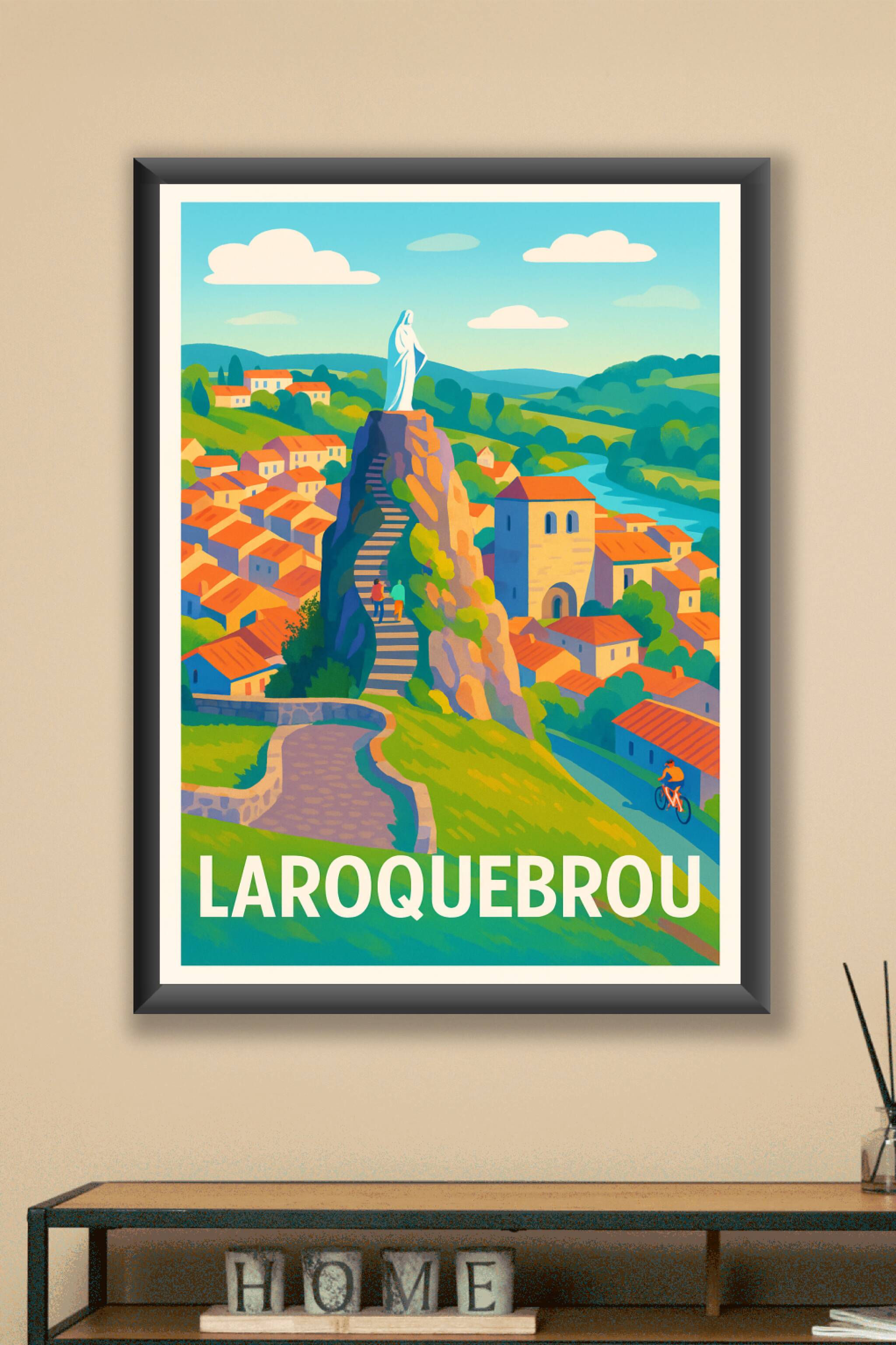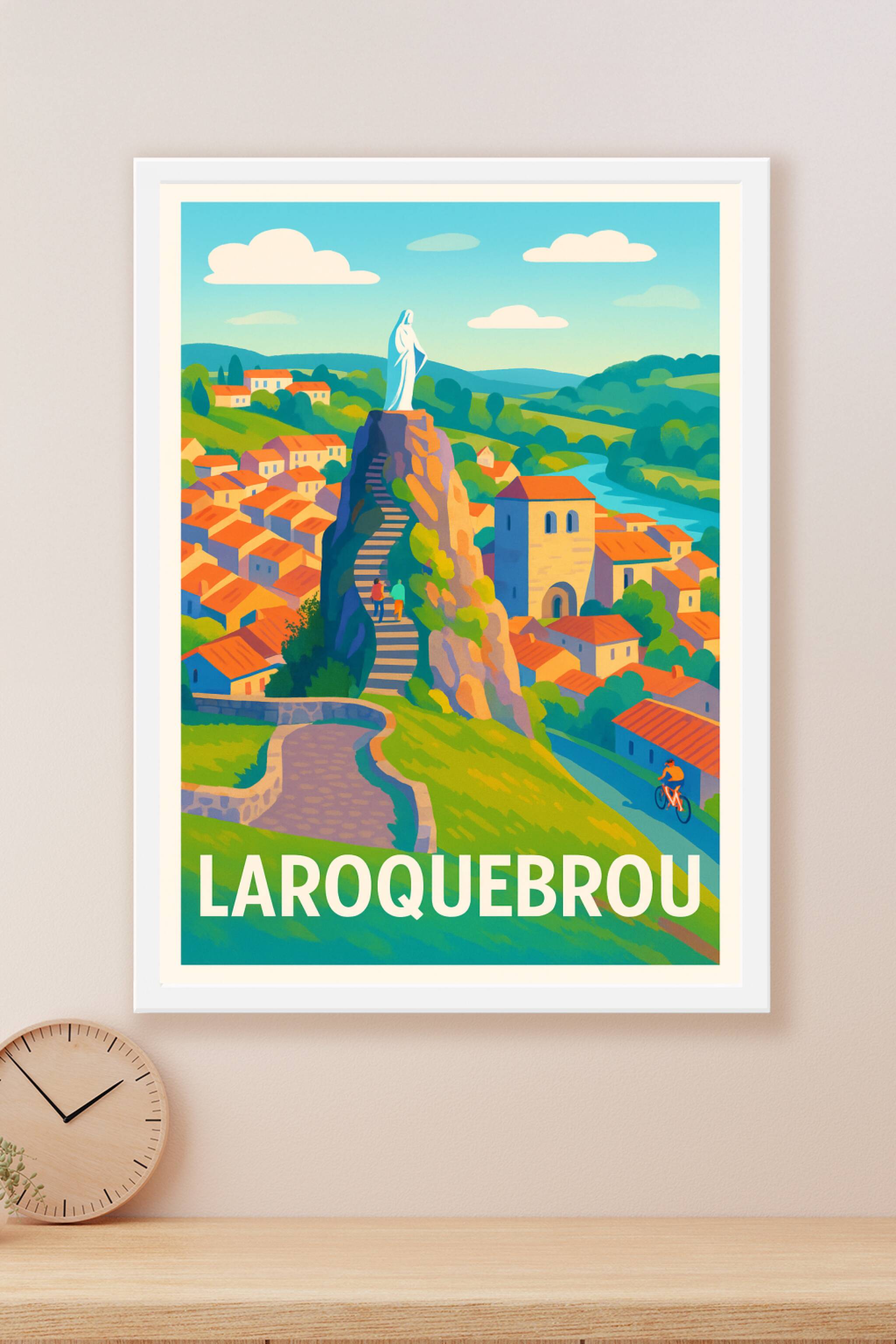 Découvrez la beauté authentique de Laroquebrou avec cette affiche au style graphique coloré et chaleureux. Cette illustration met en lumière l'embl...