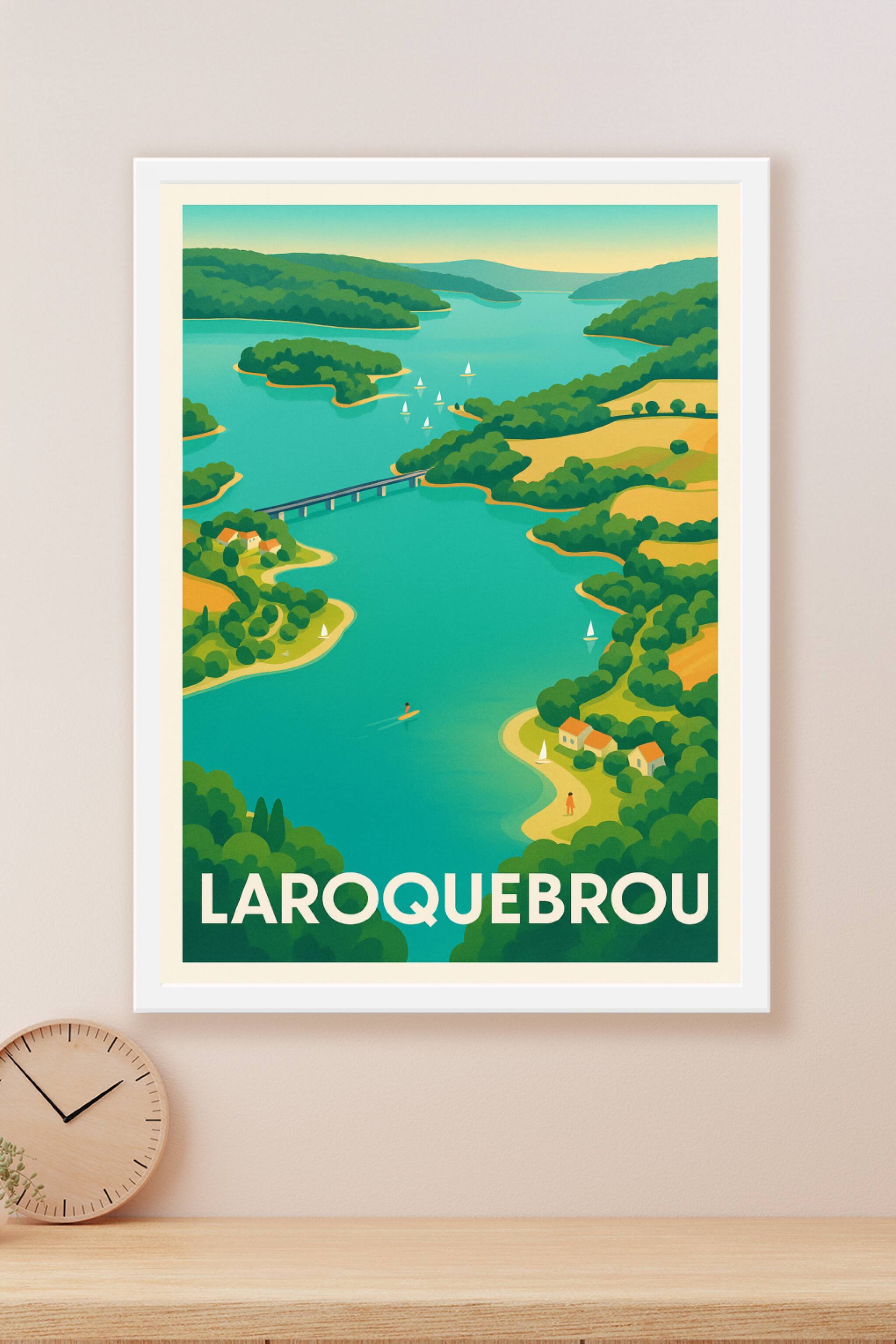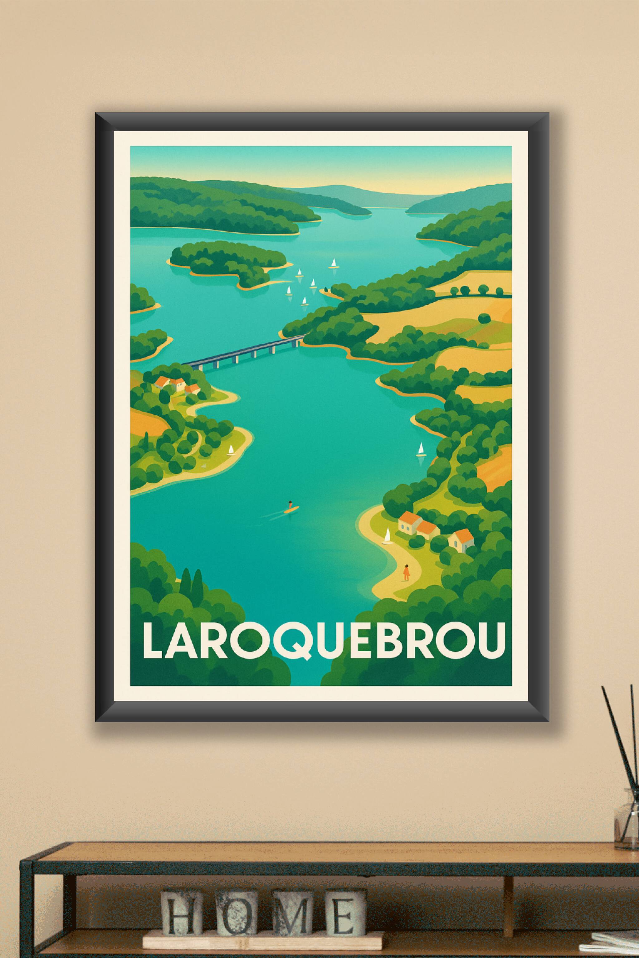Apportez une touche de sérénité et de nature à votre intérieur avec cette affiche illustrée représentant Laroquebrou et ses paysages enchanteurs. C...