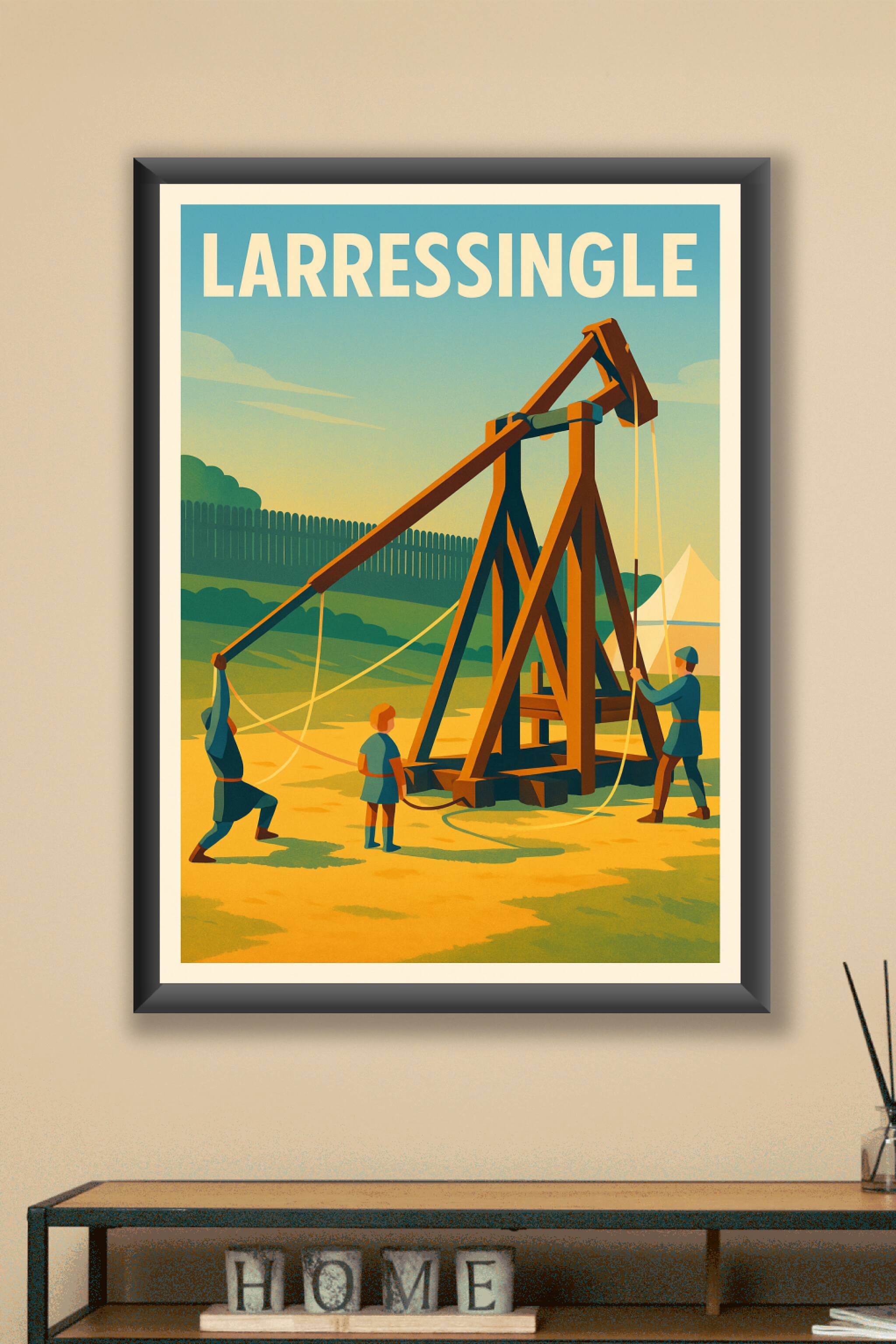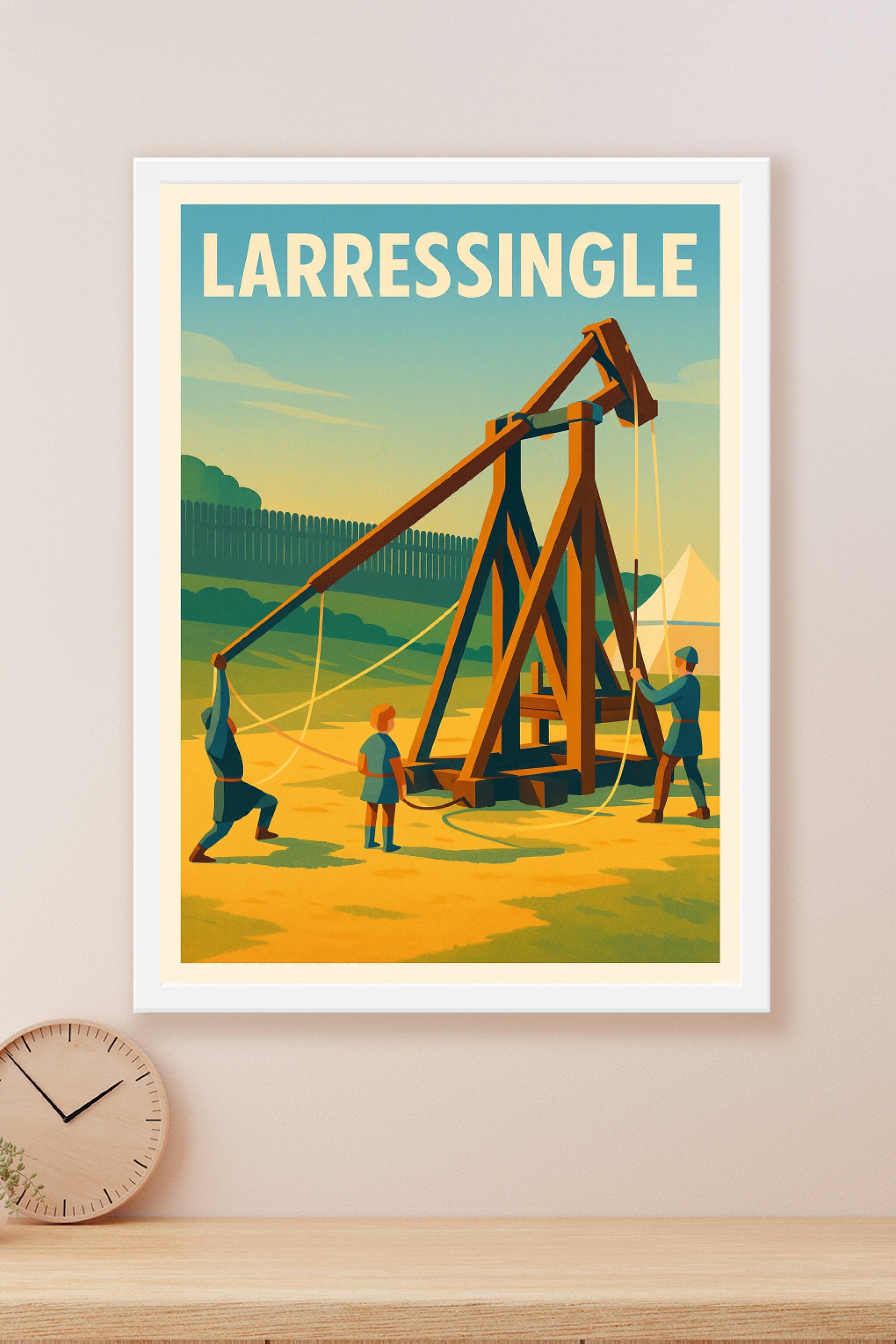 Découvrez l'atmosphère unique de Larressingle avec cette affiche illustrée mettant en scène un trébuchet, emblème de l'ingéniosité médiévale. Ce po...
