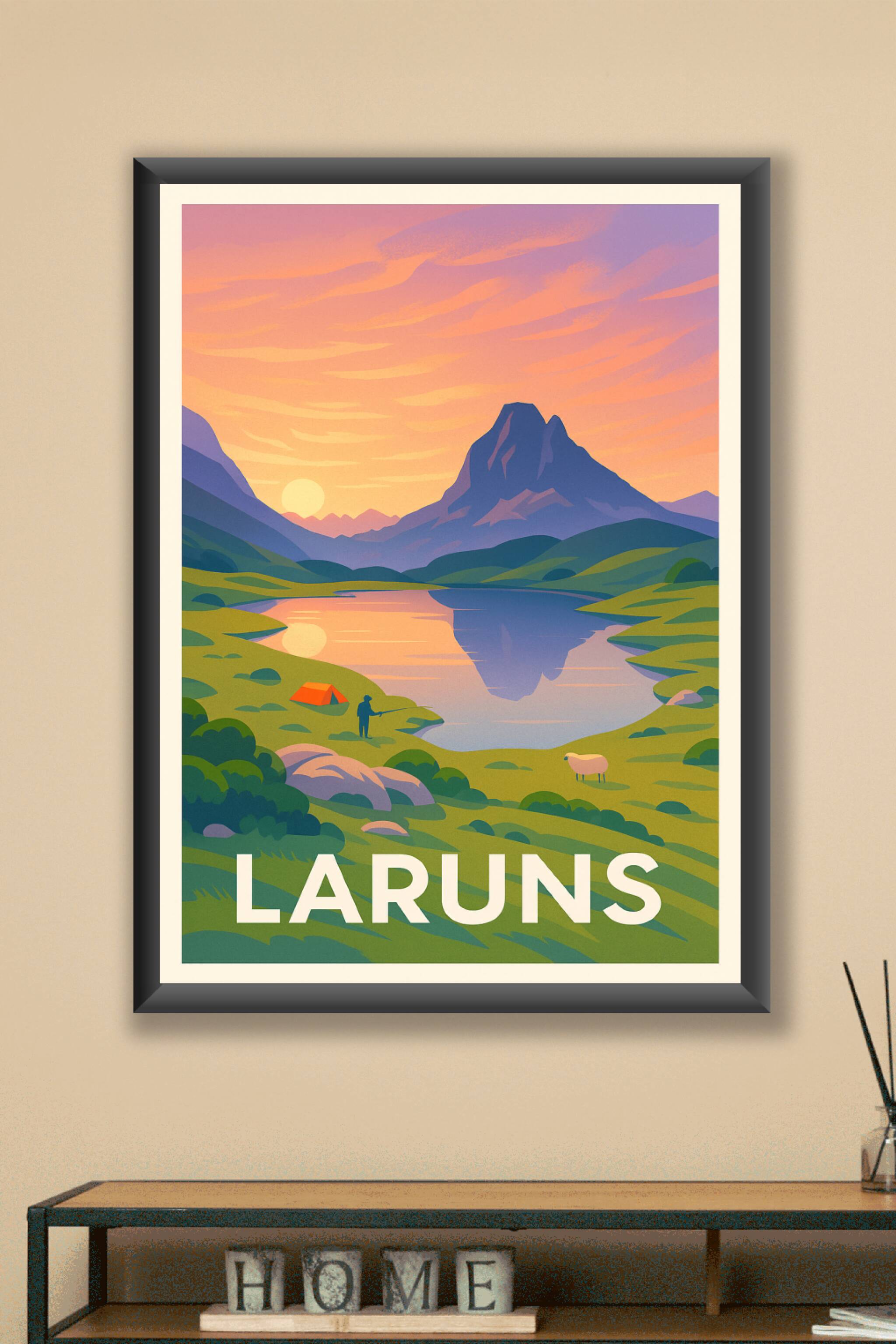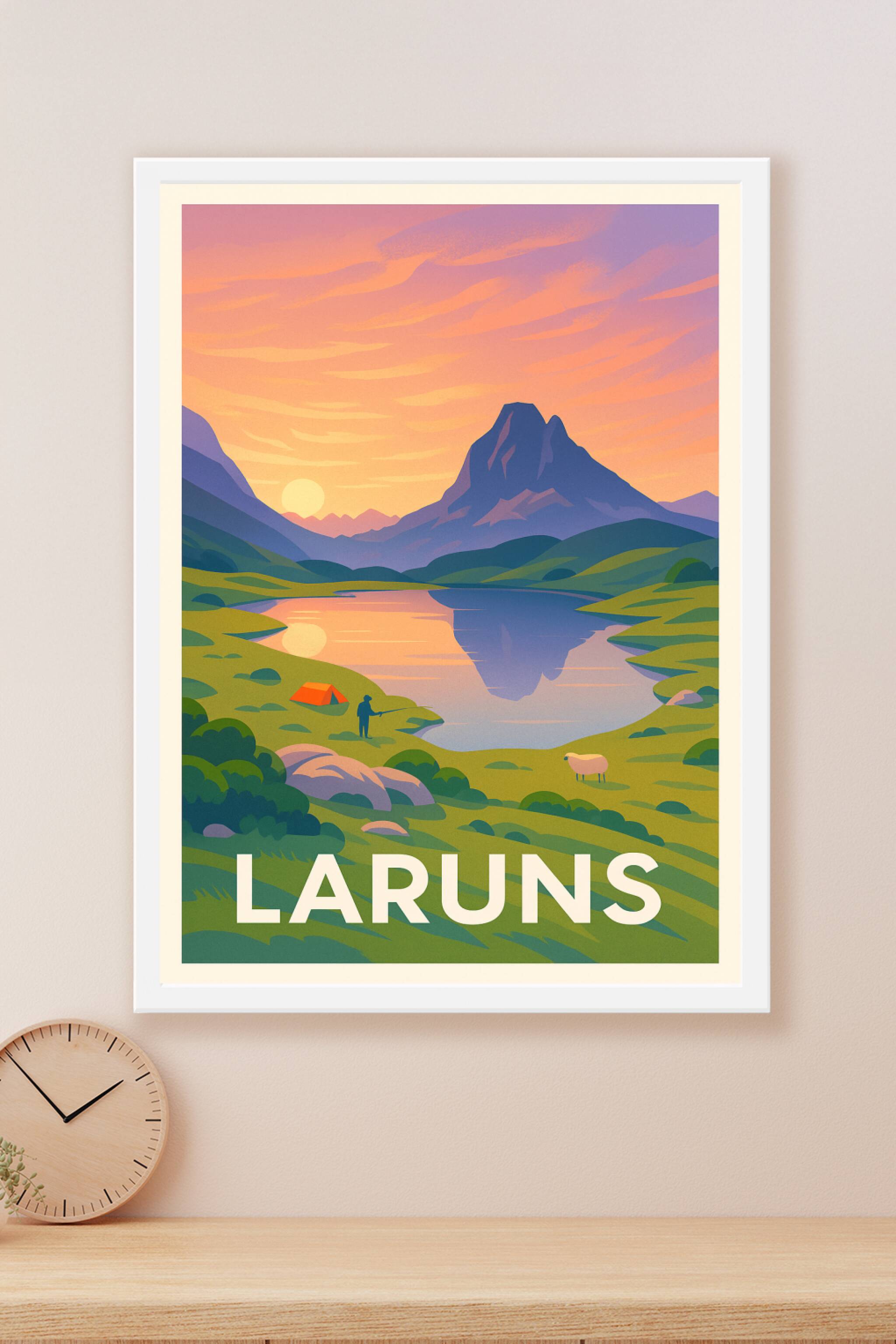 Découvrez cette superbe affiche illustrée qui capture la sérénité des montagnes de Laruns au coucher du soleil. Ce poster met en scène un paysage n...