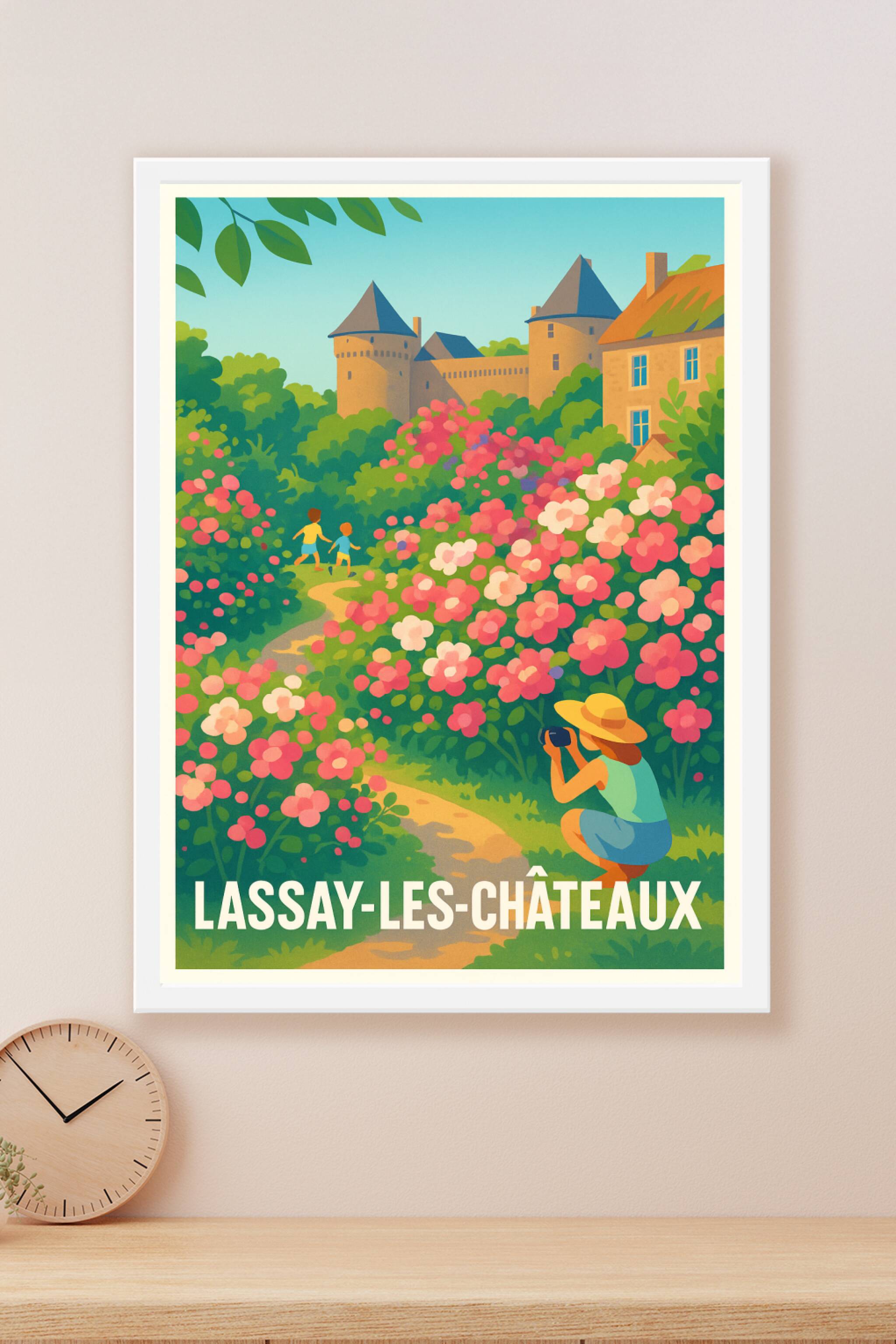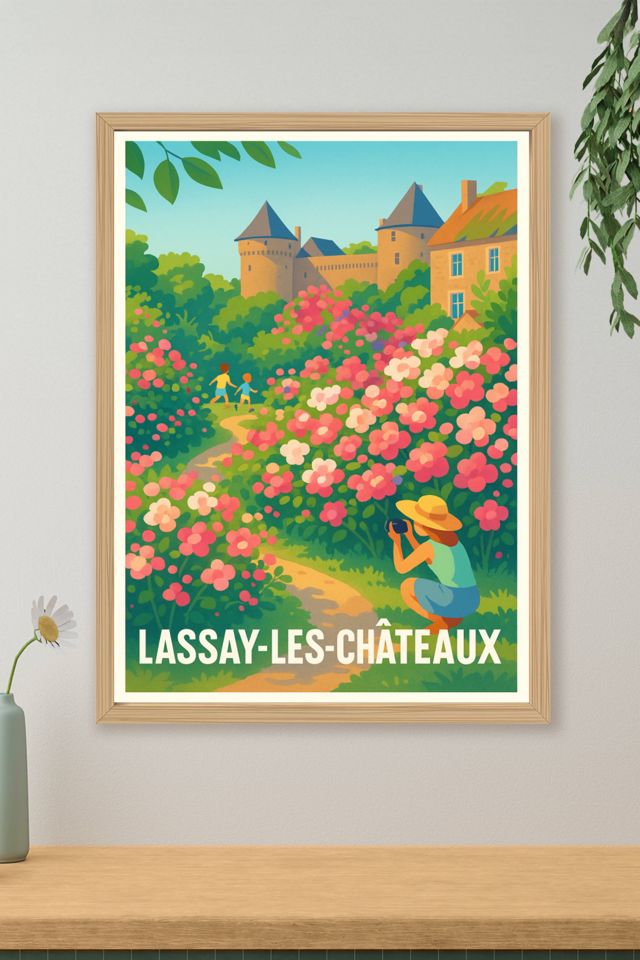 Découvrez la douceur et la beauté de Lassay-les-Châteaux avec cette affiche illustrée qui met en scène un paysage fleuri et enchanteur, dominé par ...