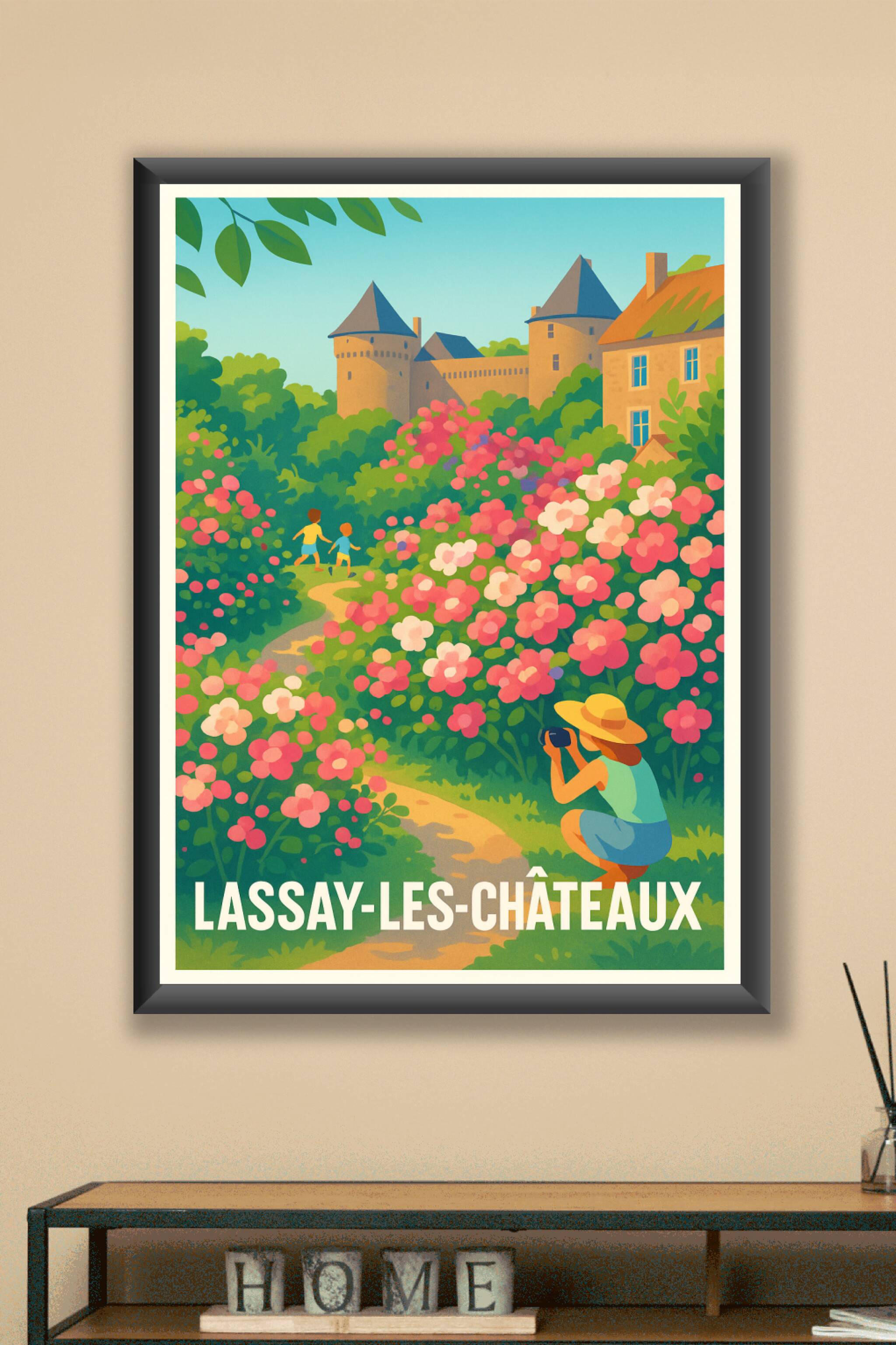 Découvrez la douceur et la beauté de Lassay-les-Châteaux avec cette affiche illustrée qui met en scène un paysage fleuri et enchanteur, dominé par le charme des châteaux historiques. Ce poster capture une ambiance bucolique, idéale pour apporter une touche d'élégance et de sérénité à votre décoration intérieure. Imprimée en tirage "Fine Art" sur un papier 305g coton haut de gamme, cette affiche garantit des couleurs éclatantes et une excellente longévité. Disponible en formats A1 à A4, avec ou sans cadre, elle s'adapte parfaitement à tous vos espaces, que ce soit pour décorer votre salon, bureau ou offrir un cadeau unique. Profitez d'une impression premium 100% fabriquée en France pour sublimer votre intérieur avec ce magnifique poster de Lassay-les-Châteaux.