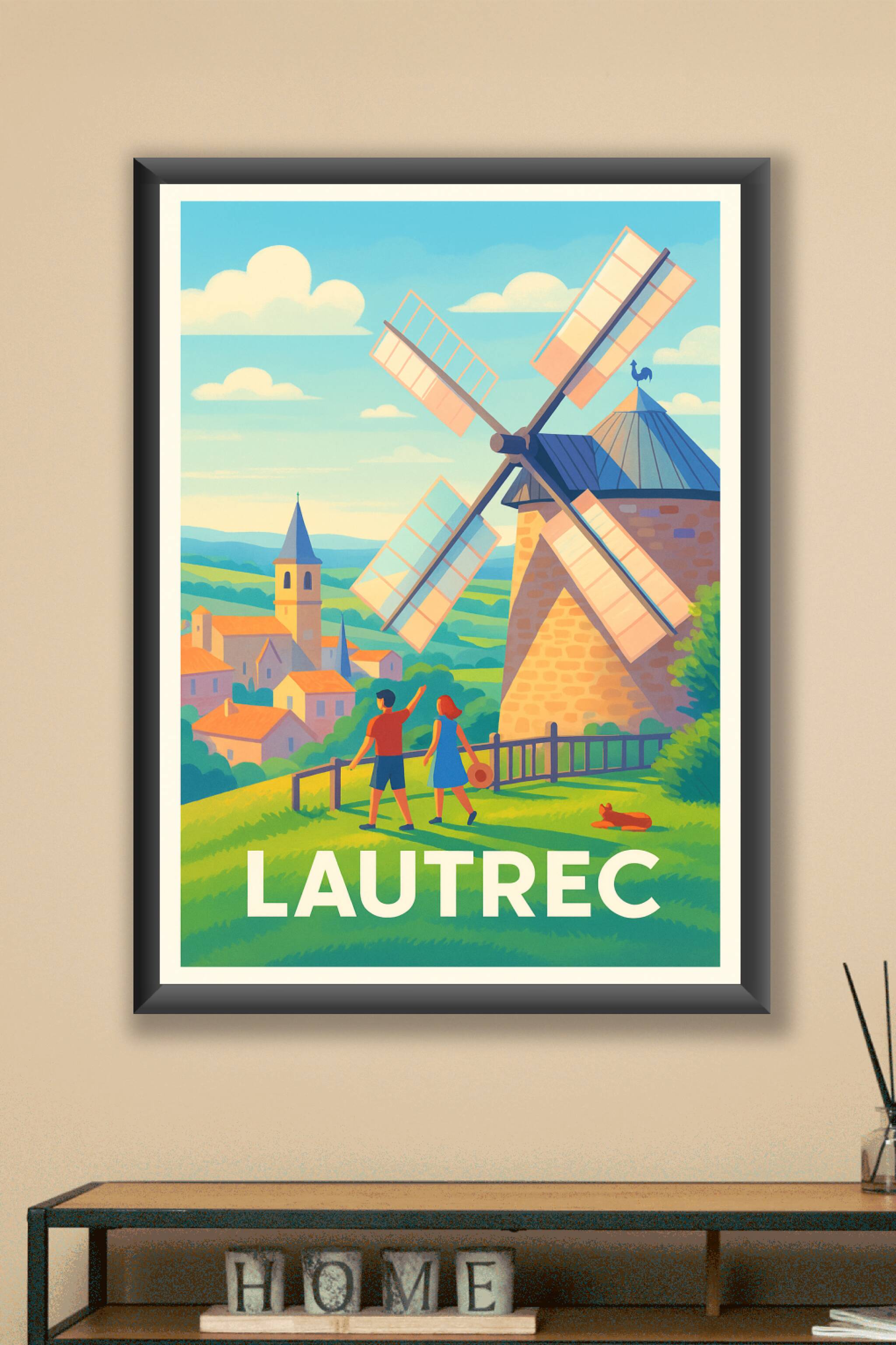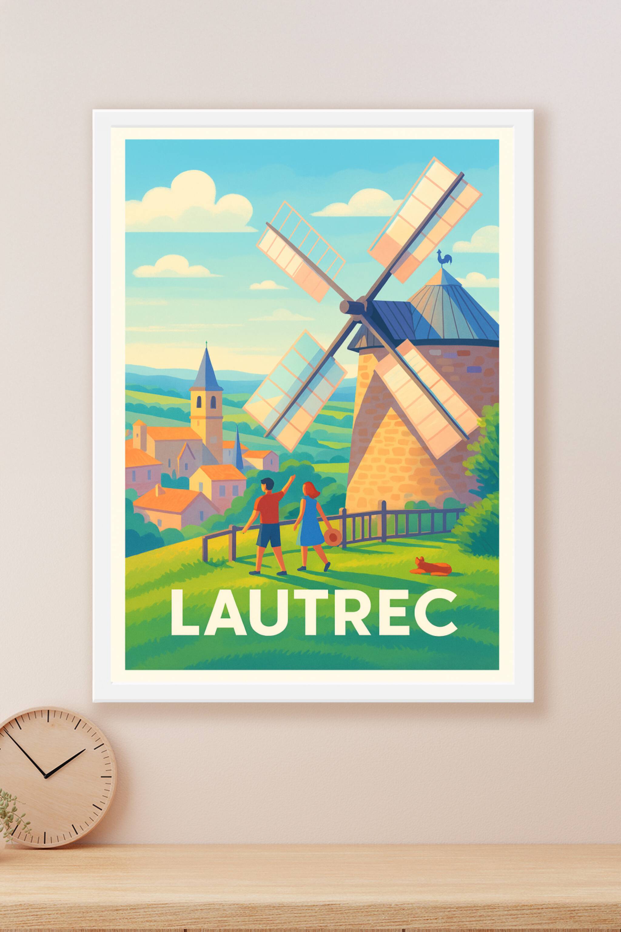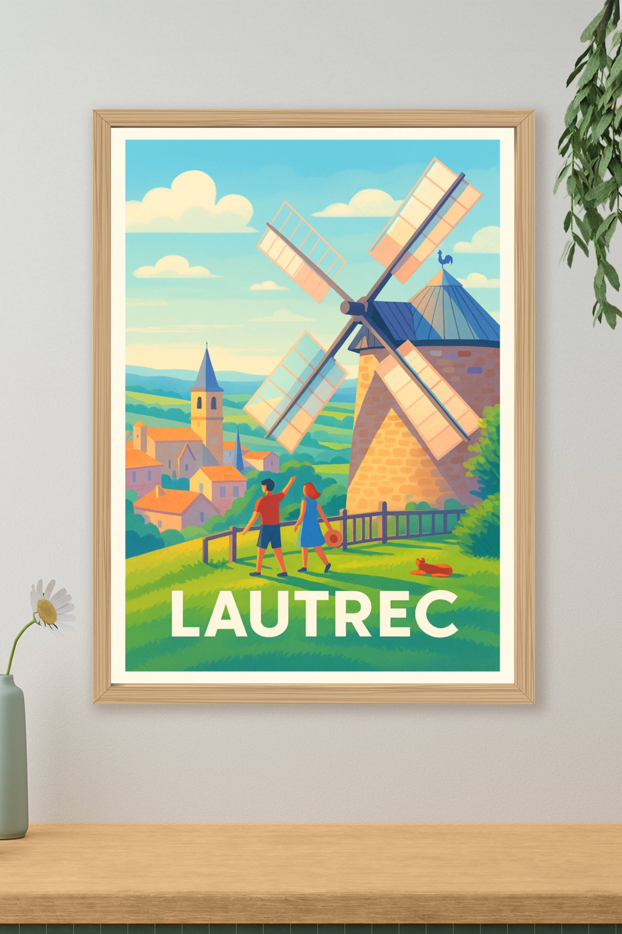 Découvrez Lautrec, un village plein de charme et d'histoire, illustré ici par une scène mémorable mettant en avant son moulin emblématique et ses douces collines verdoyantes. Cette affiche poster, au style lumineux et coloré, capture la sérénité et la beauté typique de la campagne française.Ce poster est imprimé en tirage "Fine Art" sur papier 305g coton, garantissant une qualité d'impression exceptionnelle et des couleurs éclatantes. Disponible en formats A1 à A4, avec ou sans cadre, il s'adapte parfaitement à votre intérieur pour une décoration chaleureuse et authentique. Profitez d'une fabrication 100% française pour offrir ou conserver un souvenir raffiné, idéal pour les amoureux des villages pittoresques et des atmosphères paisibles.