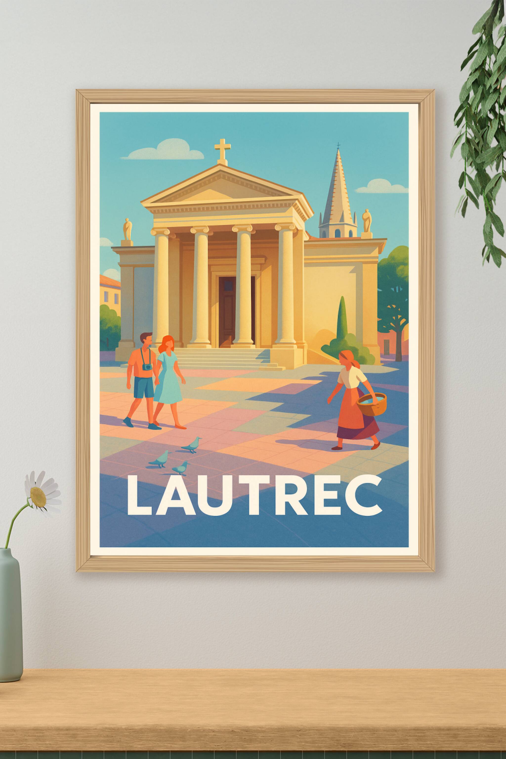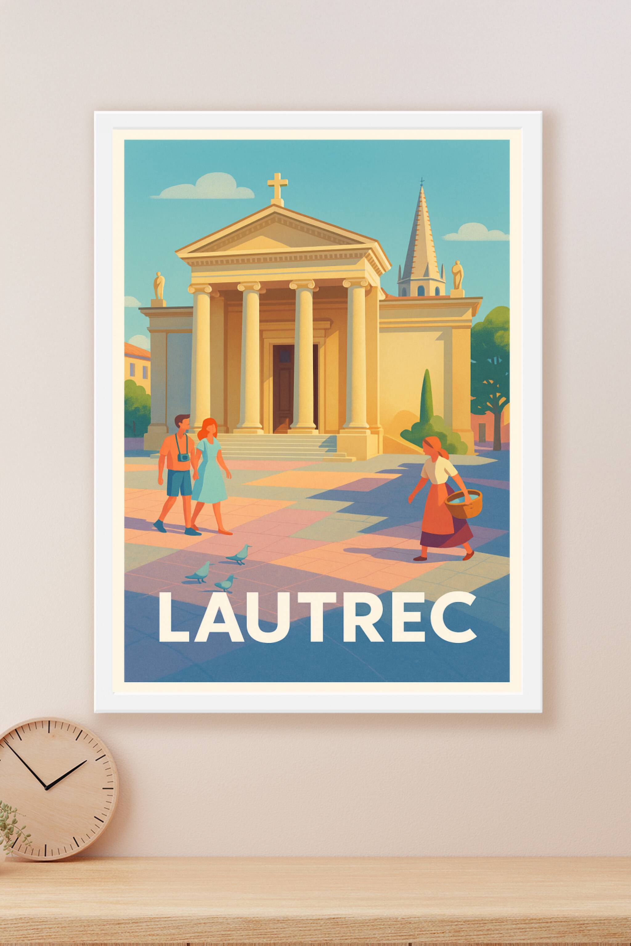 Découvrez l'ambiance paisible et ensoleillée de Lautrec avec cette affiche au style illustratif doux et chaleureux. Le poster met en avant l'archit...