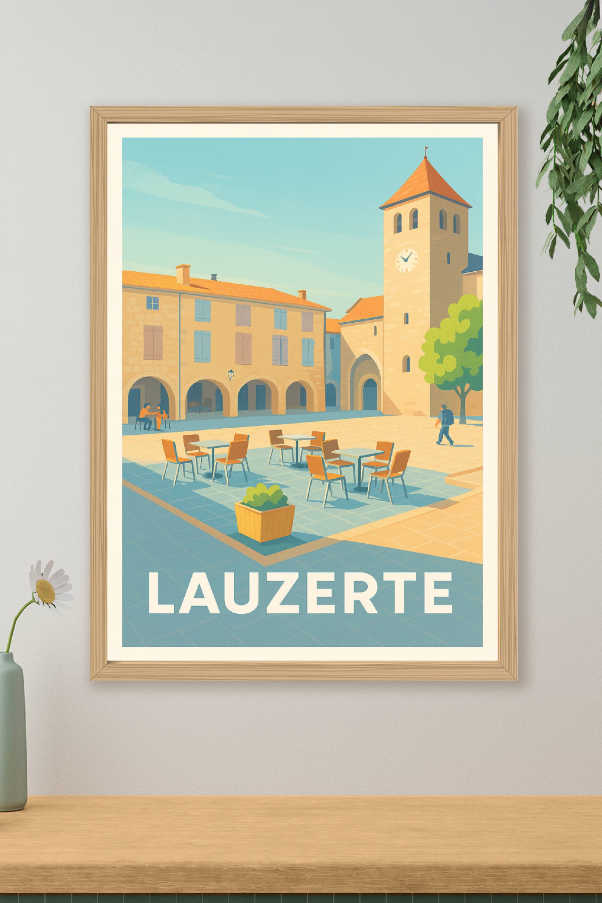 Découvrez l'élégance intemporelle de Lauzerte avec cette affiche illustrée mettant en scène la place centrale baignée de lumière et ses arcades his...