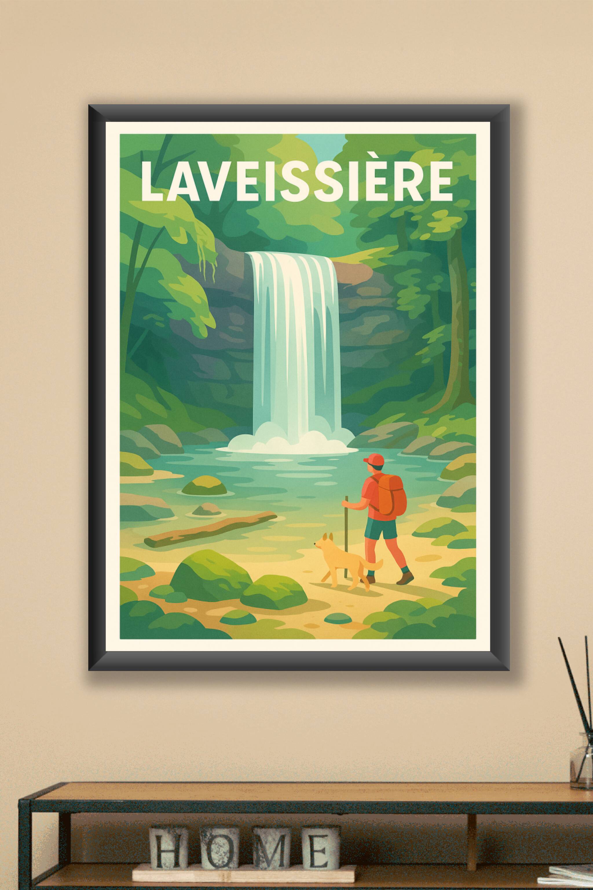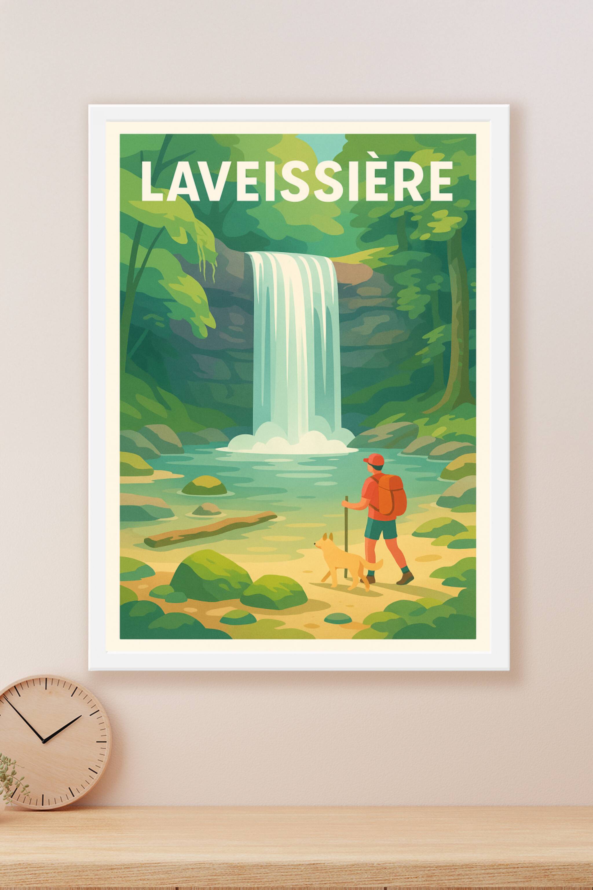 Découvrez la beauté sauvage de Laveissière à travers cette affiche illustrée mettant en scène une cascade majestueuse entourée de verdure luxuriant...