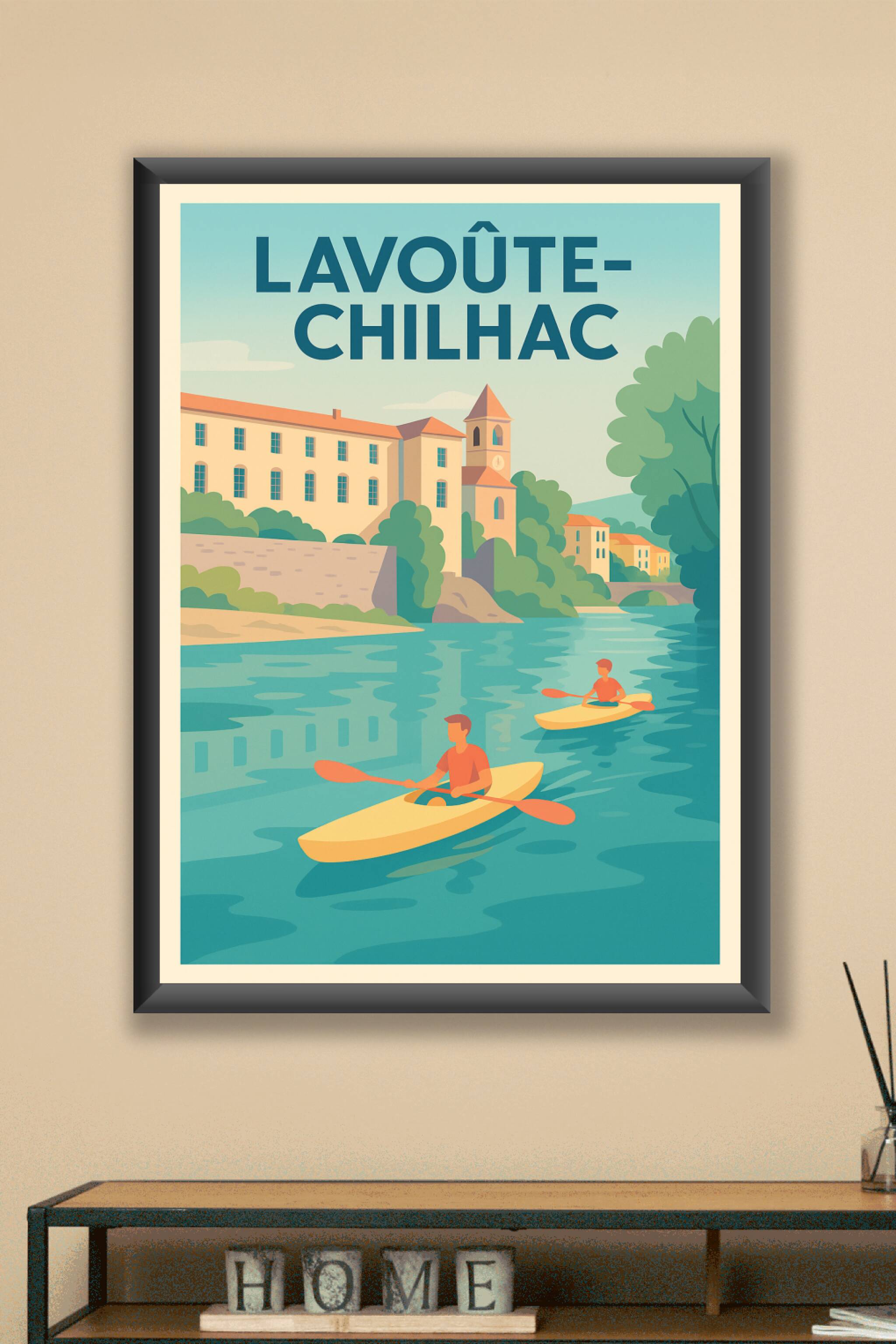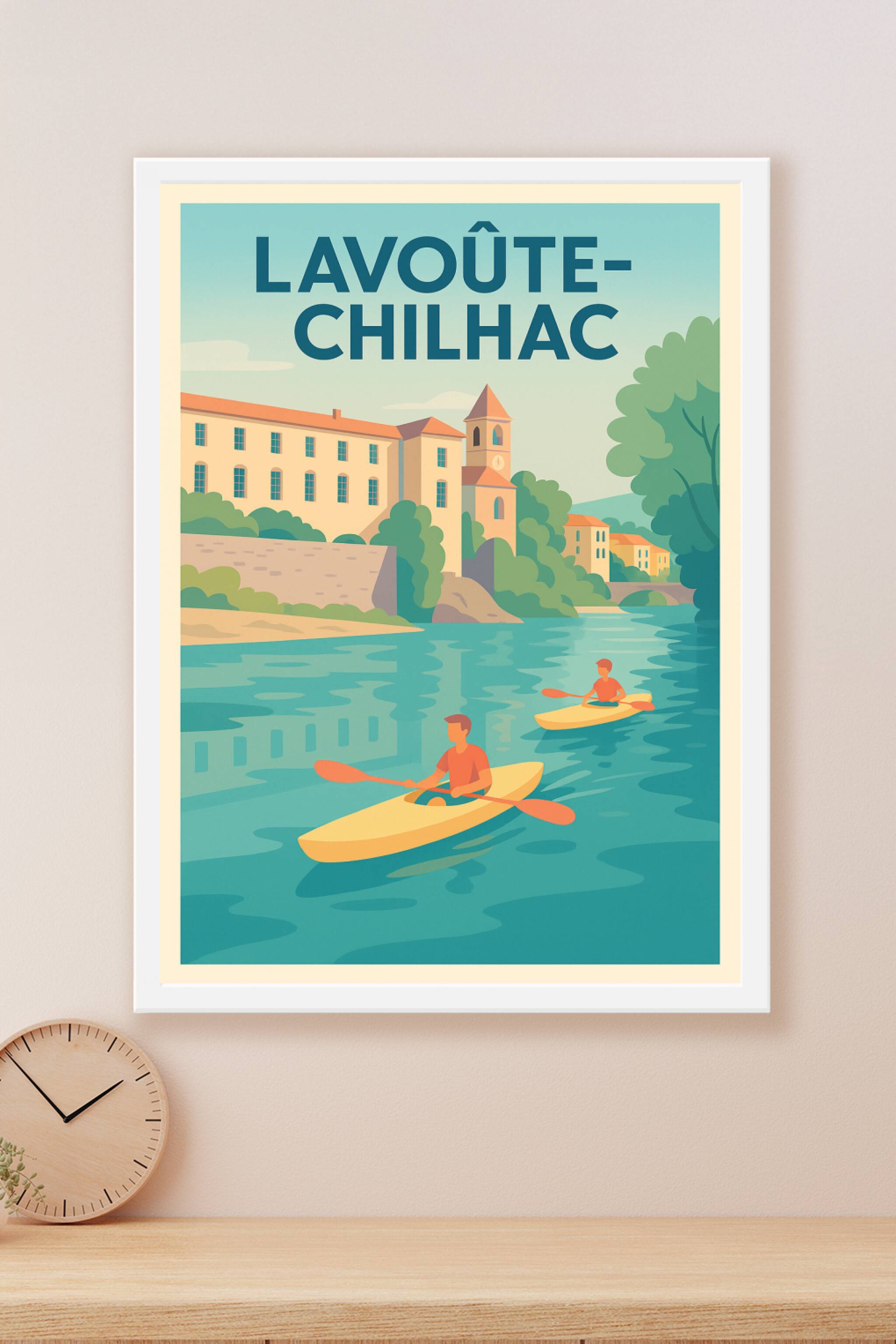 Découvrez l'ambiance paisible et naturelle de Lavoûte-Chilhac à travers cette affiche au design épuré et coloré. Les eaux calmes de la rivière et l...
