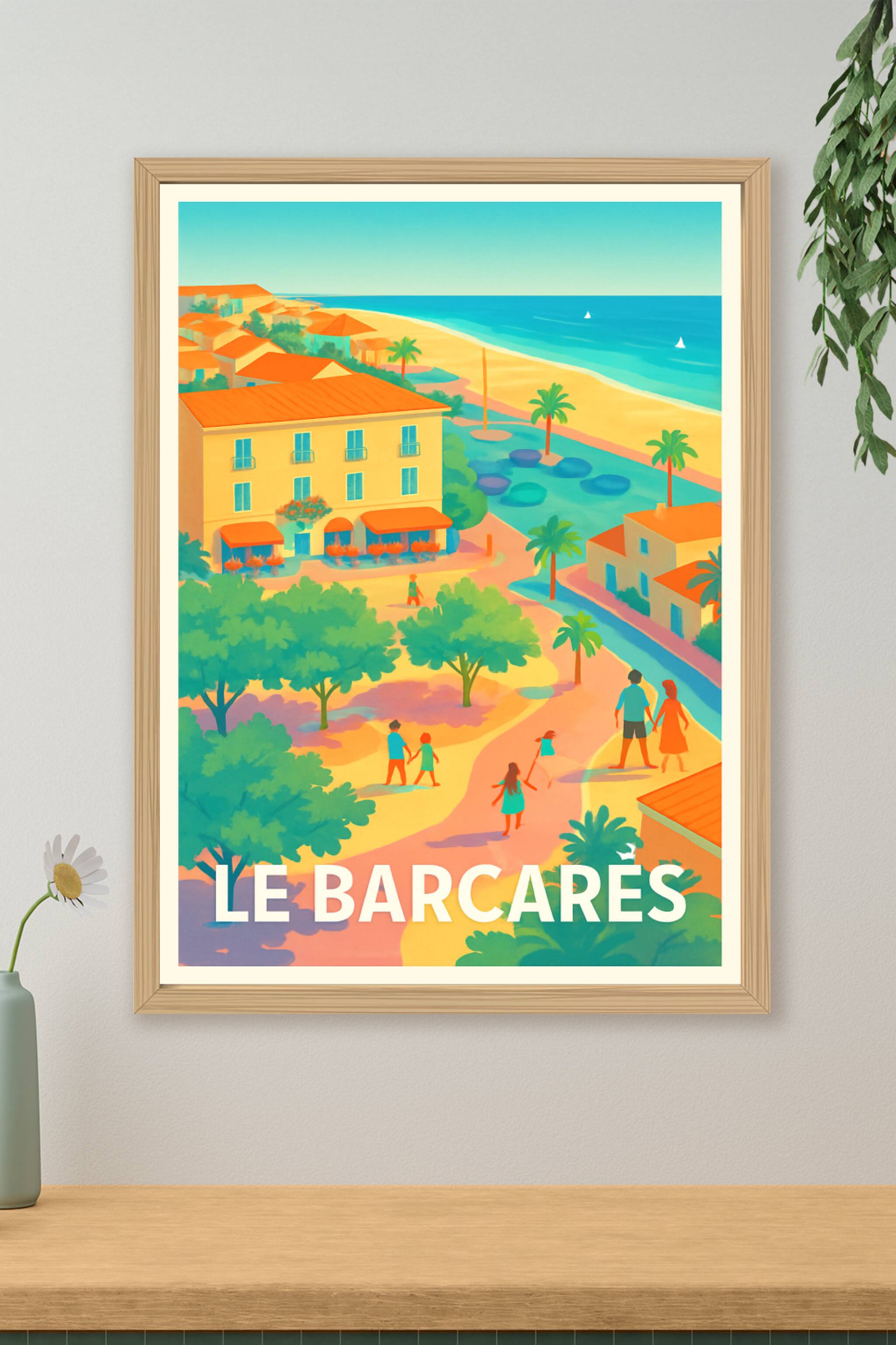 Découvrez l'ambiance chaleureuse et estivale du Barcarès avec cette affiche illustrée d'un paysage baigné de lumière et de couleurs vibrantes. Cette scène invite à la détente sur la côte méditerranéenne, entre plages dorées, maisons aux toits rouges et palmiers, parfait pour évoquer vos souvenirs de vacances ou rêver d'évasion.Ce poster est imprimé en tirage "Fine Art" sur un papier 305g coton, garantissant une qualité d'impression exceptionnelle et un rendu des couleurs éclatant. Disponible en formats A1, A2, A3 et A4, avec ou sans cadre selon votre préférence, cette affiche apporte une touche de fraîcheur et de douceur à votre décoration d'intérieur.Profitez d'une finition premium 100% fabriquée en France pour embellir votre espace ou offrir un cadeau raffiné aux amoureux du Sud.