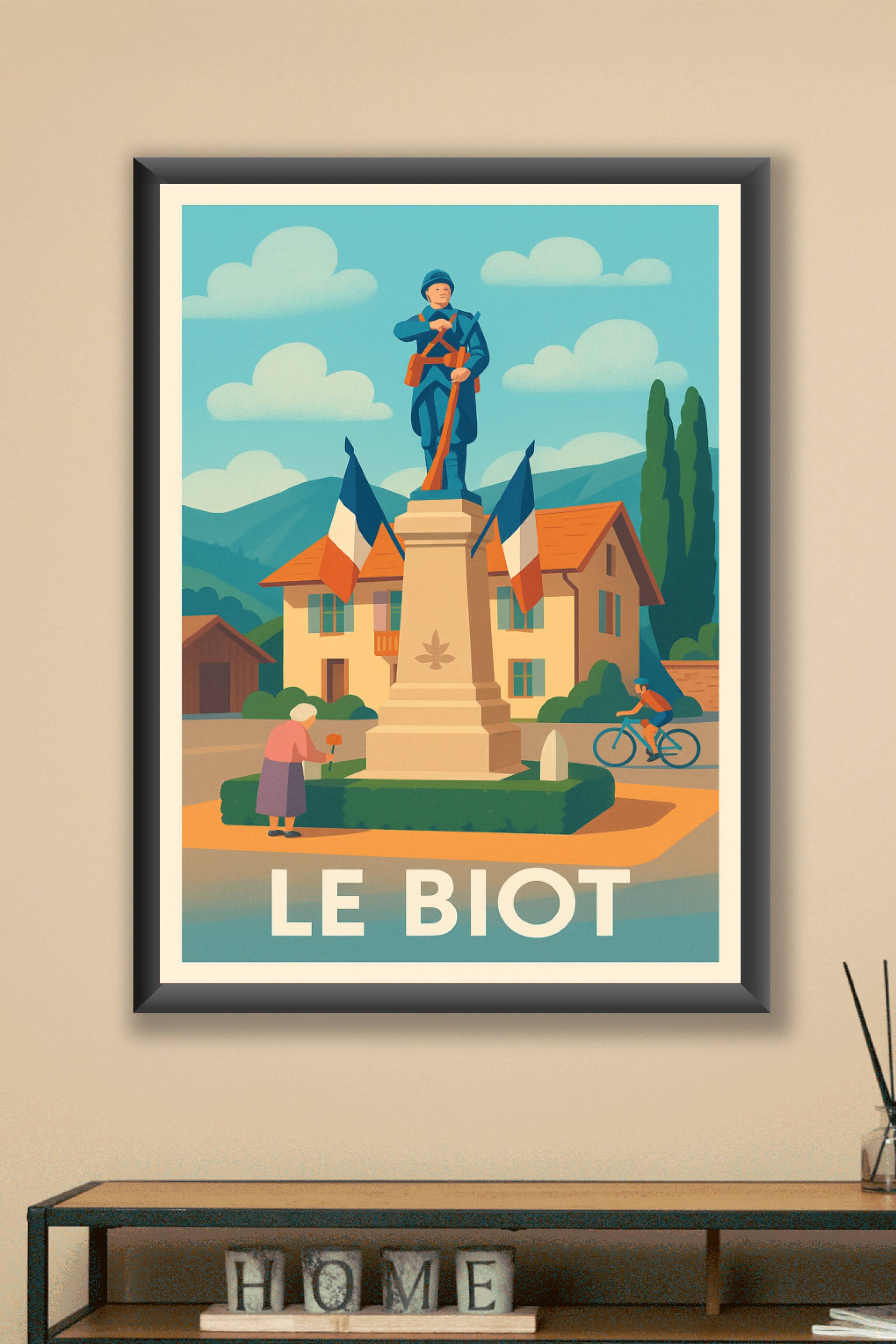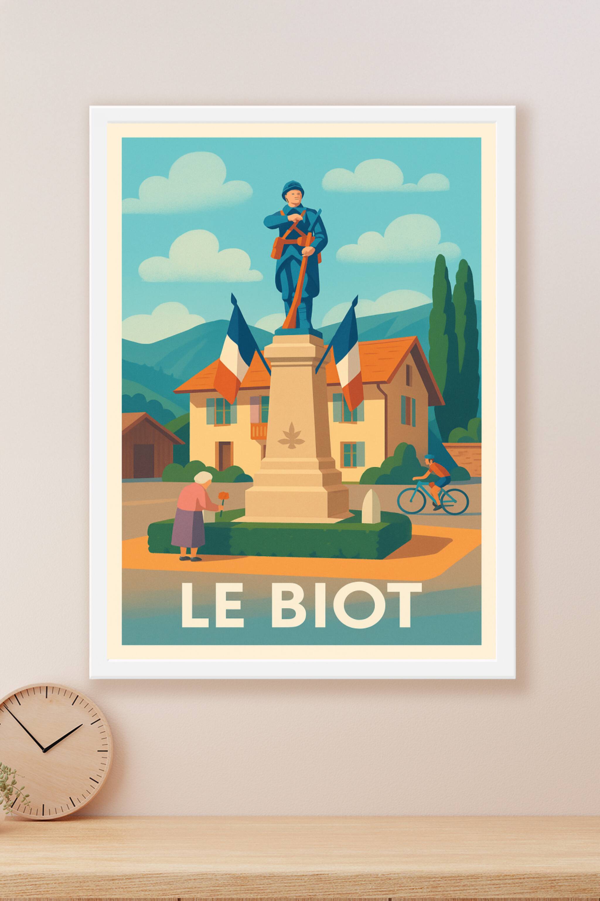 Découvrez le charme intemporel du village de Le Biot avec cette affiche illustrée dans un style rétro et doux. Représentant un monument aux morts e...