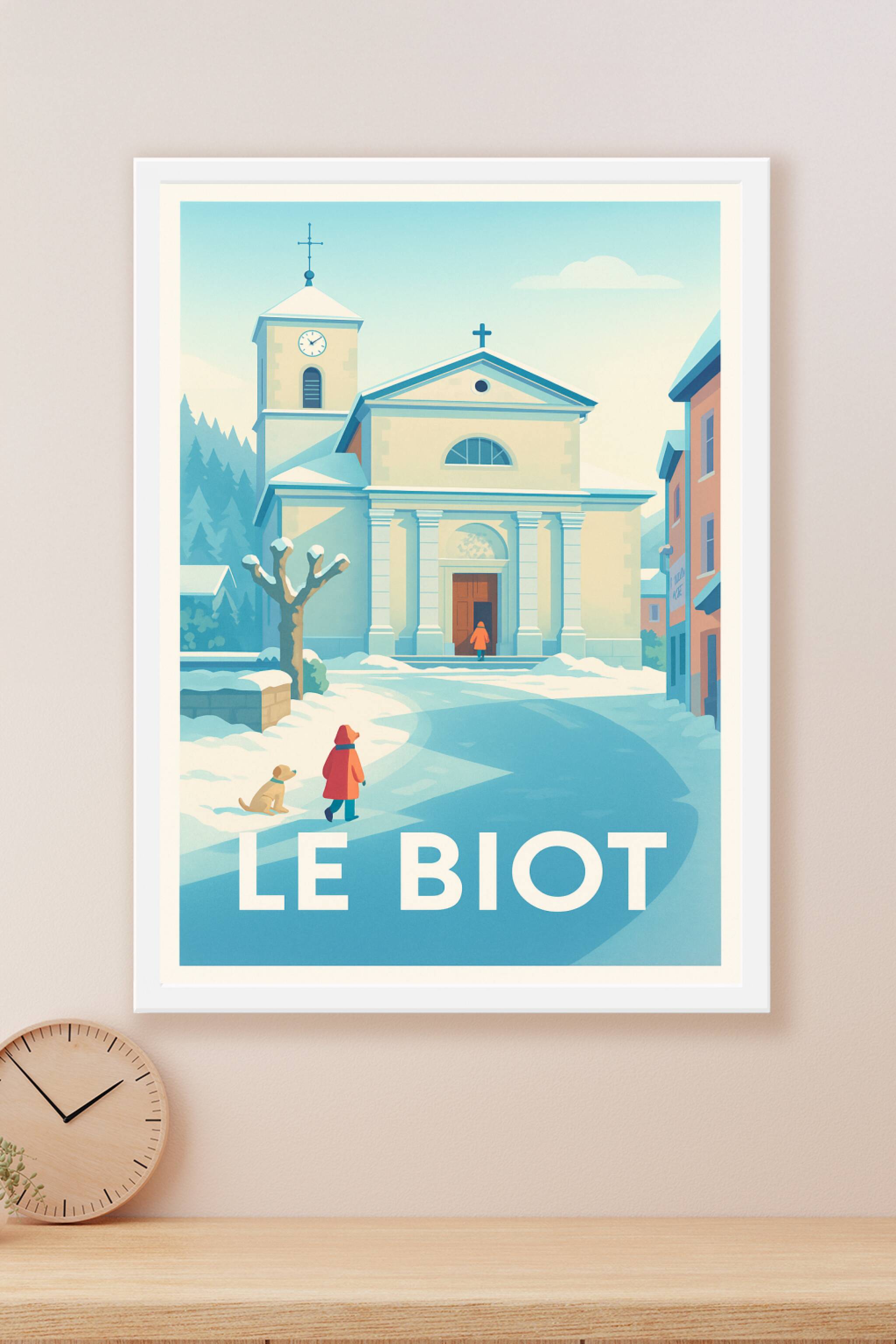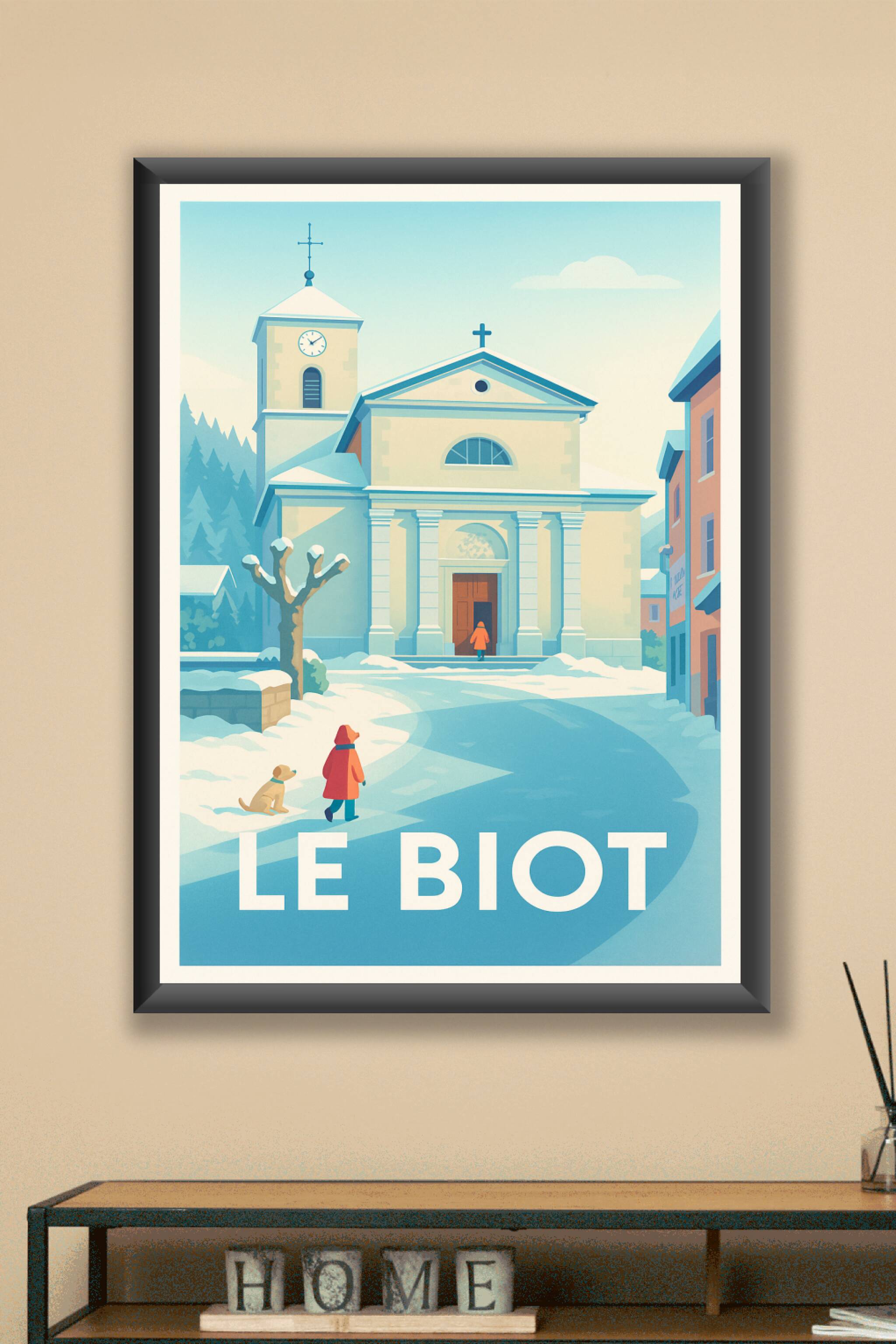 Découvrez la douce atmosphère hivernale de Le Biot avec cette affiche illustrée représentant l'église emblématique du village sous un manteau de ne...