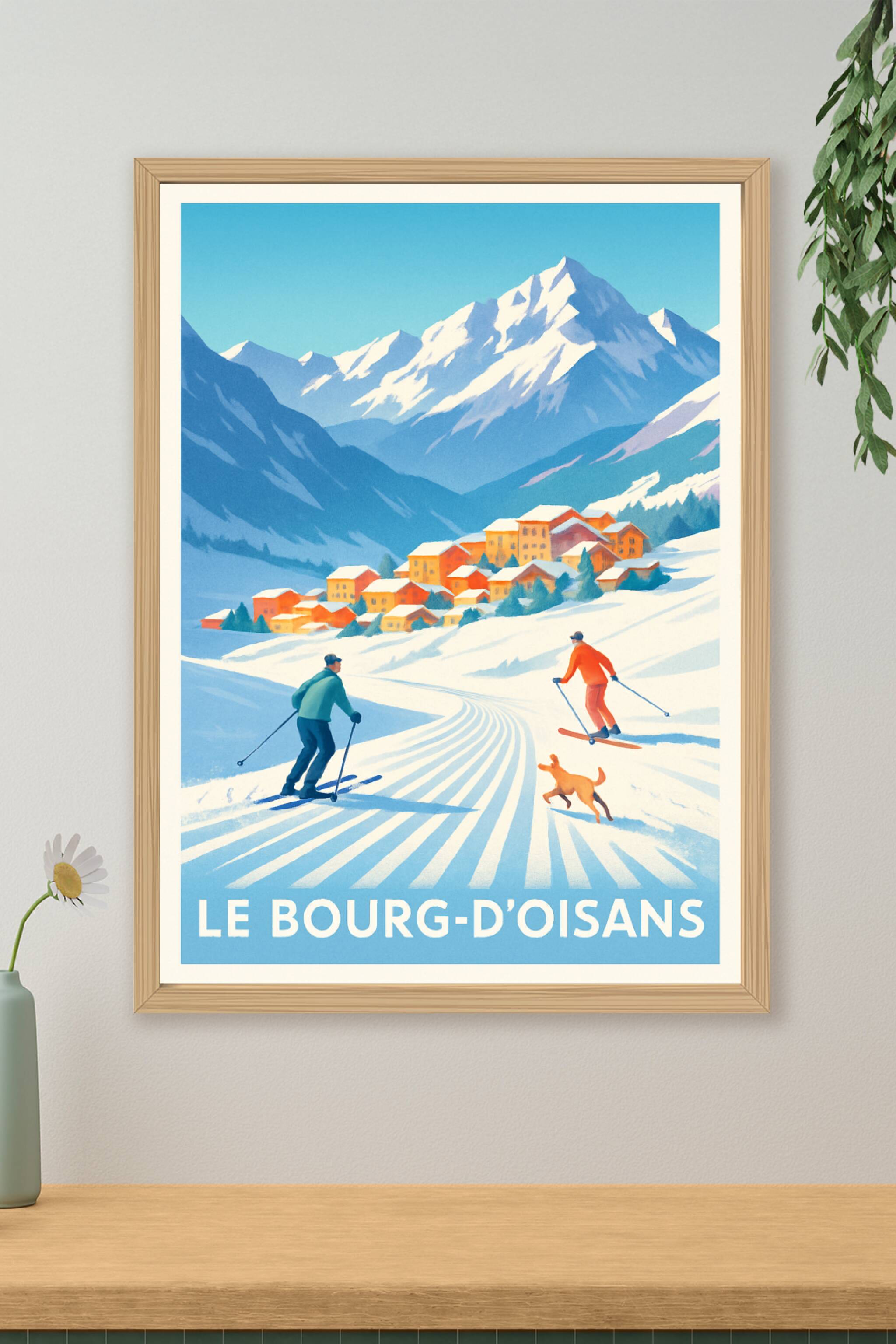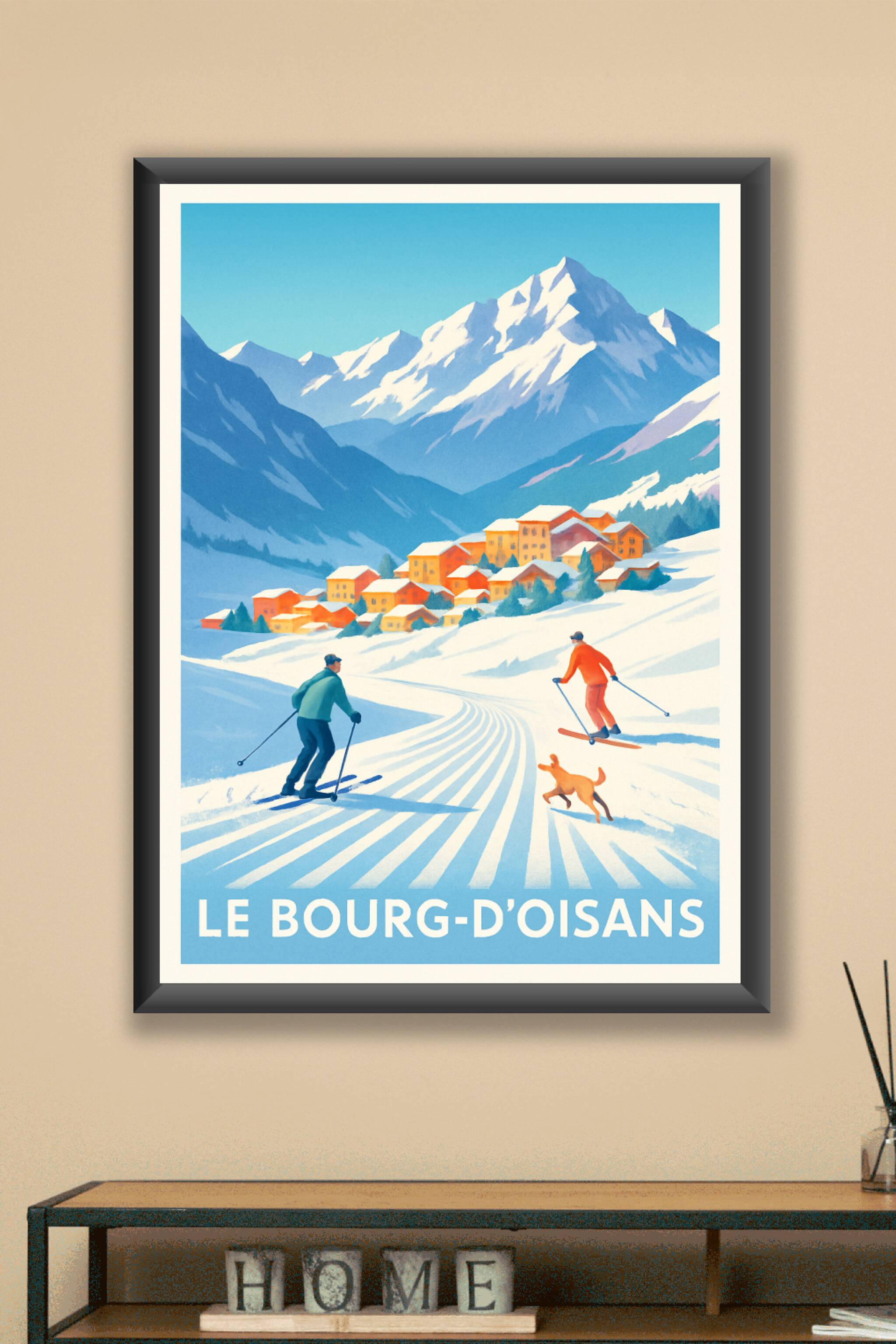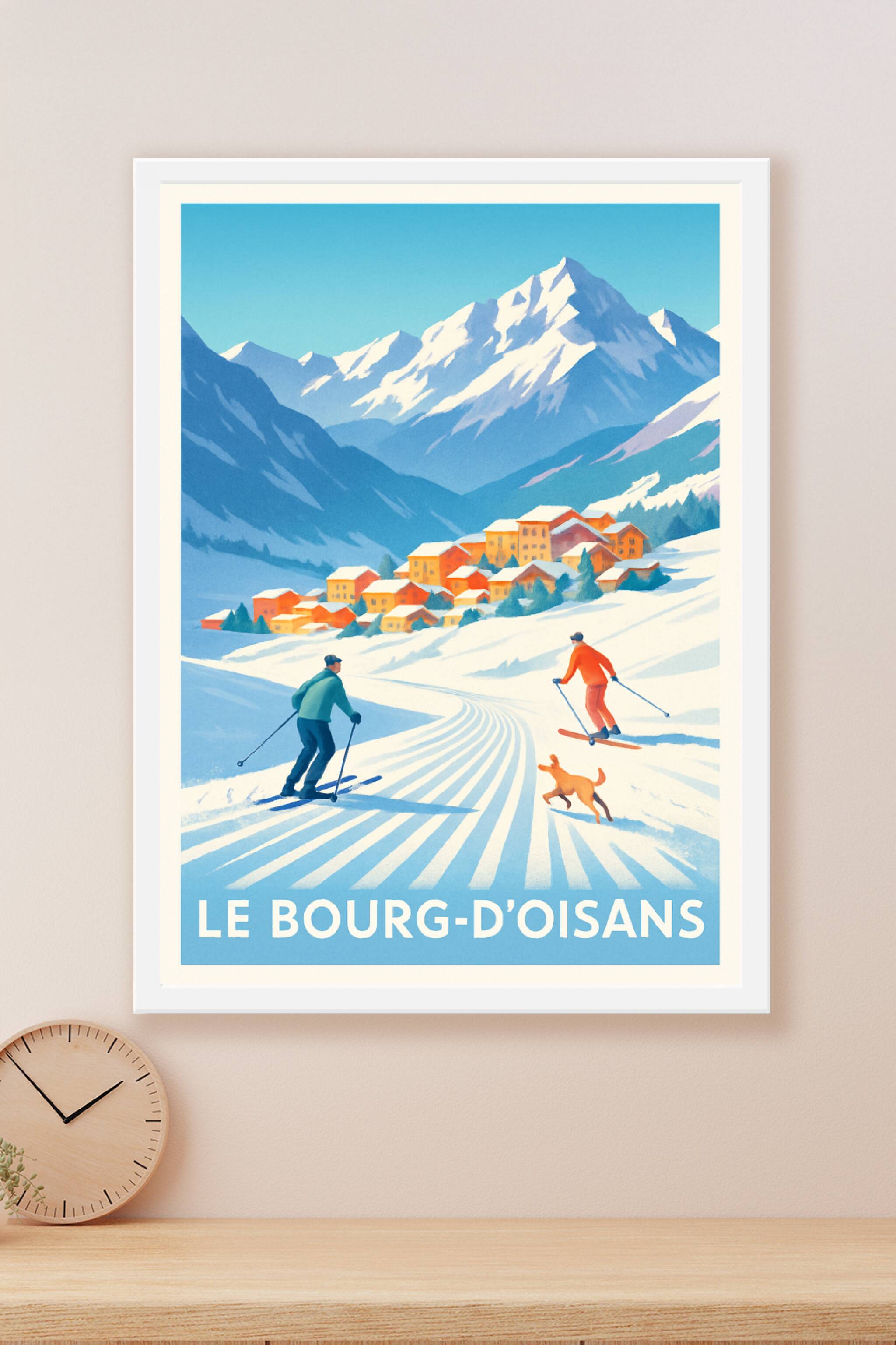 Découvrez la magie des paysages enneigés du Bourg-d'Oisans avec cette affiche au style vintage et chaleureux. Ce poster met en scène une scène de s...
