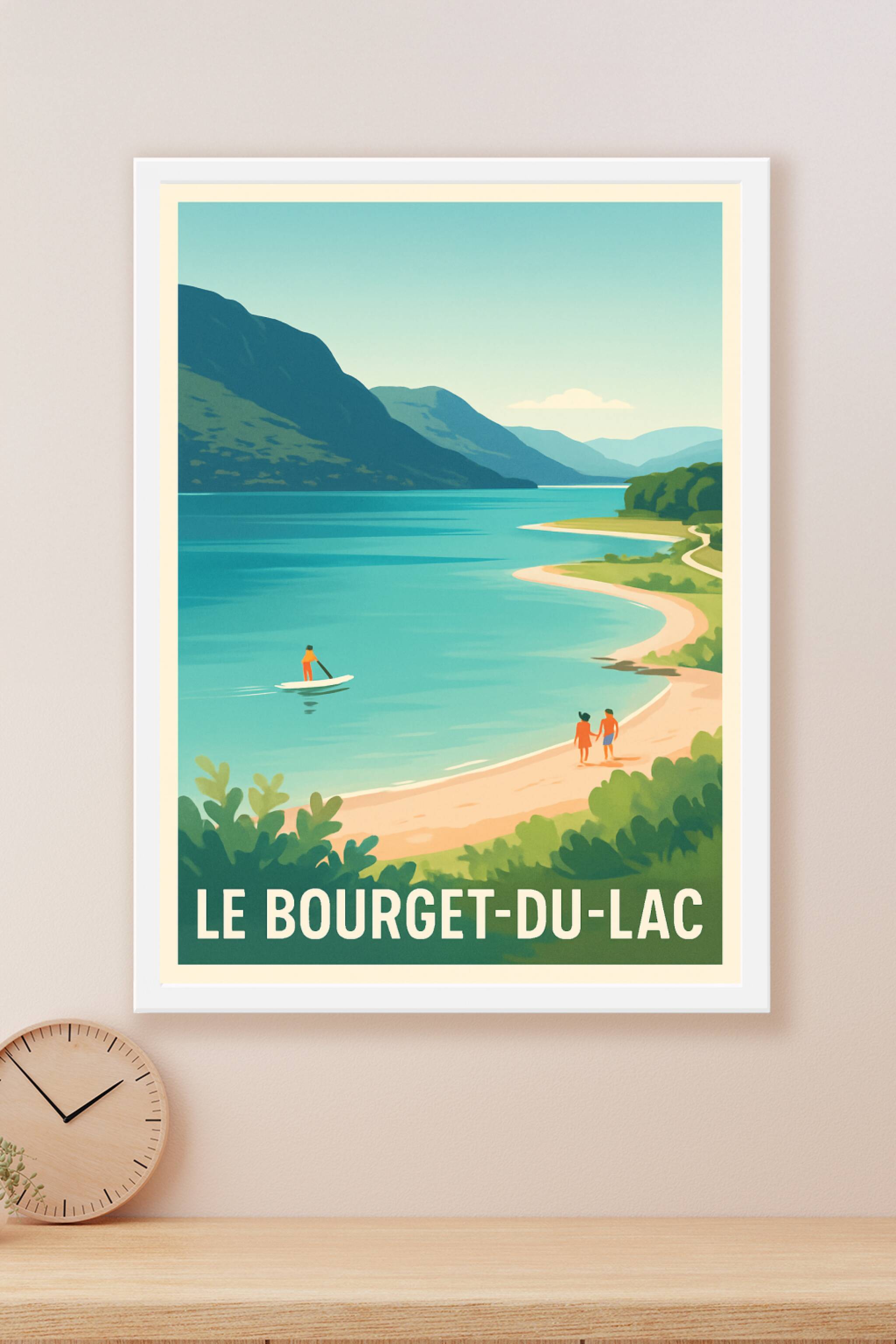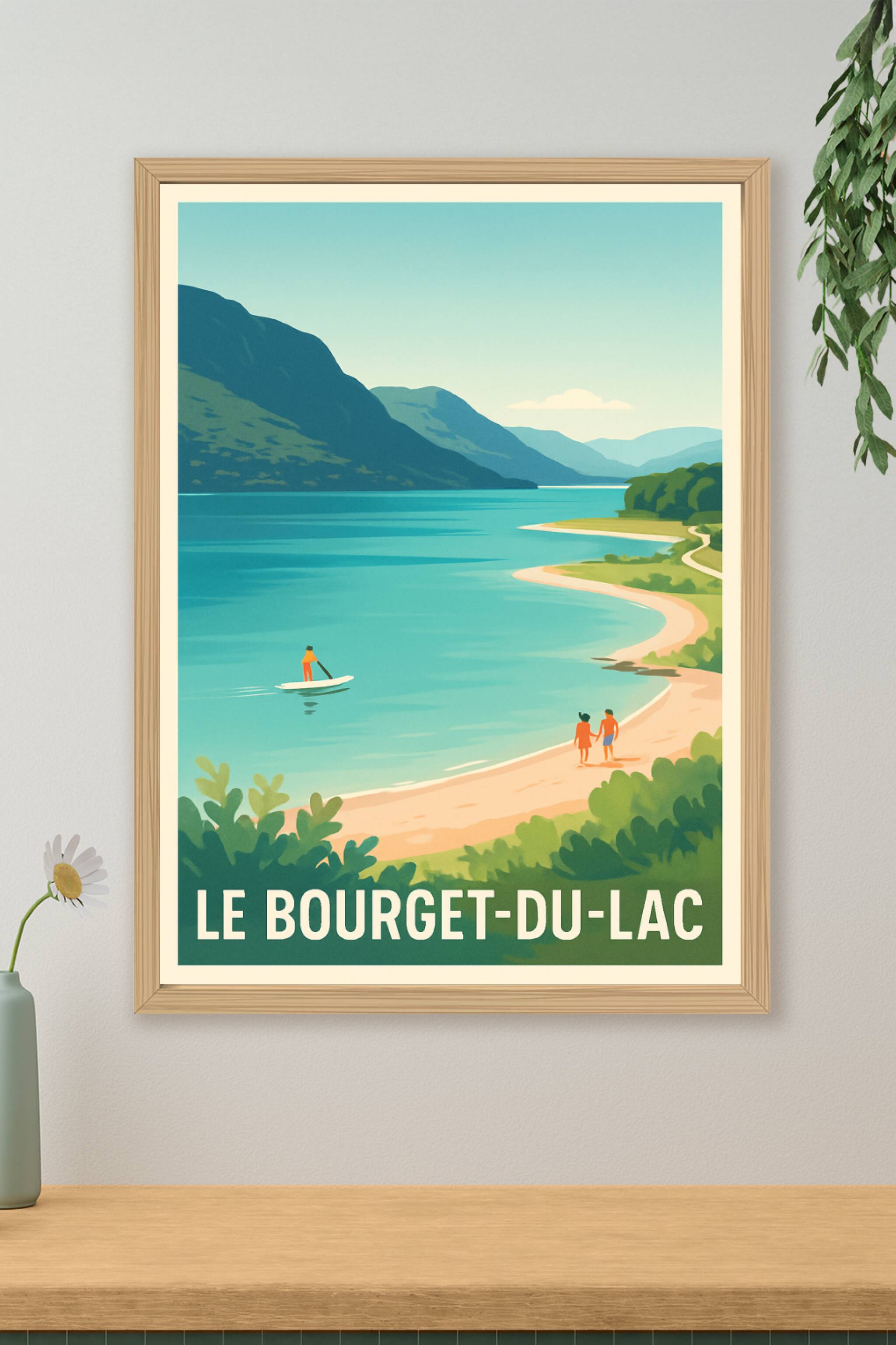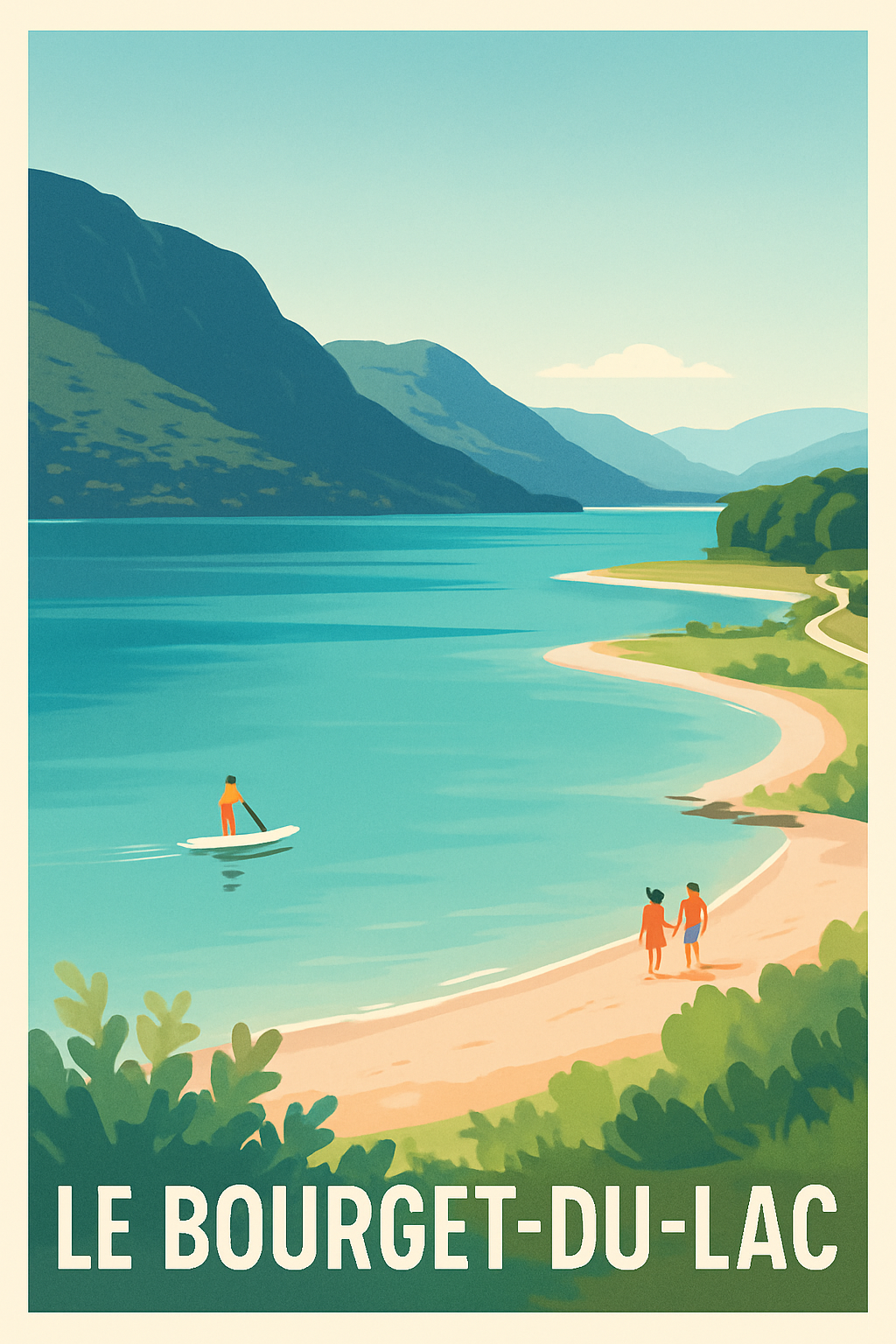 Découvrez la sérénité du lac du Bourget à travers cette affiche illustrée aux couleurs douces et estivales. Ce poster capture l'évasion tranquille ...