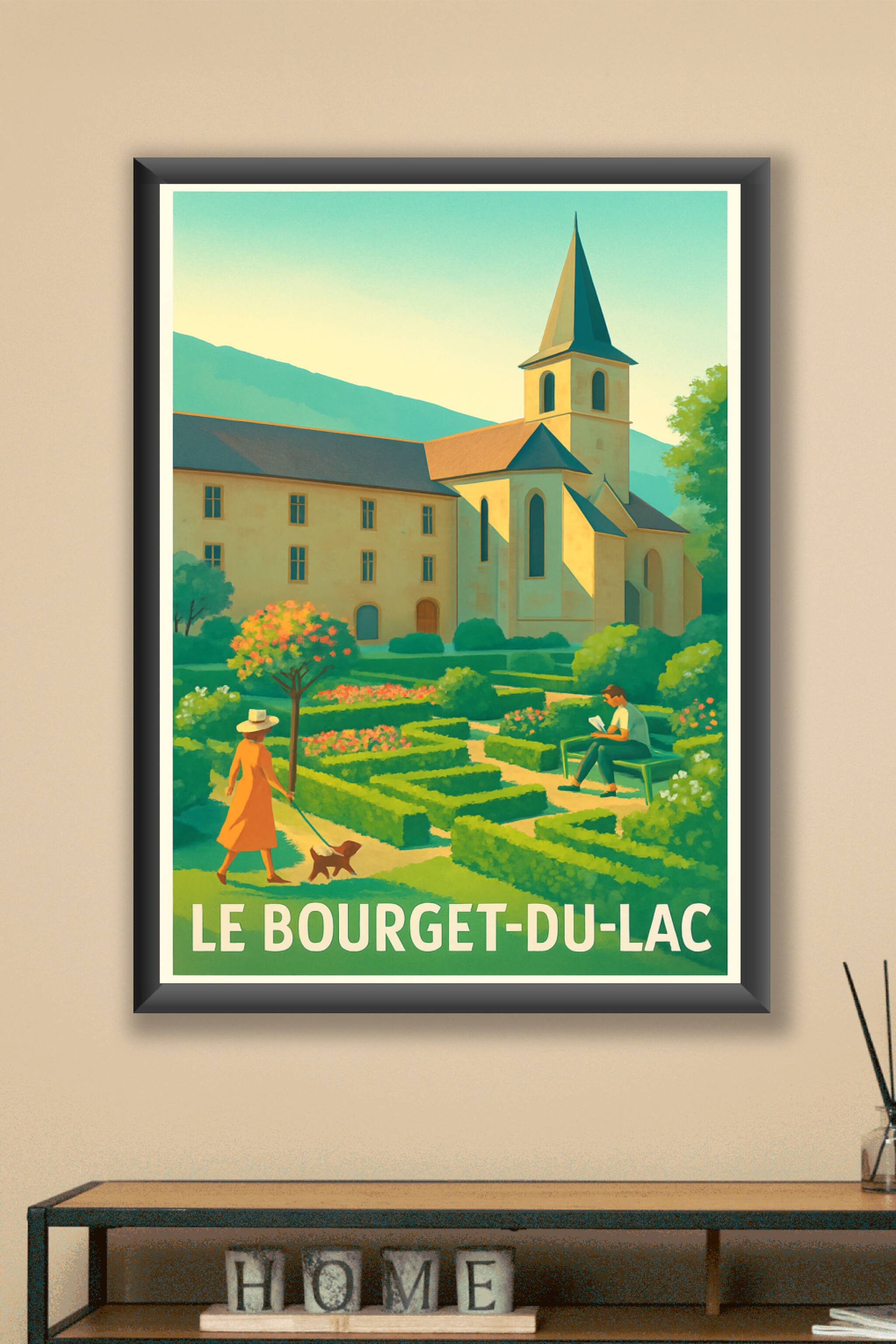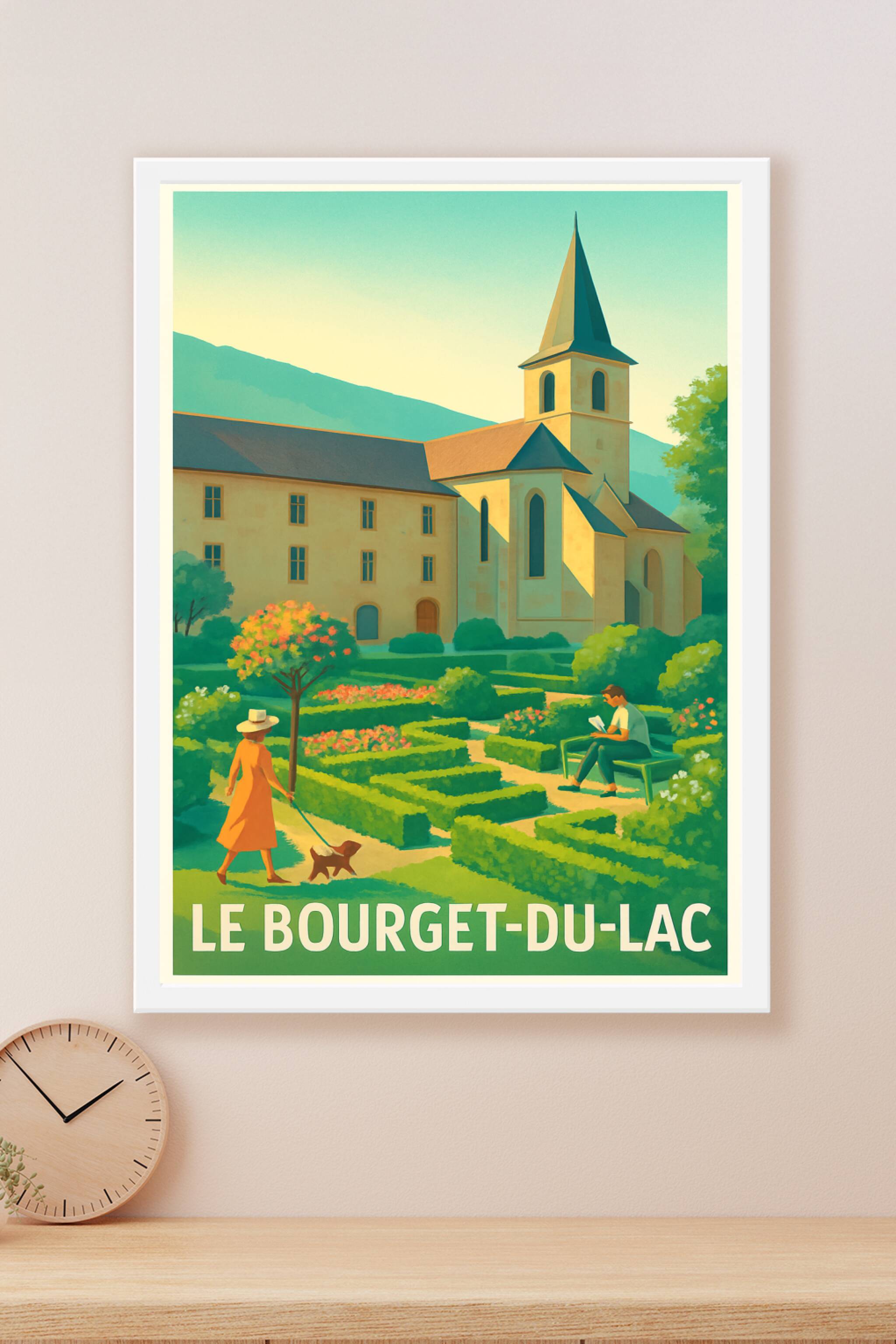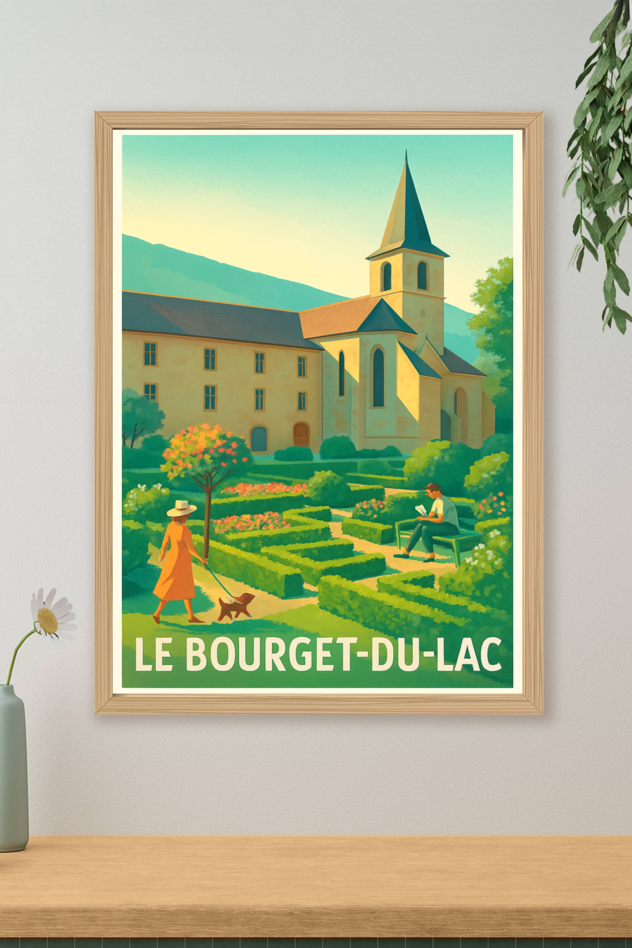 Découvrez le charme bucolique du Bourget-du-Lac avec cette magnifique affiche illustrée, mettant en scène un jardin à la française parfaitement tai...