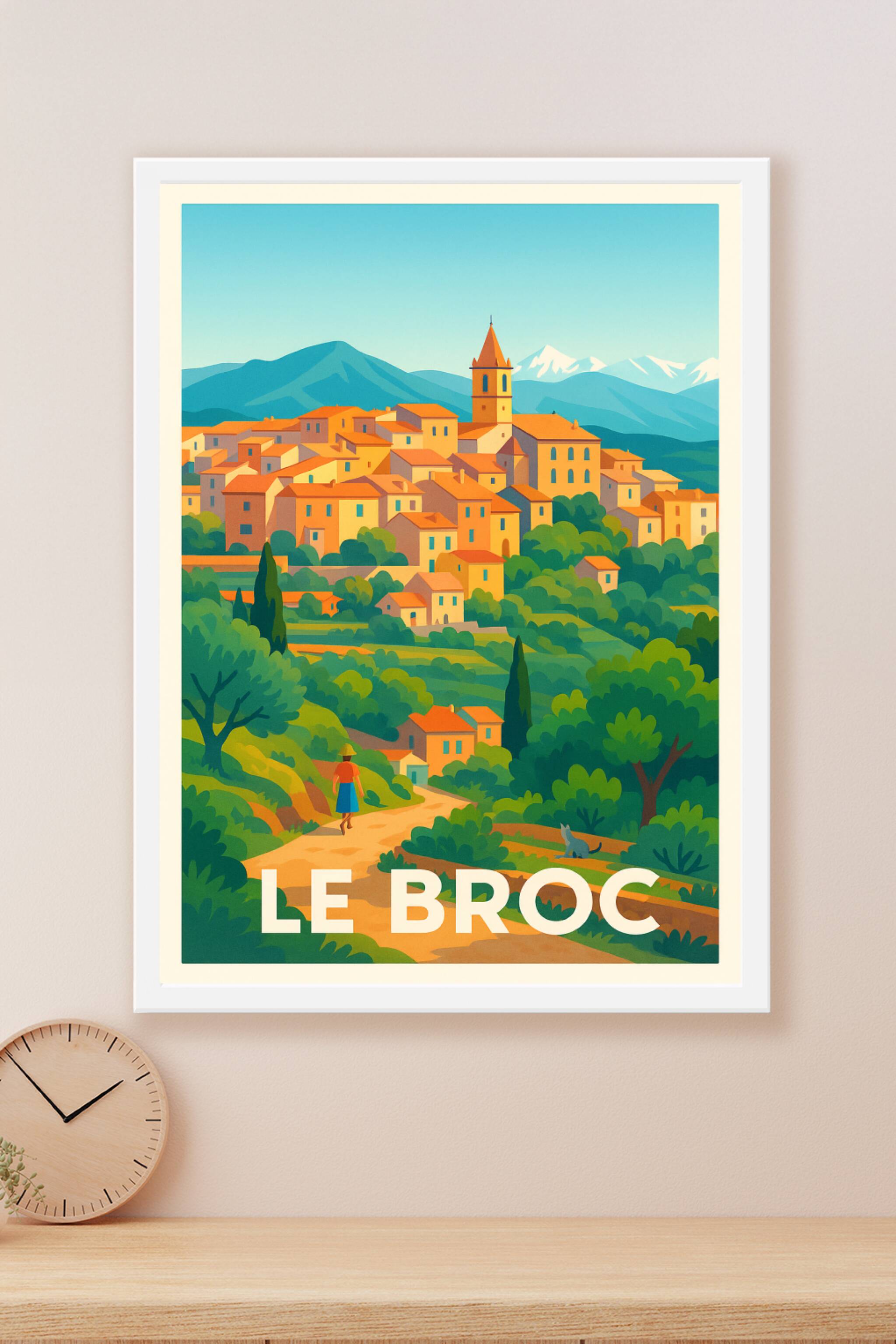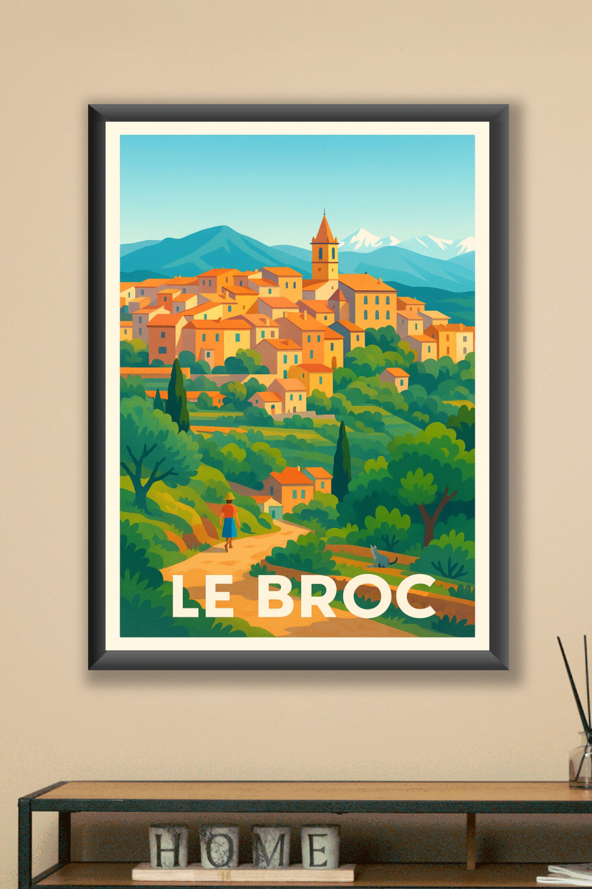Découvrez le village enchanteur de Le Broc à travers cette affiche au style rétro vintage qui capte l'essence des paysages méditerranéens. Les mais...