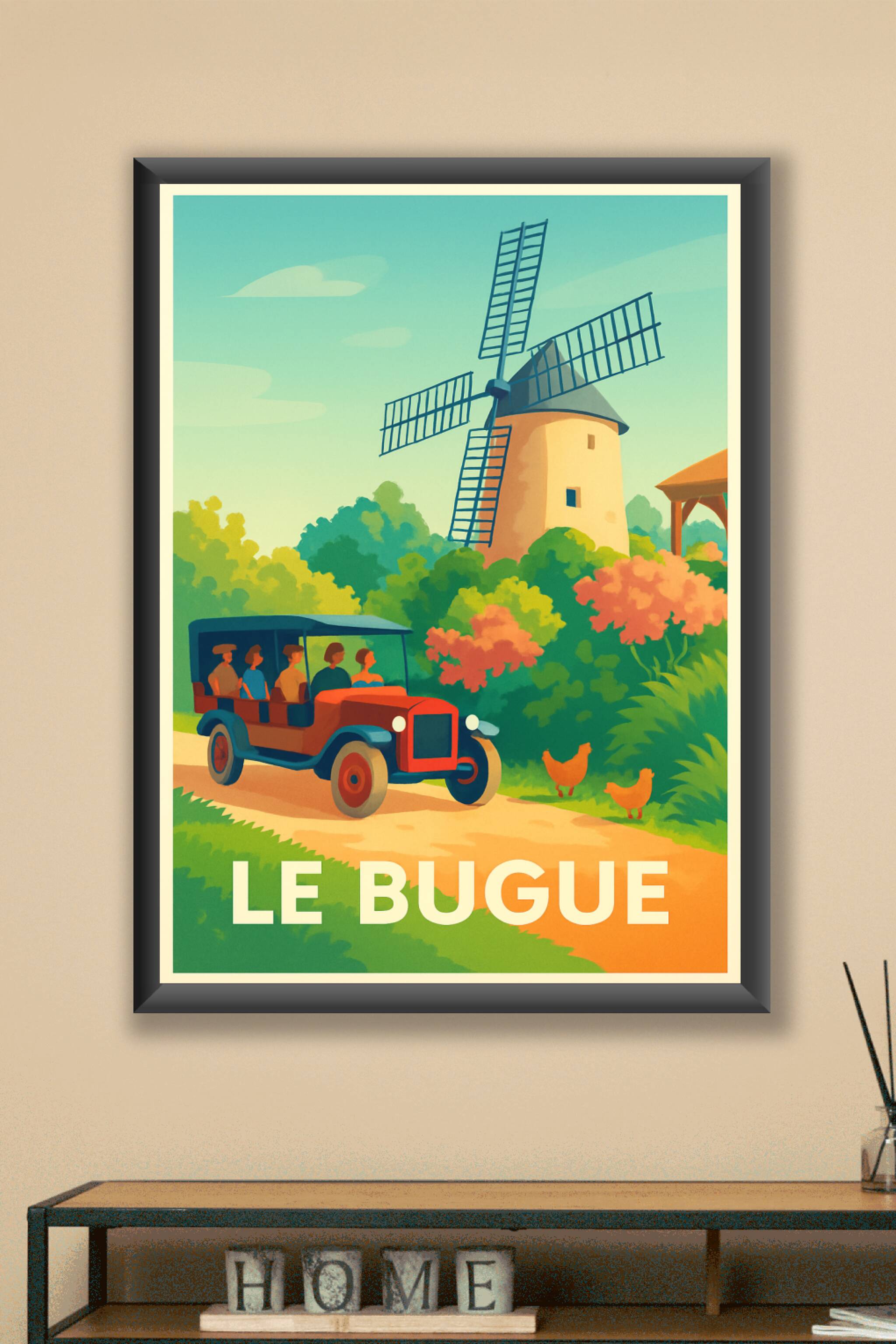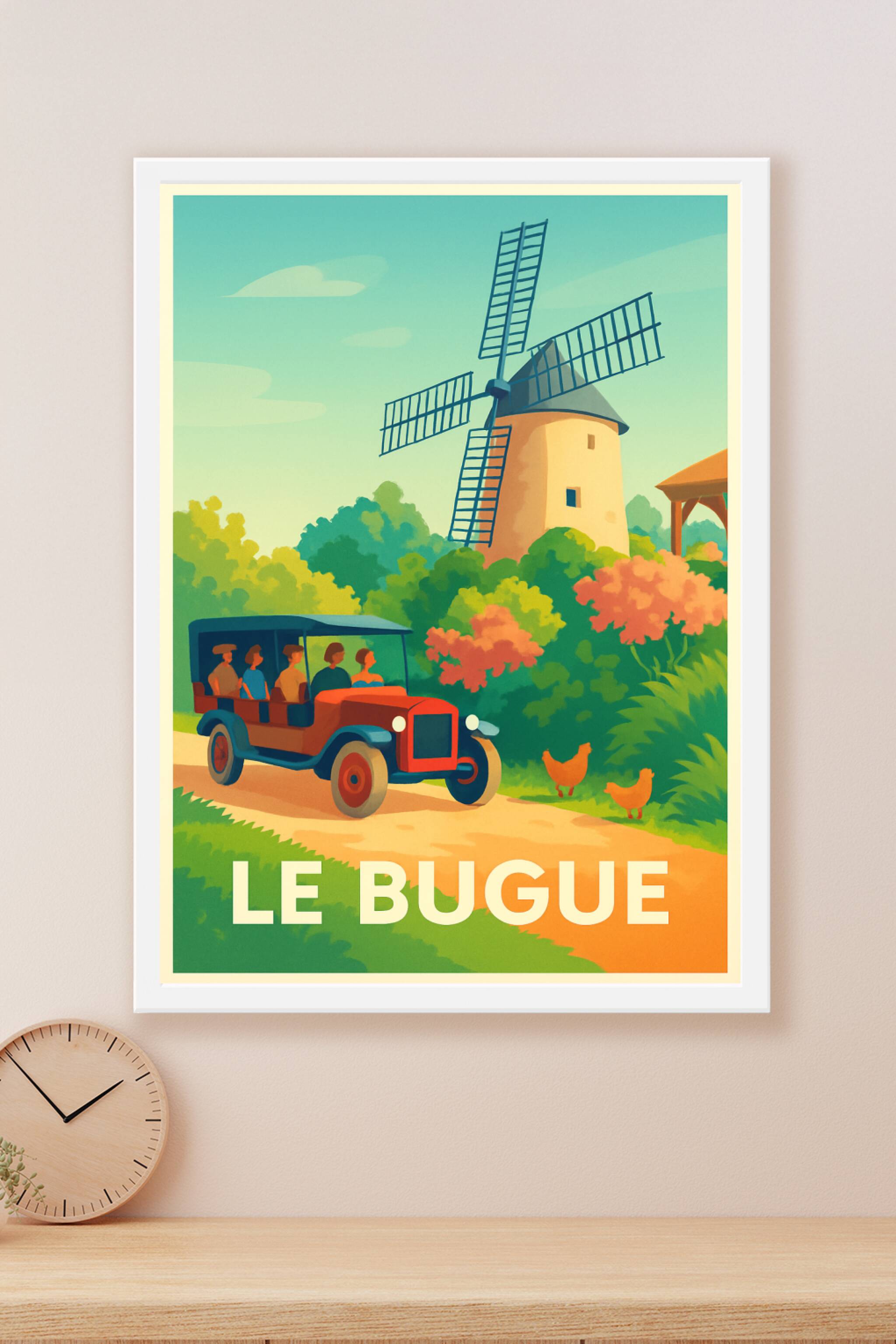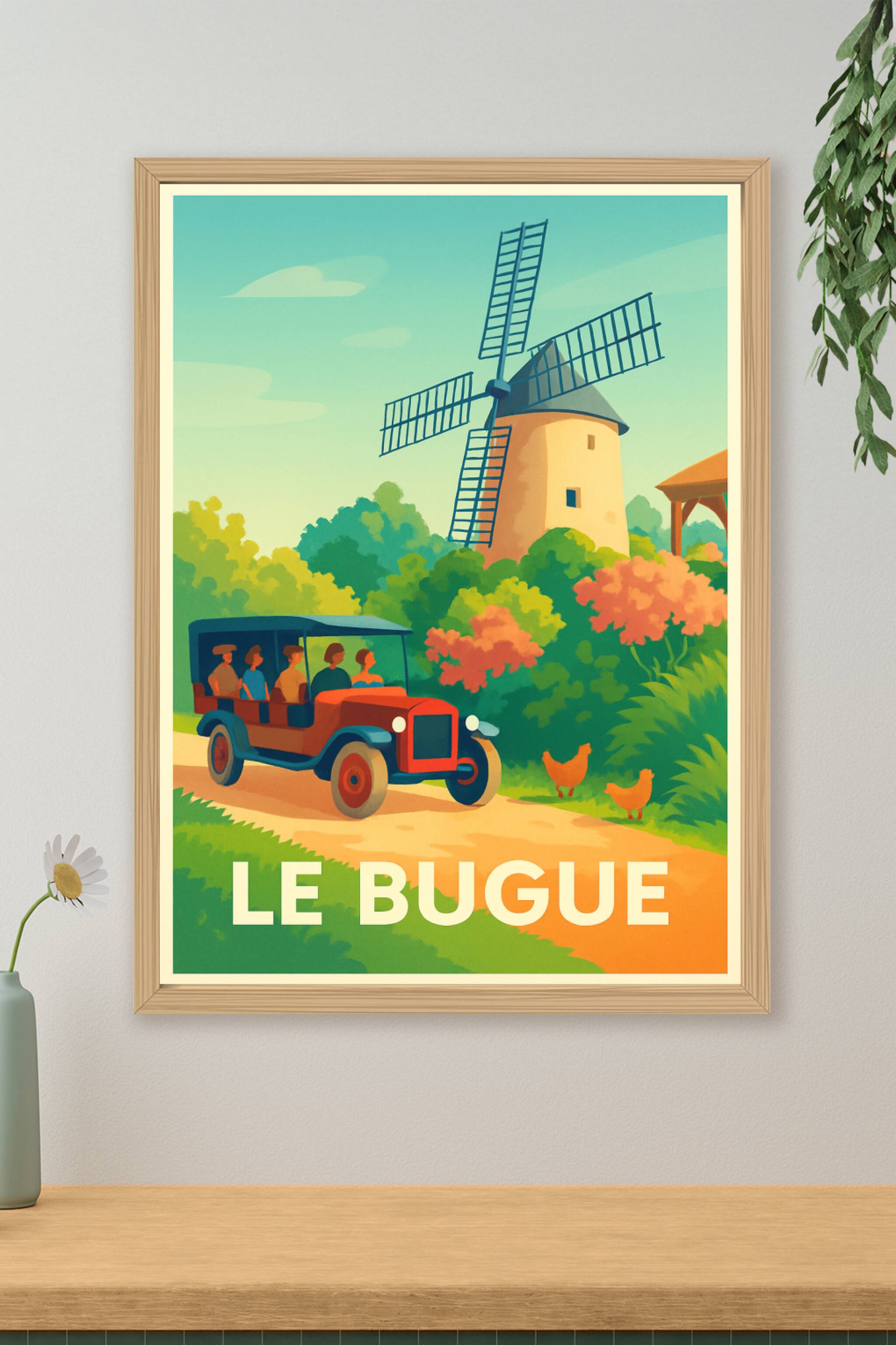 Découvrez l'élégance rétro et la douceur de vivre à Le Bugue avec cette affiche illustrée mettant en scène un ancien véhicule traversant un paysage champêtre dominé par un moulin pittoresque. Ce poster invite à un voyage dans le temps et dans la nature, parfait pour apporter une atmosphère chaleureuse et authentique à votre décoration intérieure. Imprimé en tirage "Fine Art" sur papier 305g coton, cette affiche de haute qualité offre des couleurs profondes et un rendu d'exception. Disponible du format A1 au format A4, avec ou sans cadre, ce tirage premium est 100% fabriqué en France, idéal pour les amateurs de décoration vintage et les passionnés de la région.