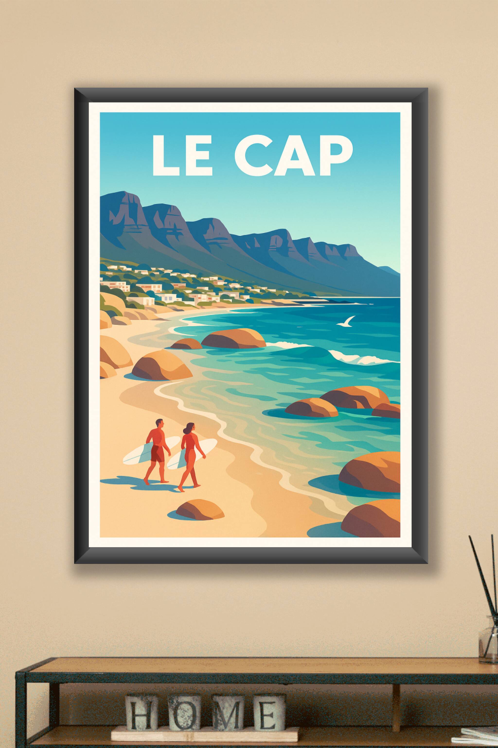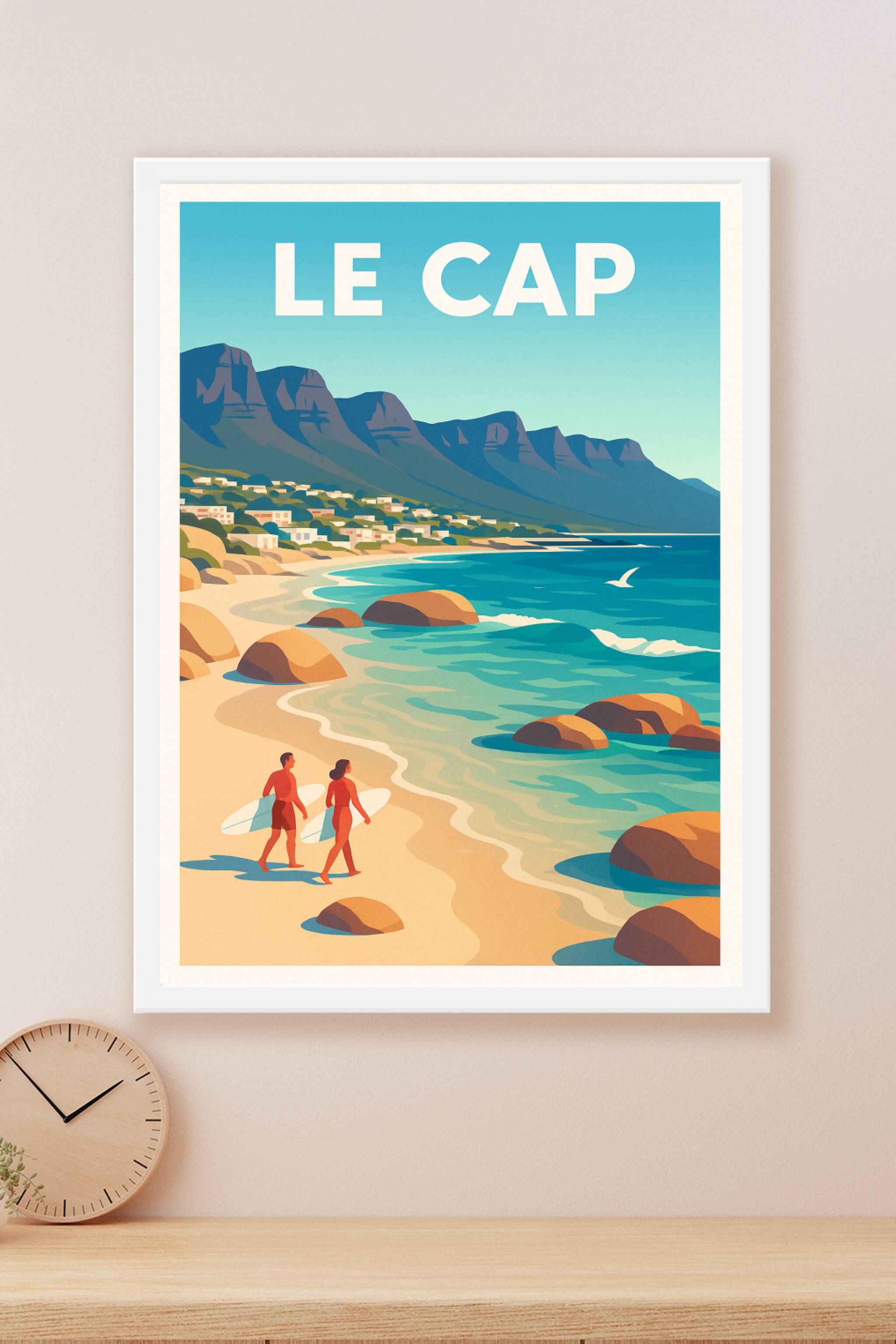 Revivez l'atmosphère unique de la célèbre ville de Cape Town avec cette affiche vintage représentant une plage idyllique bordée de montagnes imposantes. Ce poster évoque la douceur de vivre au bord de l'océan et l'appel de l'aventure avec ces deux surfeurs prêts à défier les vagues. Imprimé en tirage "Fine Art" sur un papier 305g coton haut de gamme, ce poster garantit une qualité d'impression et de couleurs exceptionnelles, parfait pour sublimer votre intérieur. Disponible en formats de A1 à A4, avec ou sans cadre, cette affiche est le cadeau parfait pour les amoureux des paysages marins et de l'esprit outdoor. Fabriquée avec soin en France, elle apporte une touche d'évasion et d'évasion à votre décoration.