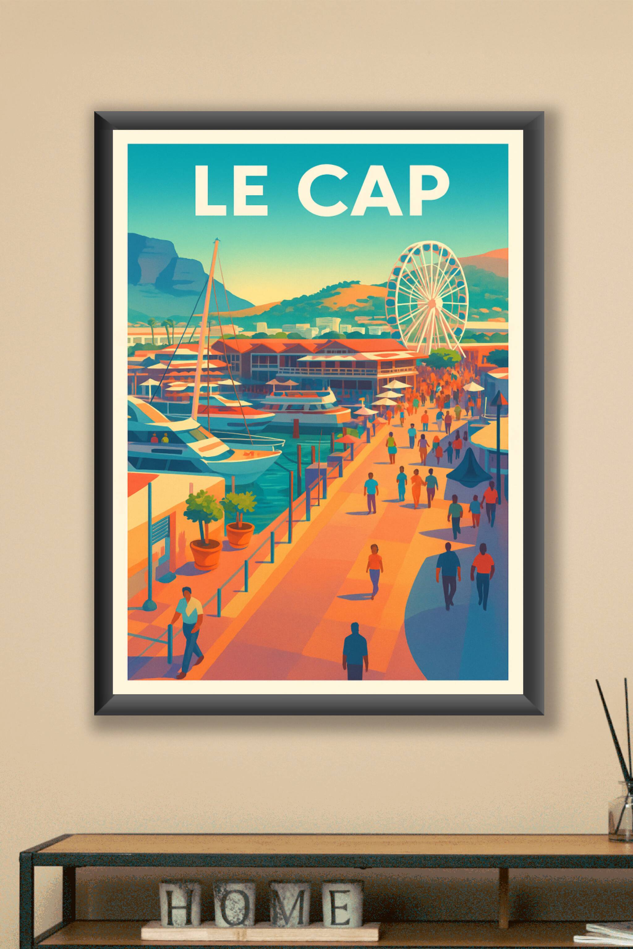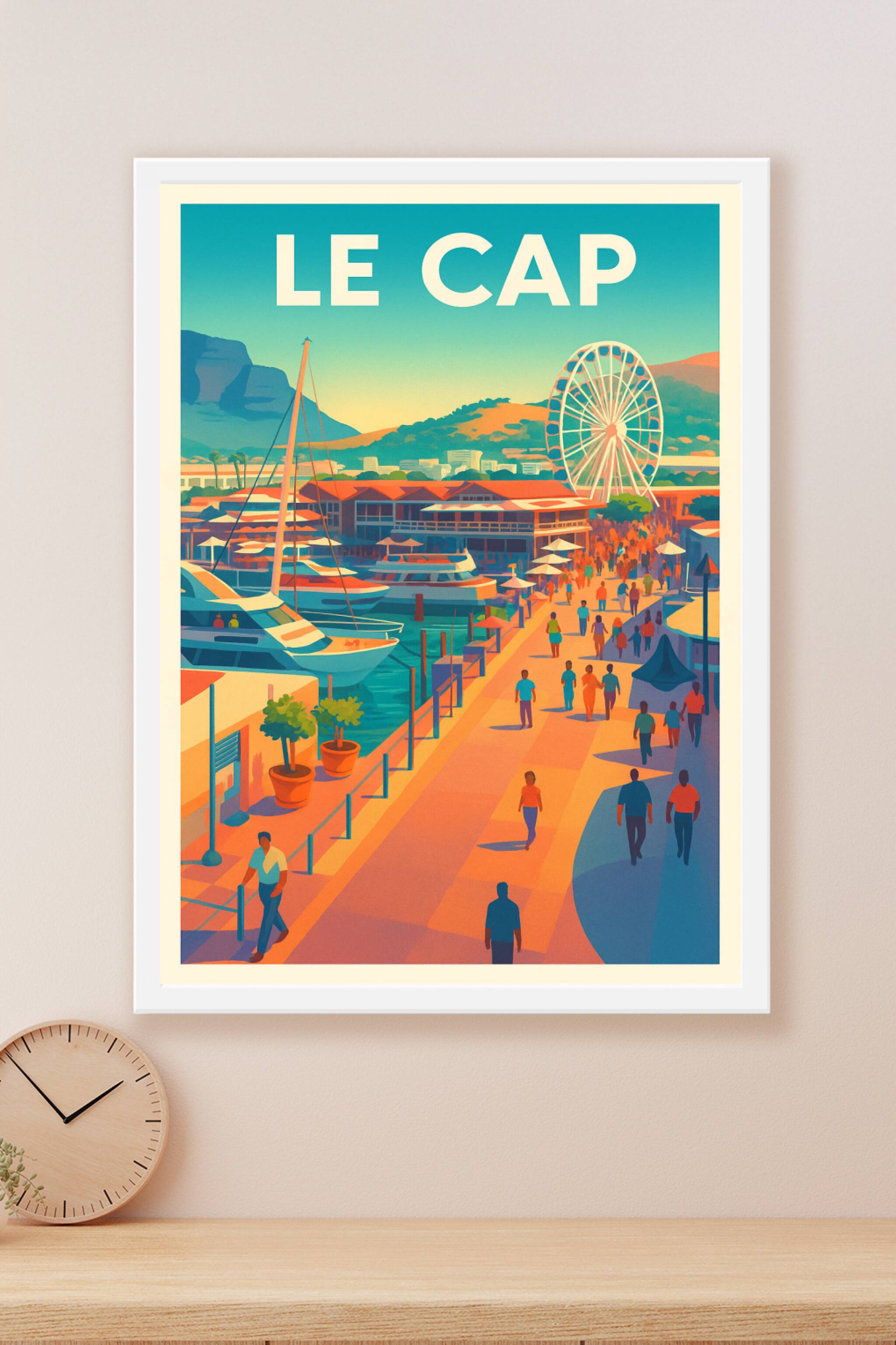 Découvrez l'effervescence du front de mer du Cap avec cette affiche vibrante mettant en scène une promenade animée bordée de yachts, terrasses et d...