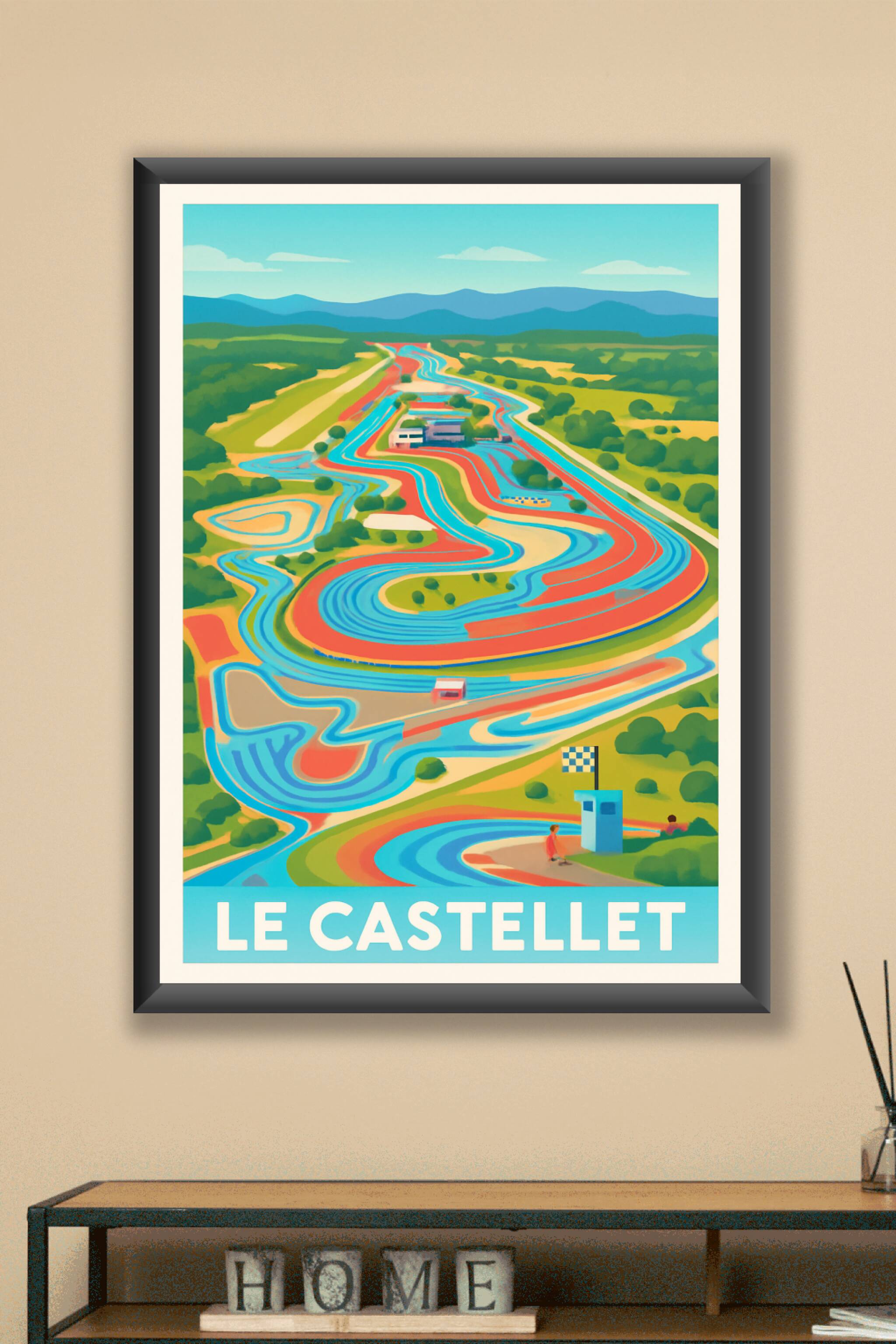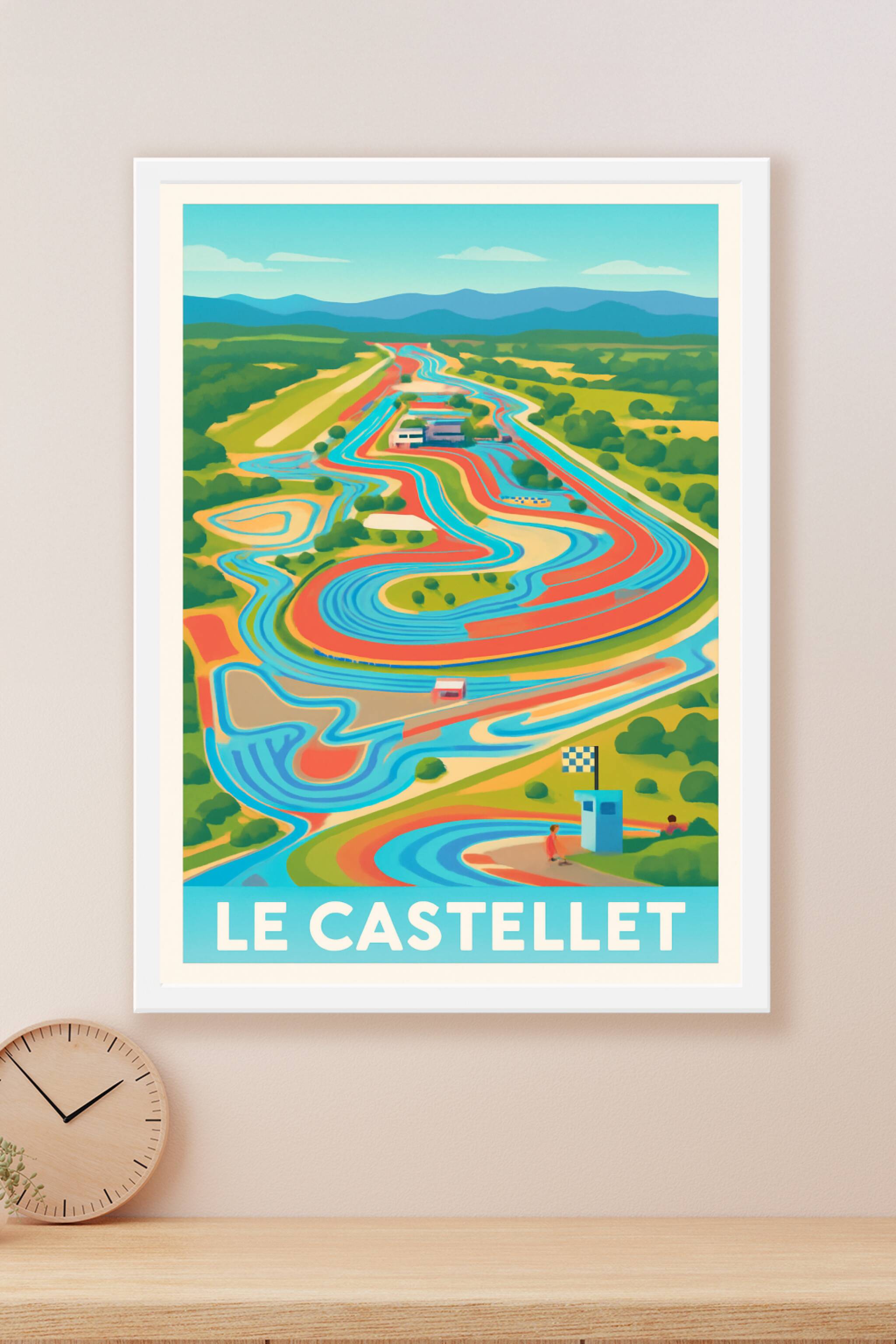 Découvrez l'univers vibrant et dynamique du circuit du Castellet à travers cette affiche unique au style moderne et coloré. Ce poster illustre l'em...