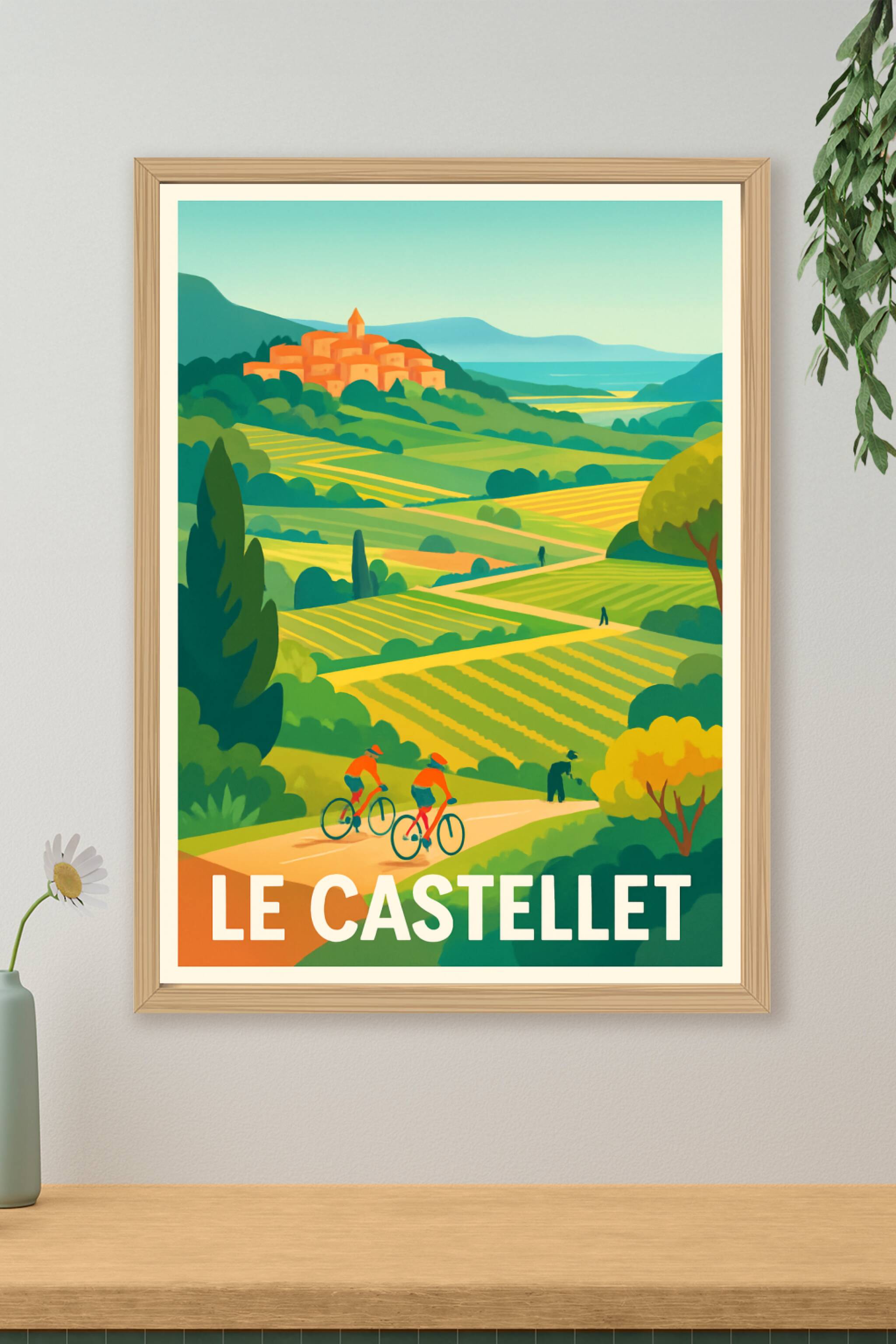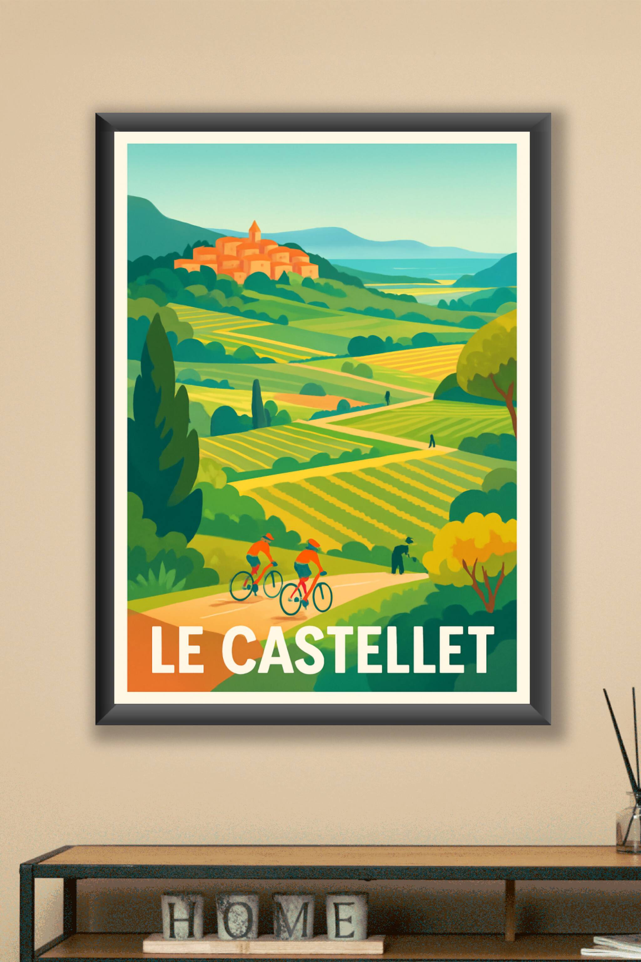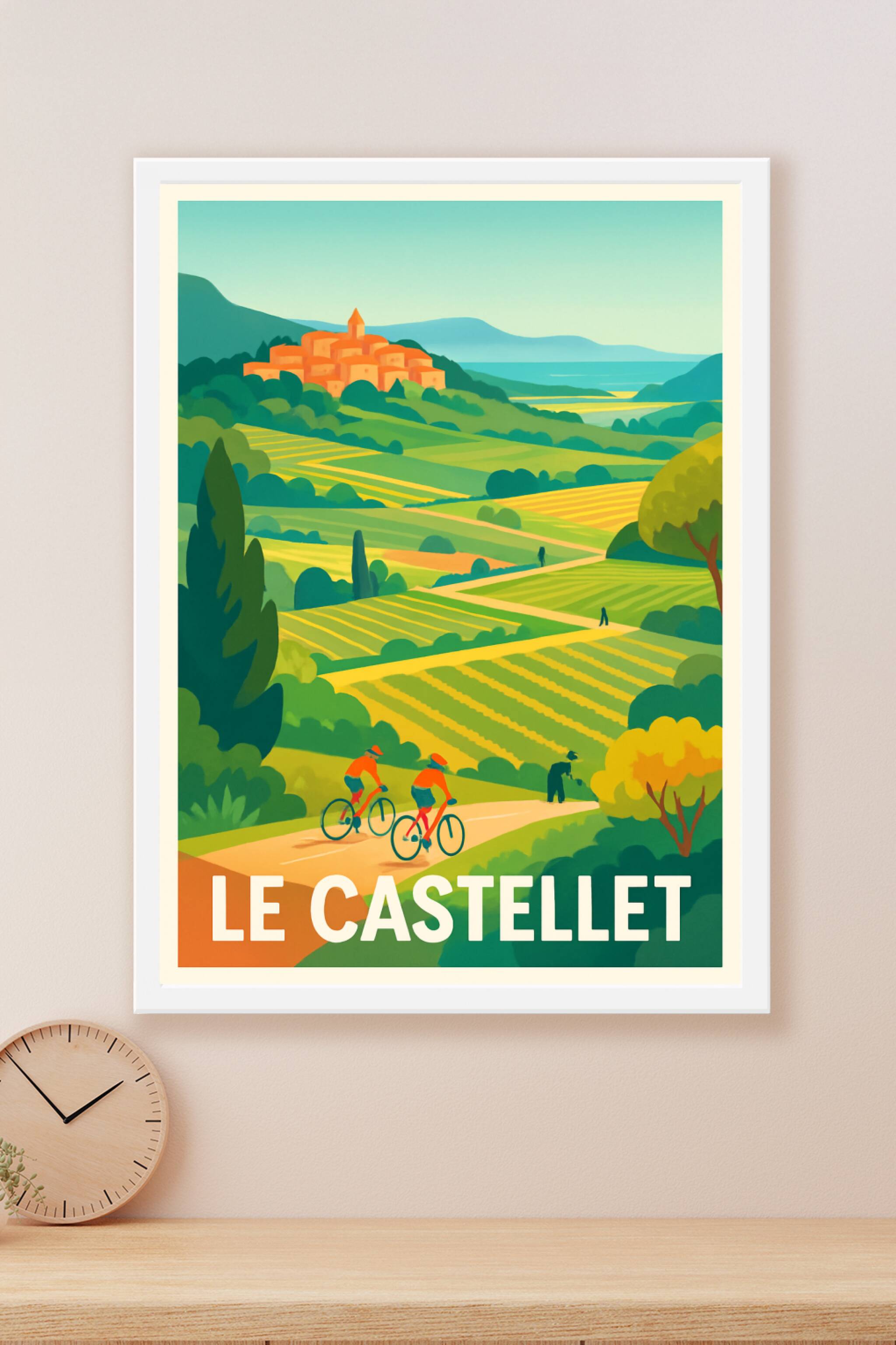 Retrouvez l'esprit bucolique et sportif de la Provence avec cette affiche illustrée représentant deux cyclistes dévalant les chemins pittoresques qui serpentent à travers les vignobles verdoyants de Le Castellet. En toile de fond, le village aux maisons ocres se dresse élégamment, incarnant la sérénité et l'authenticité de cette destination prisée.L'affiche est disponible en tirage "Fine Art" sur papier 305g coton, garantissant une qualité d'impression d'exception aux couleurs vibrantes. Choisissez votre format préféré, de l'imposant A1 au plus discret A4, avec ou sans cadre, pour apporter une touche provençale chaleureuse à votre décoration intérieure. Profitez d'un poster premium, imprimé 100% en France, idéal pour offrir ou embellir votre intérieur avec charme et authenticité.