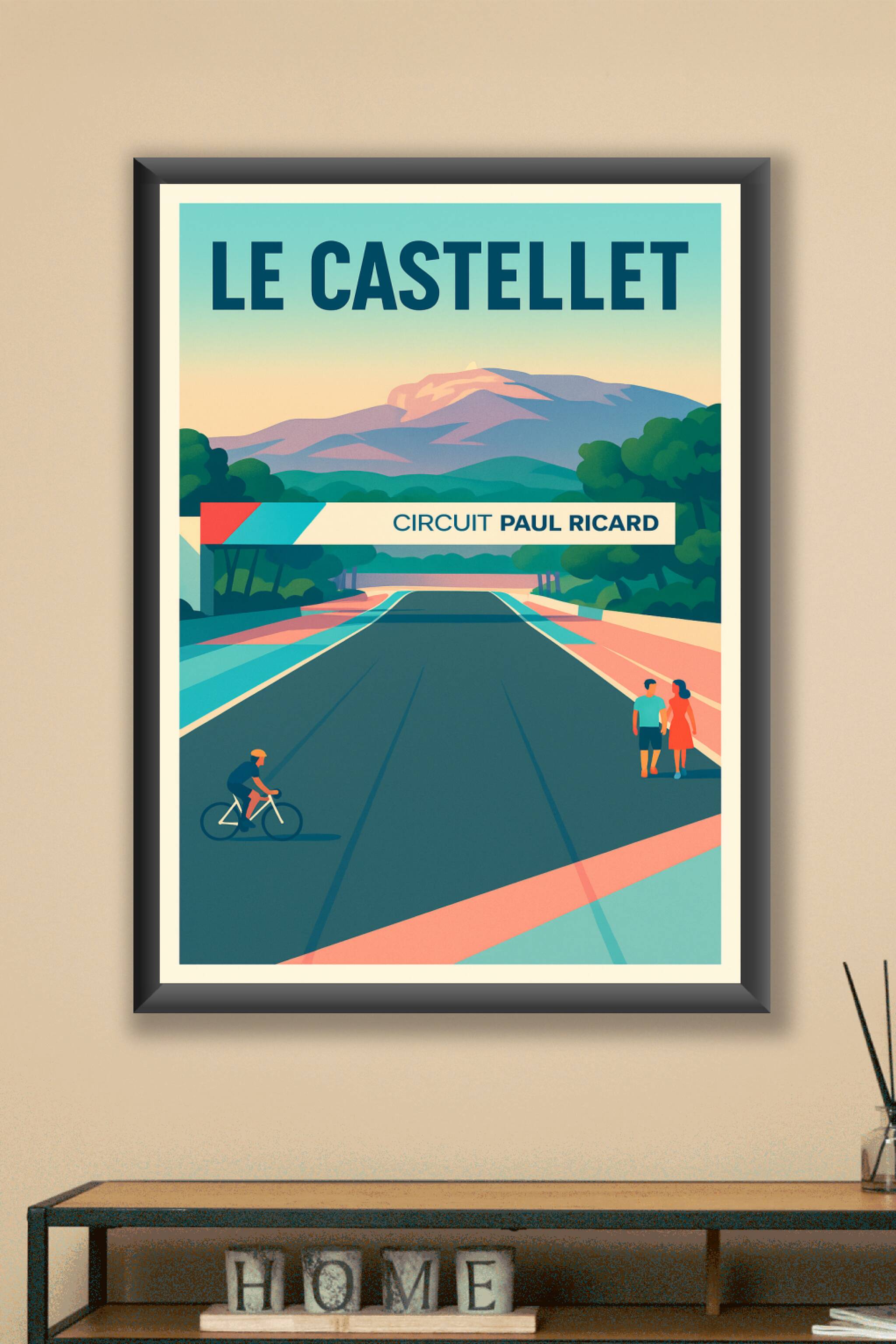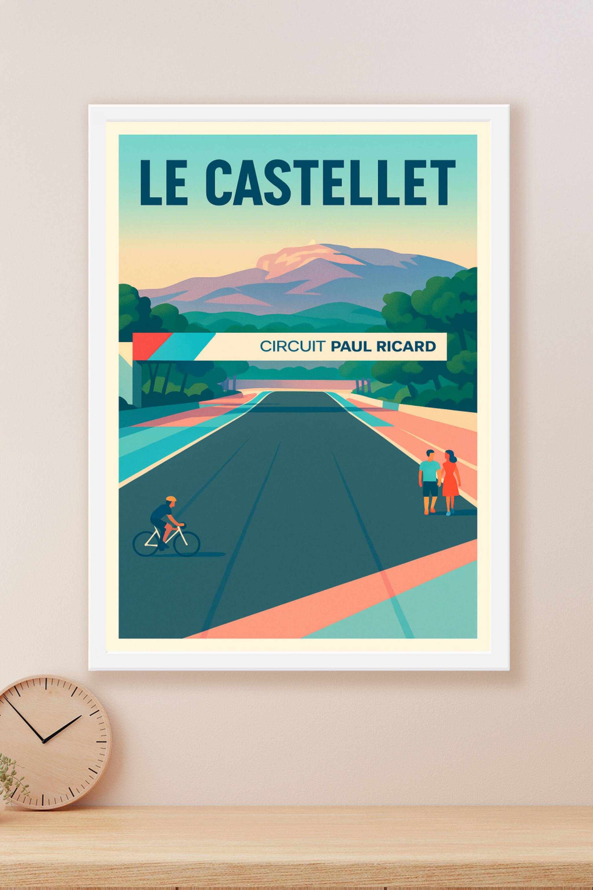Revivez l'ambiance unique du Circuit Paul Ricard avec cette affiche au style rétro illustré représentant une journée paisible mêlant sport et balad...