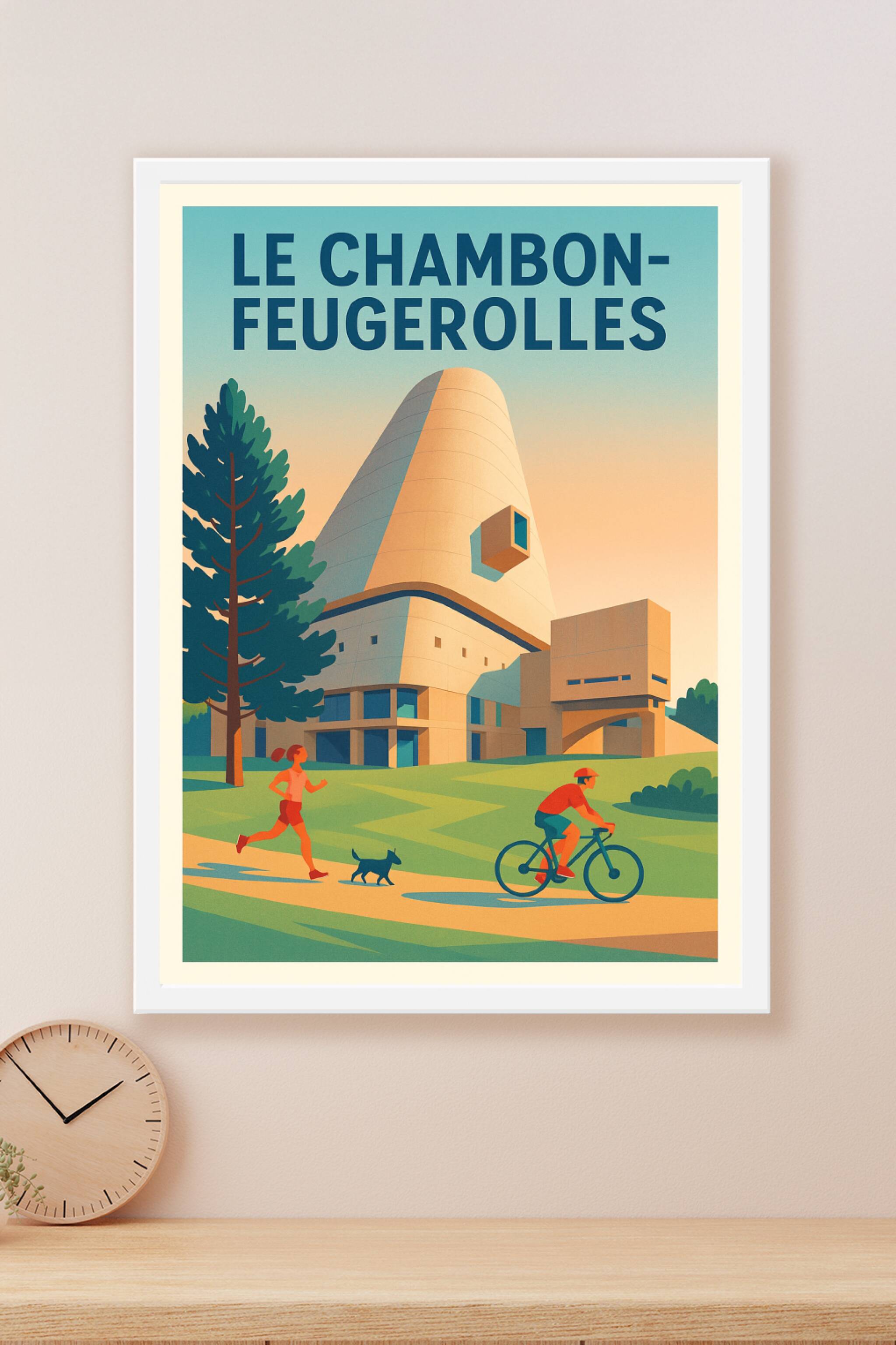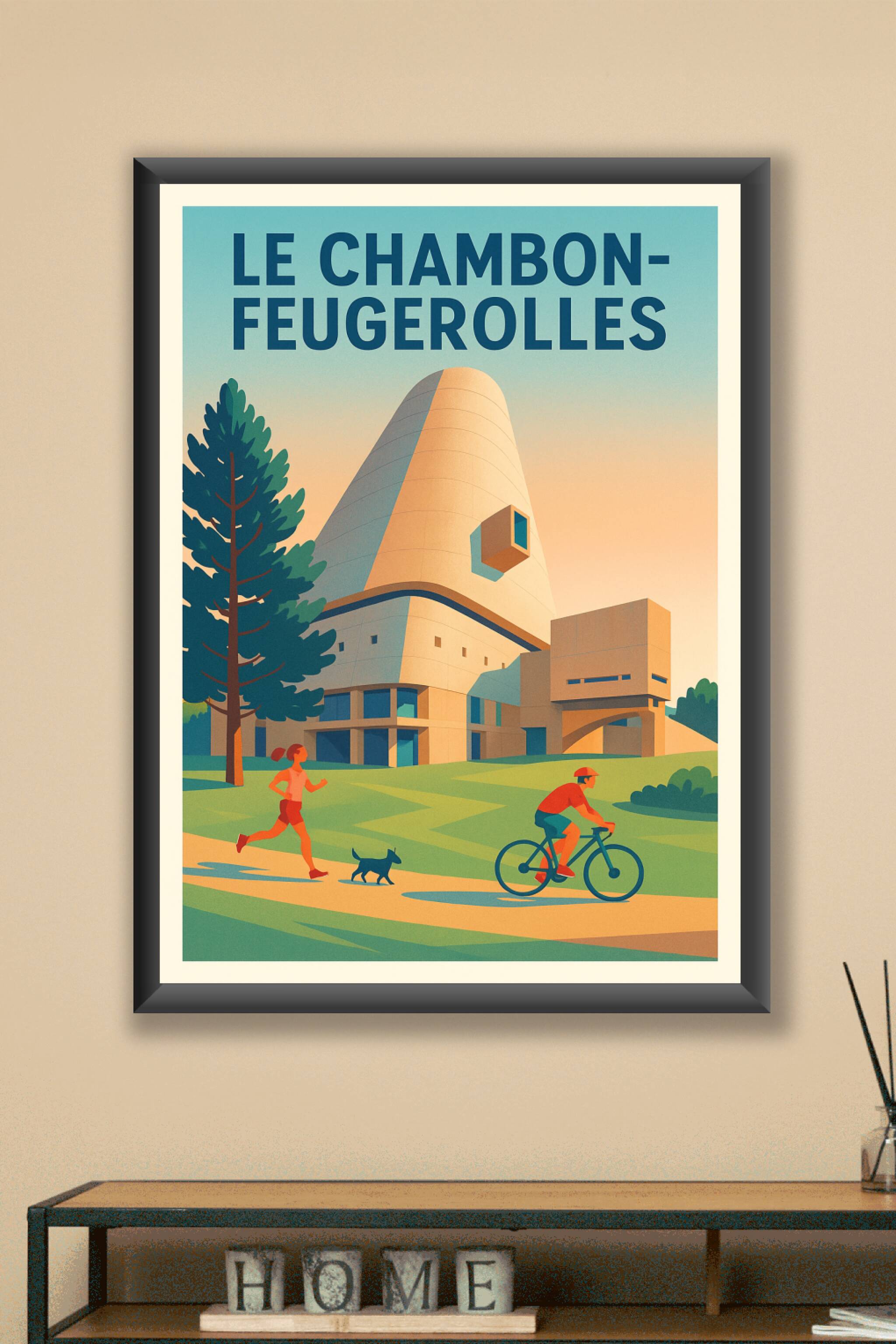 Découvrez l'alliance parfaite entre modernité architecturale et cadre naturel avec cette affiche illustrant Le Chambon-Feugerolles. L'illustration ...