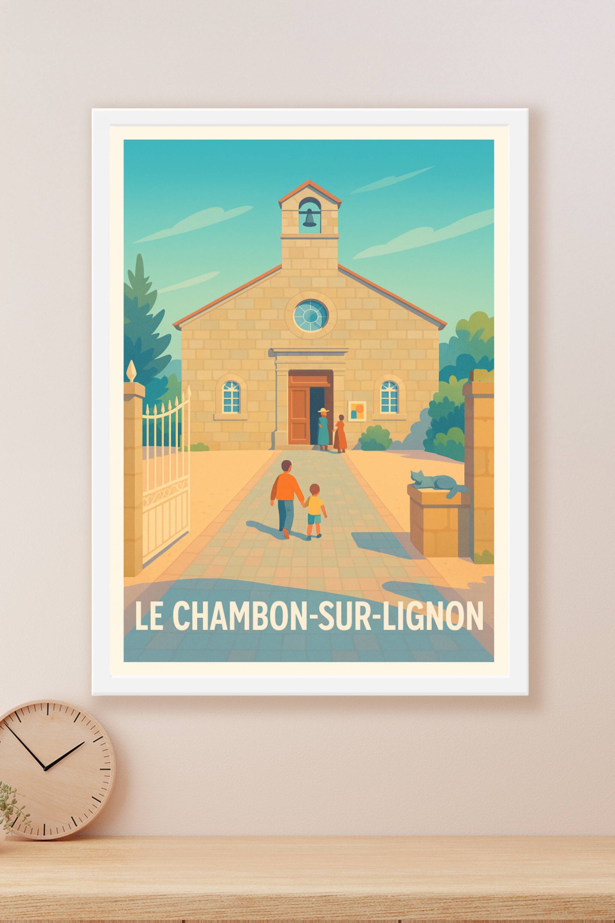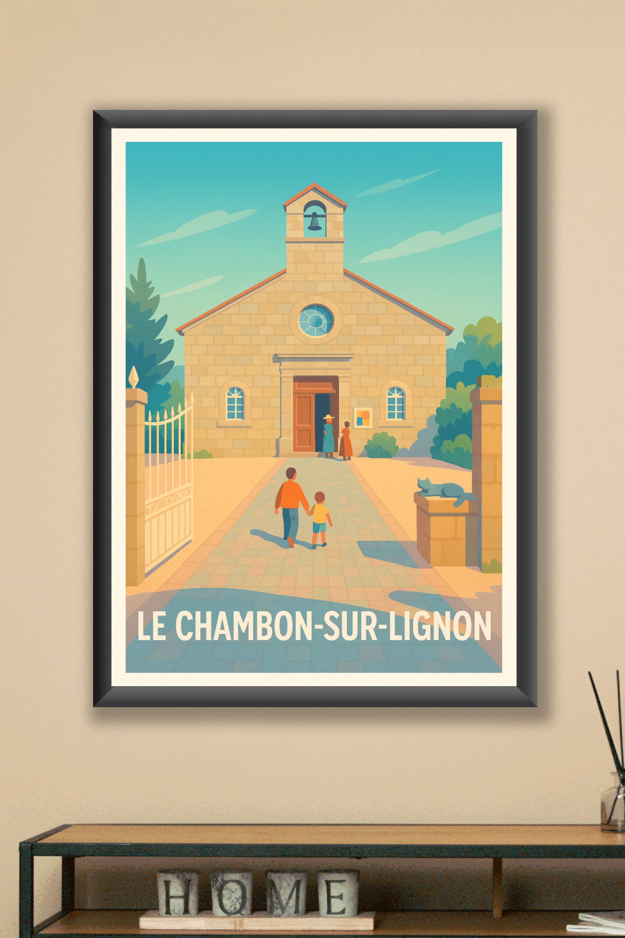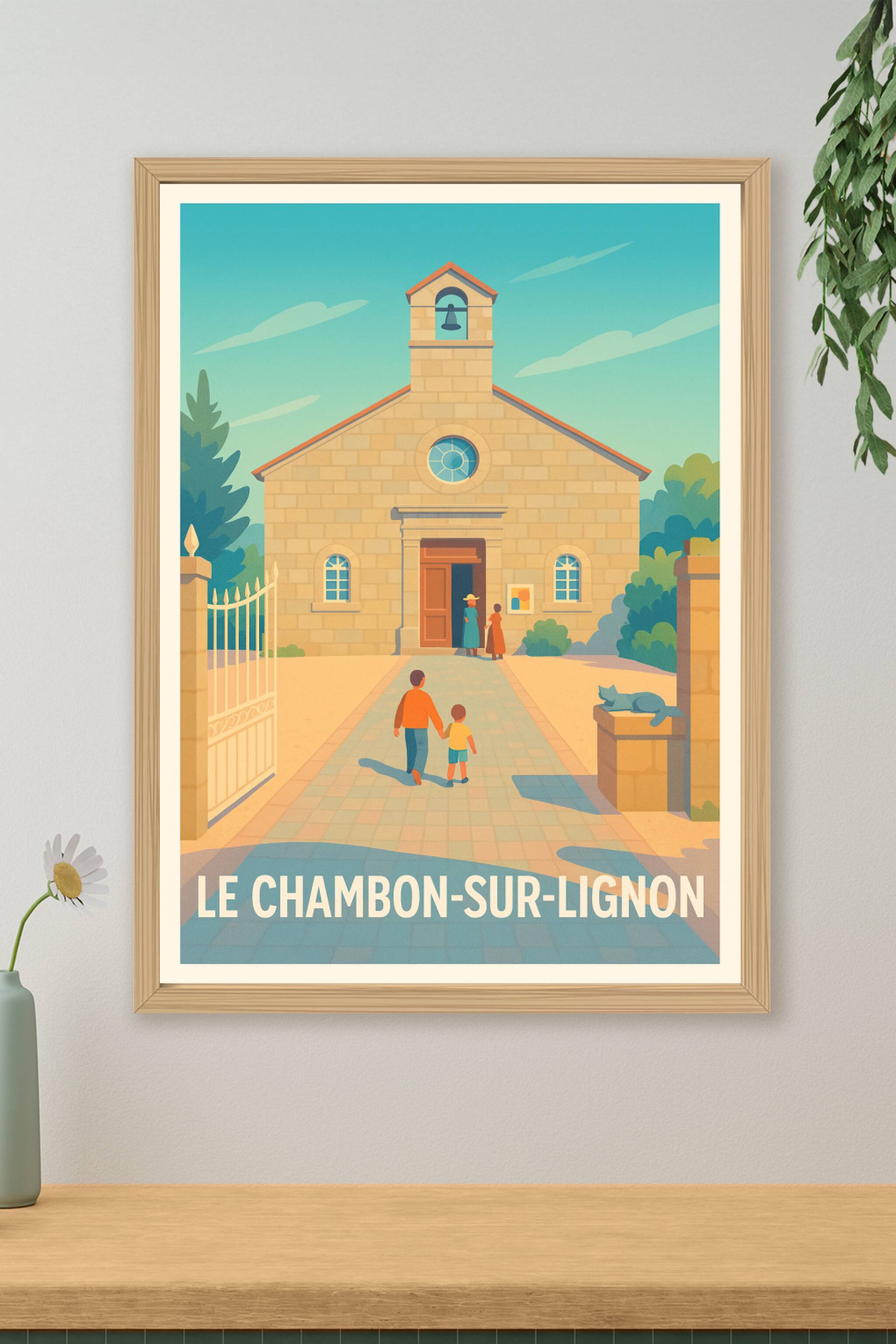Découvrez l'atmosphère paisible et chaleureuse du Chambon-sur-Lignon avec cette affiche illustrée représentant une scène typique de son architectur...