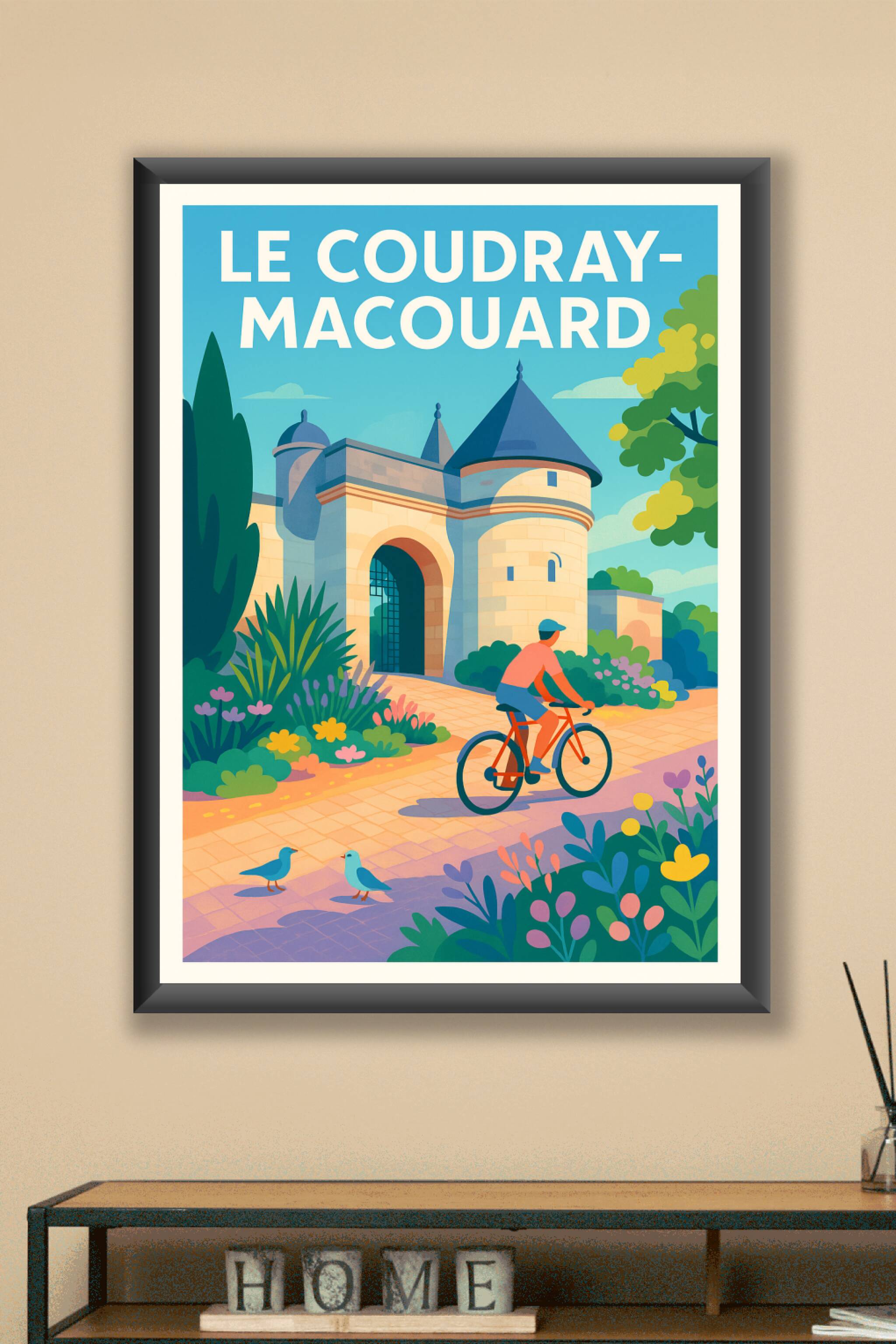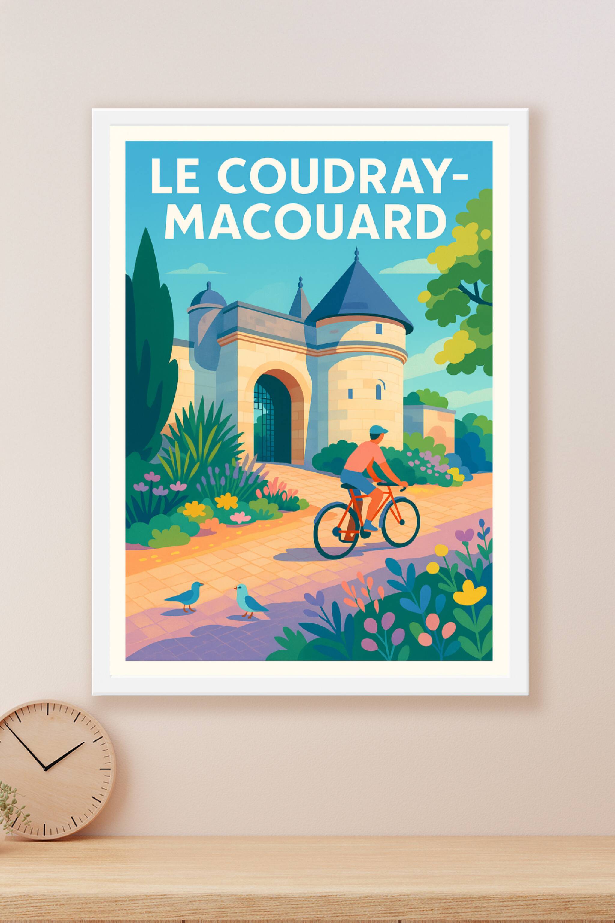 Découvrez la douceur de vivre du Coudray-Macouard avec cette affiche illustrée mettant en scène un cycliste traversant un paysage enchanteur autour...