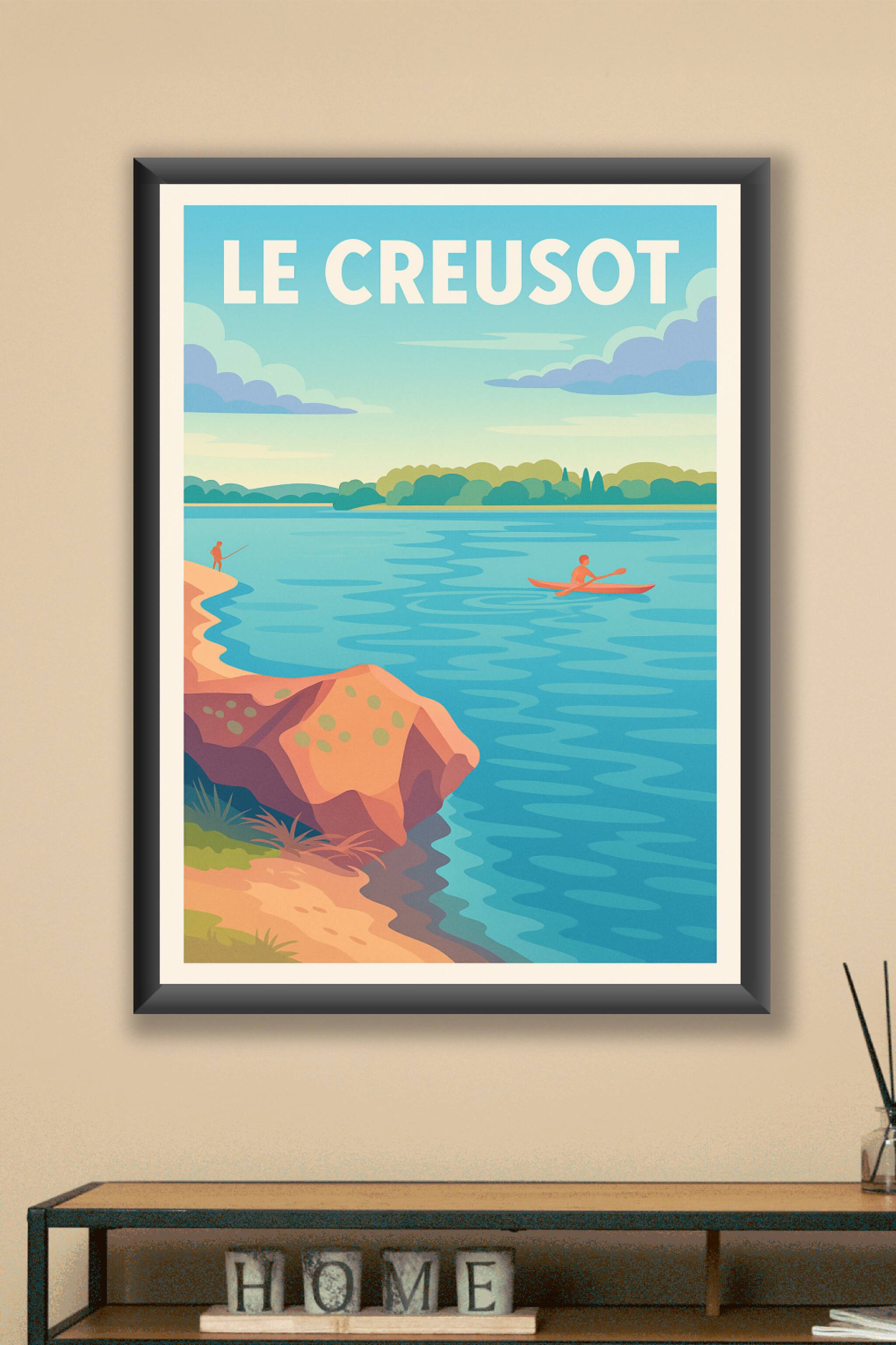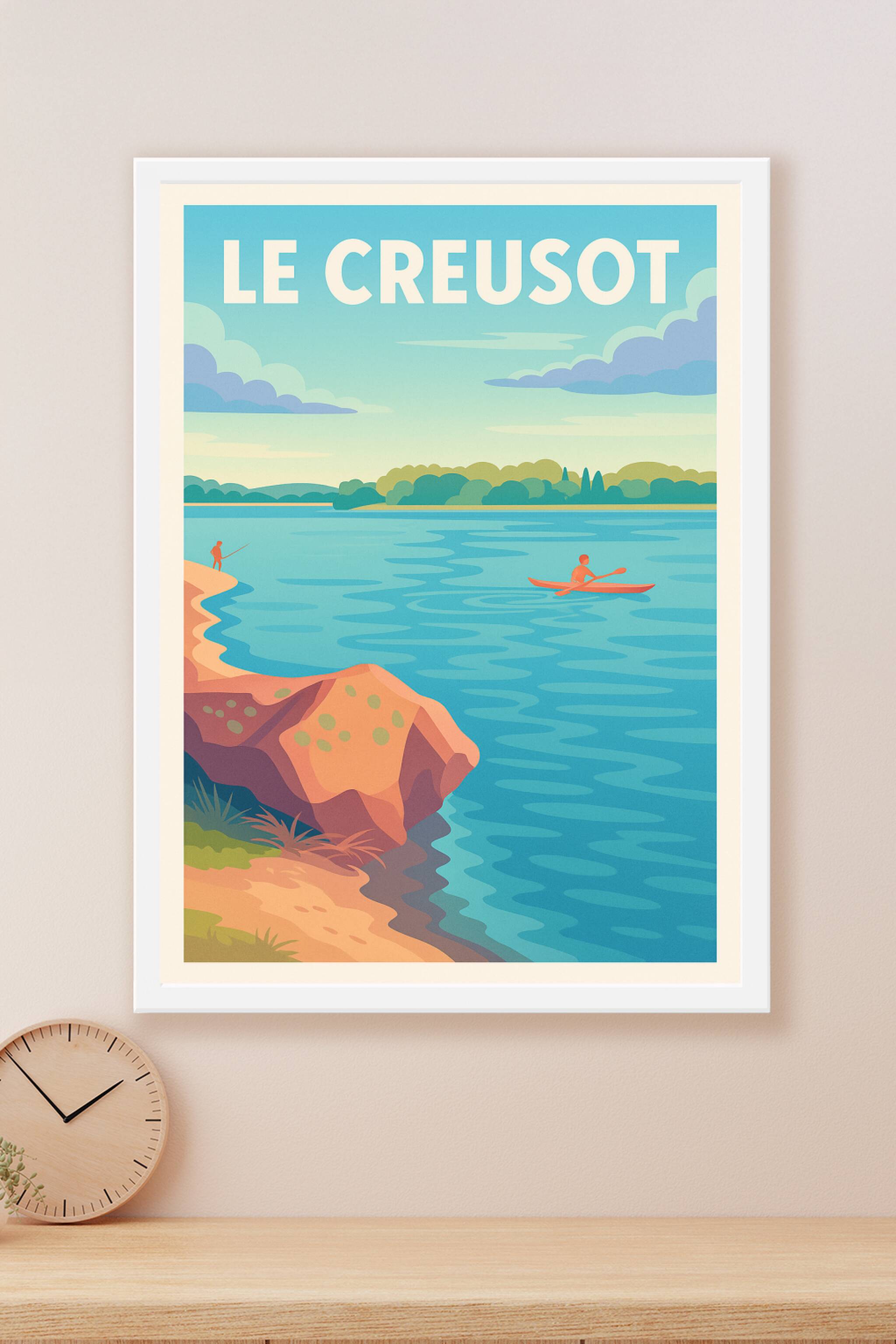 Découvrez la sérénité des paysages lacustres du Creusot avec cette affiche illustrée dans un style doux et épuré. Entre pêche paisible et balade en...