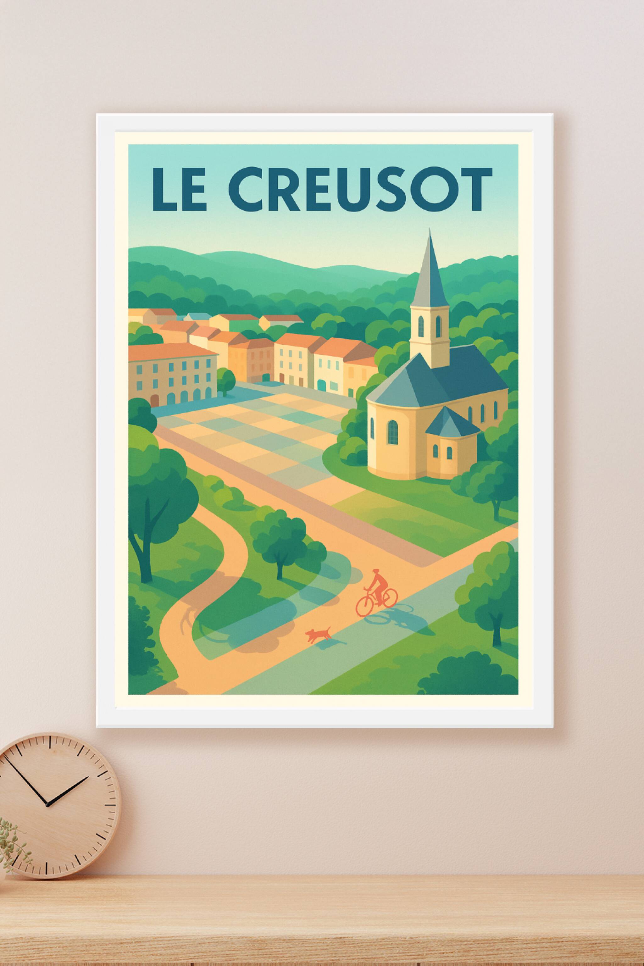 Découvrez l'élégance paisible de Le Creusot à travers cette affiche illustrée aux couleurs douces et lumineuses. Ce poster met en scène les ruelles pittoresques, une église emblématique et une végétation verdoyante, symboles d'un cadre de vie à la fois serein et chaleureux. Imprimée en tirage "Fine Art" sur papier coton 305g, cette affiche garantit une qualité d'impression supérieure, fidèle à l'original. Disponible en formats A1 à A4, avec ou sans cadre, elle apportera une touche de tranquillité et d'authenticité à votre décoration intérieure. Offrez ou possédez ce poster de prestige, 100% fabriqué en France, et laissez Le Creusot embellir vos murs.