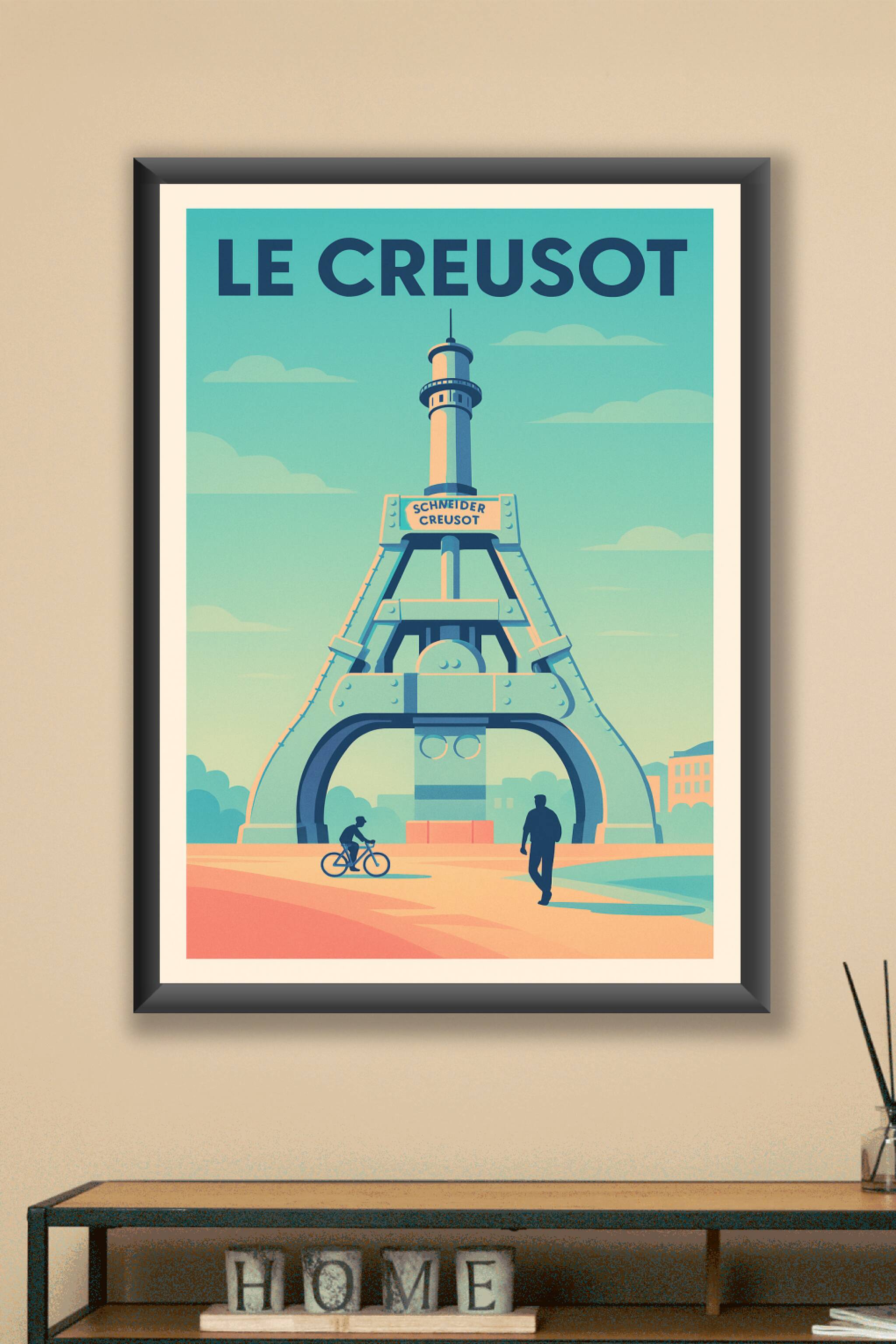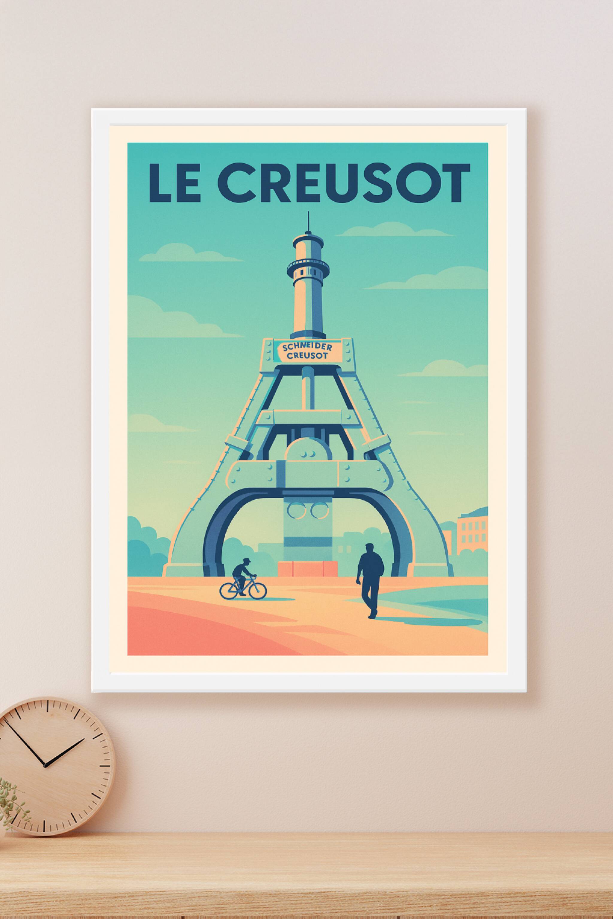 Découvrez cette affiche unique illustrant le monument emblématique du Creusot, symbole de son riche héritage industriel. Ce poster au style rétro m...