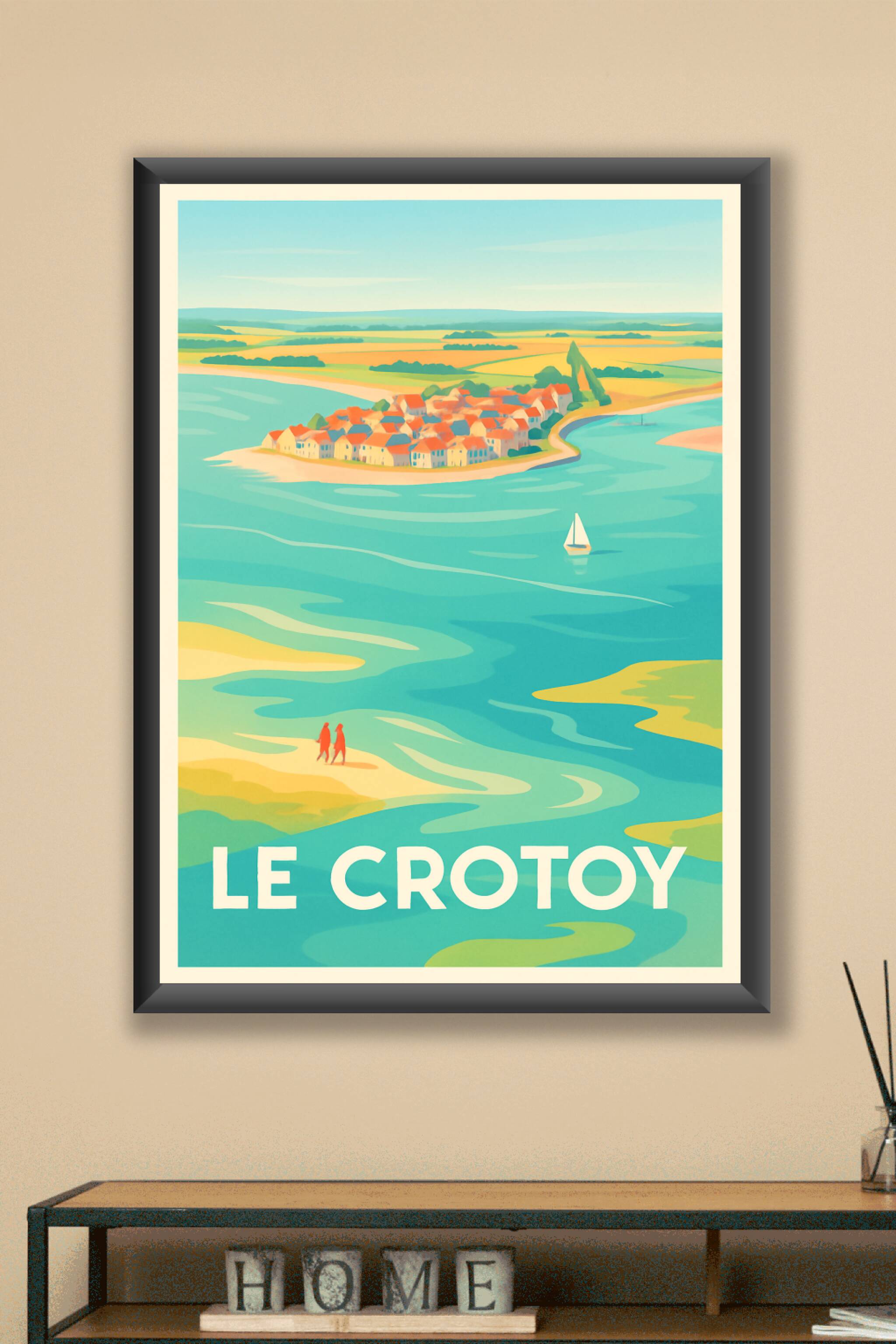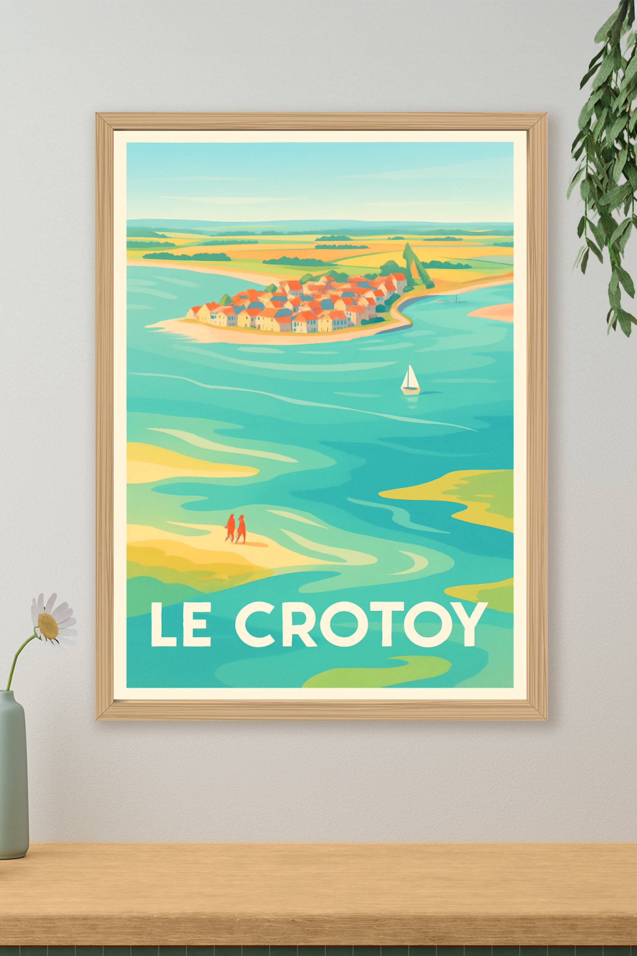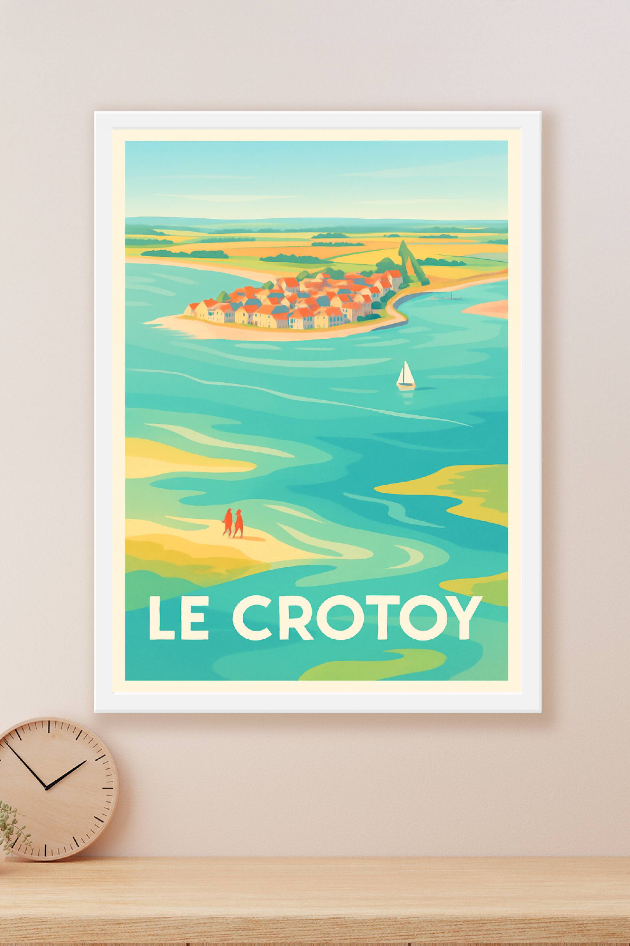 Découvrez cette affiche vintage illustrant la charmante baie du Crotoy, un petit coin de paradis au cœur de la baie de Somme. Ce poster capture l'atmosphère paisible de ce village côtier avec ses toits rouges et ses eaux turquoise, parfait pour évoquer l'évasion et la douceur de vivre. Imprimée en tirage "Fine Art" sur papier 305g coton, cette affiche offre une qualité d'impression exceptionnelle, avec des couleurs vives et durables. Disponible en formats A1 à A4, avec ou sans cadre, elle s'intégrera élégamment à votre intérieur ou fera un cadeau idéal aux amoureux du Crotoy et des paysages marins. Profitez d'une impression premium 100% française pour embellir votre séjour ou votre salon.