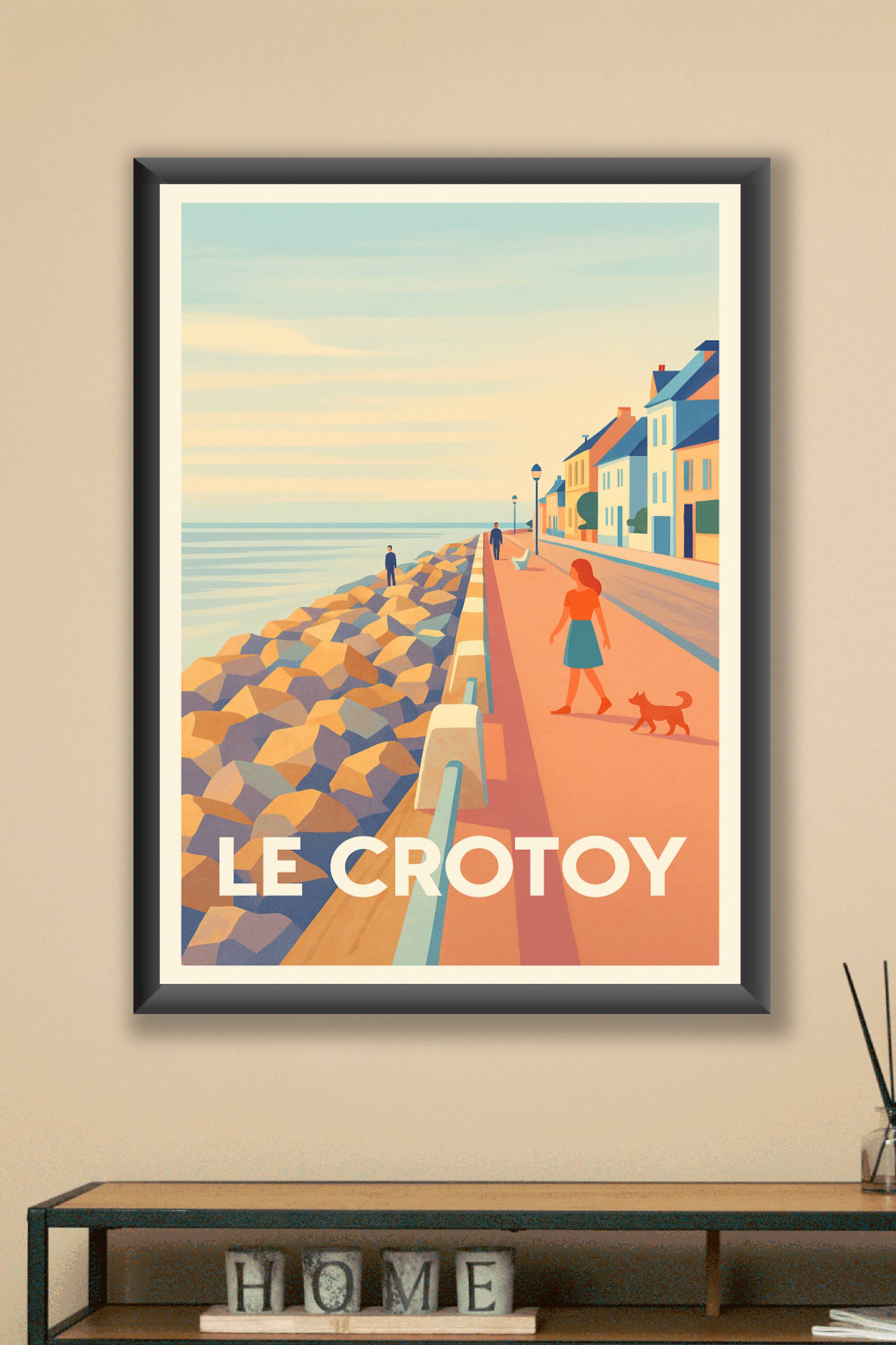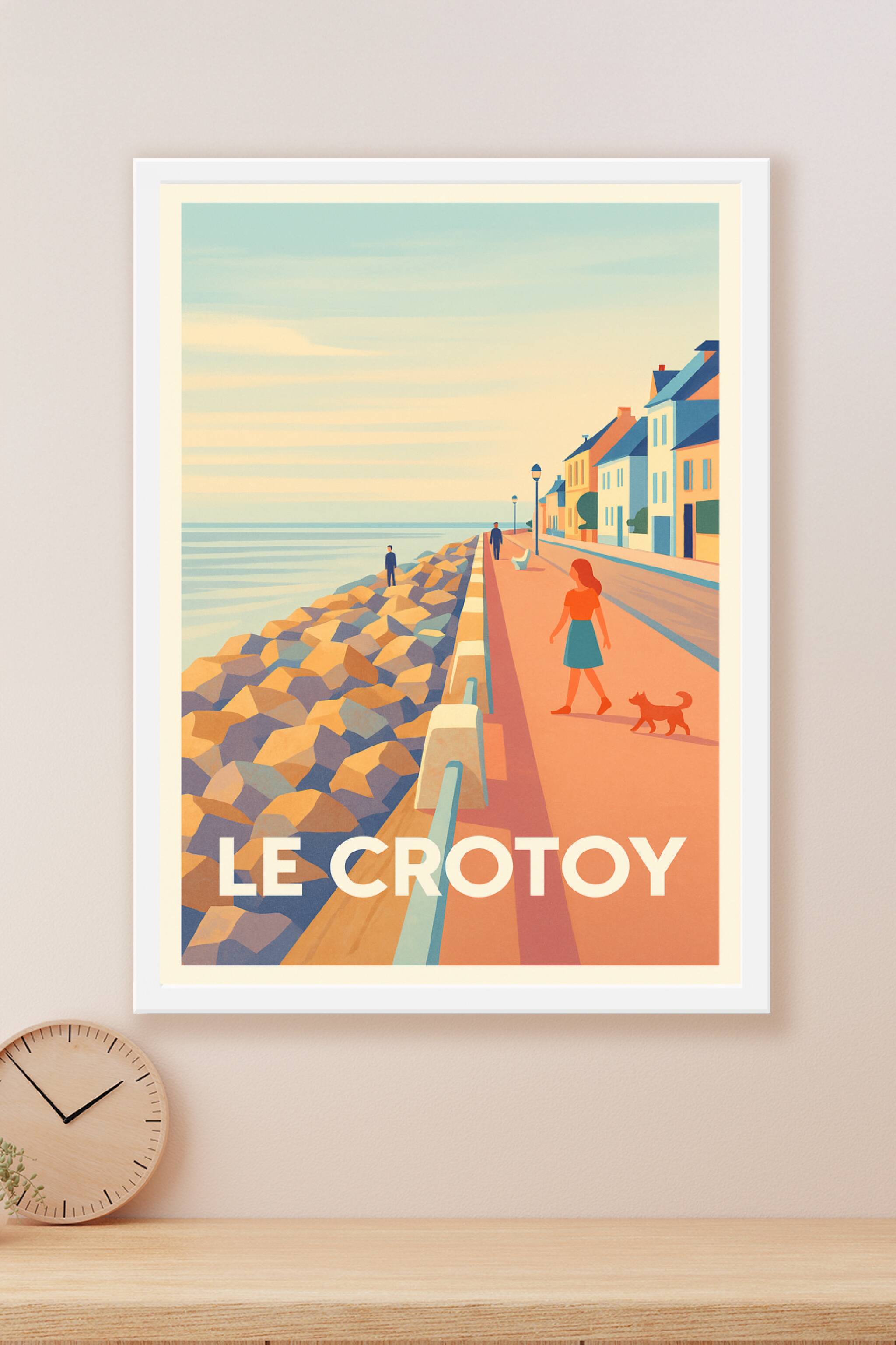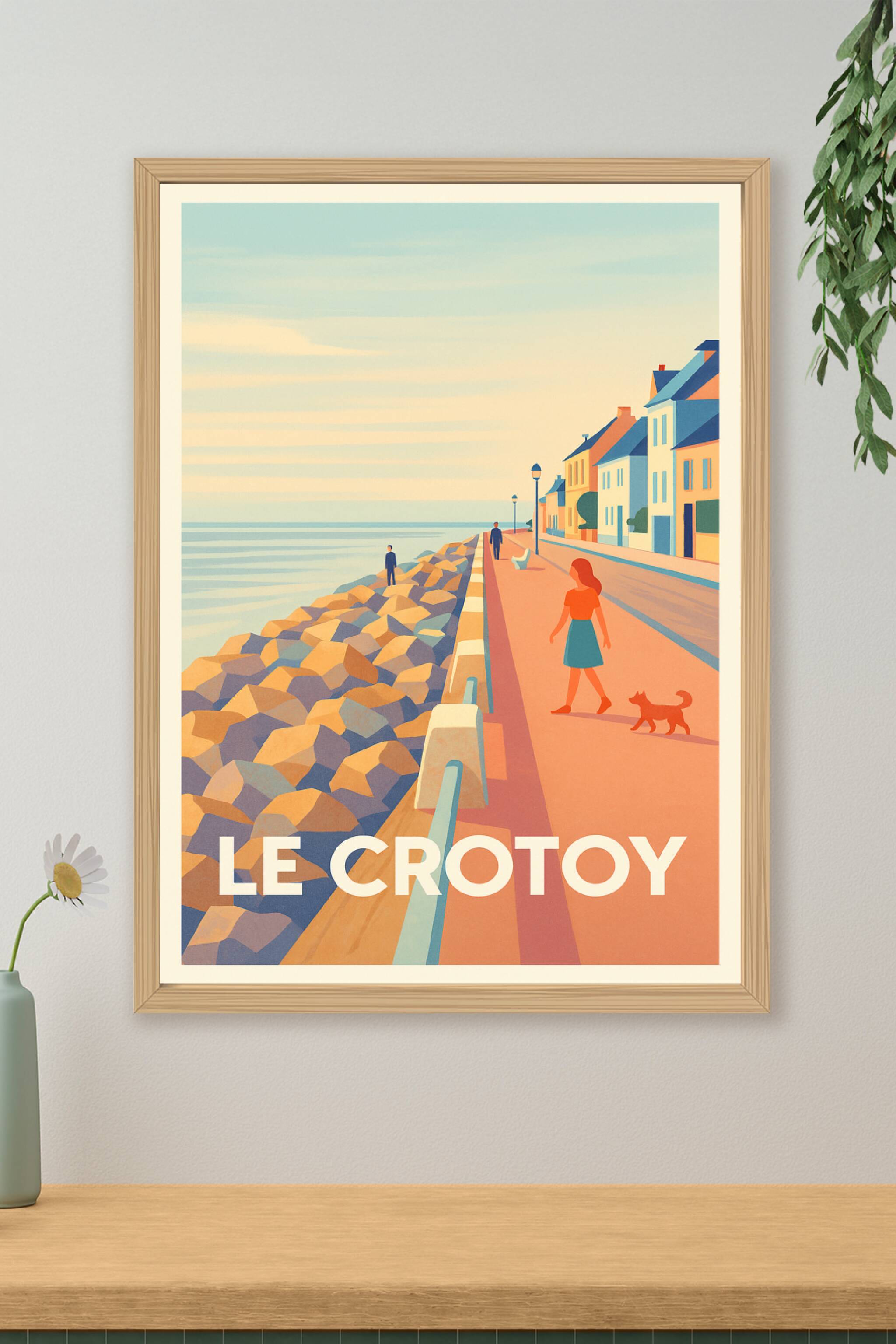 Découvrez la douceur de vivre du littoral avec cette affiche représentant une promenade tranquille le long des rochers et des maisons colorées du Crotoy. Ce poster au style épuré et aux teintes chaudes invite à la détente et à l'évasion. Imprimé en tirage "Fine Art" sur papier 305g coton de haute qualité, il garantit une restitution parfaite des couleurs. Disponible en formats A1 à A4, avec ou sans cadre, cette affiche est idéale pour embellir votre intérieur ou offrir un souvenir élégant et authentique de la baie de Somme. Profitez d'une impression premium soigneusement fabriquée en France pour une décoration maritime unique.