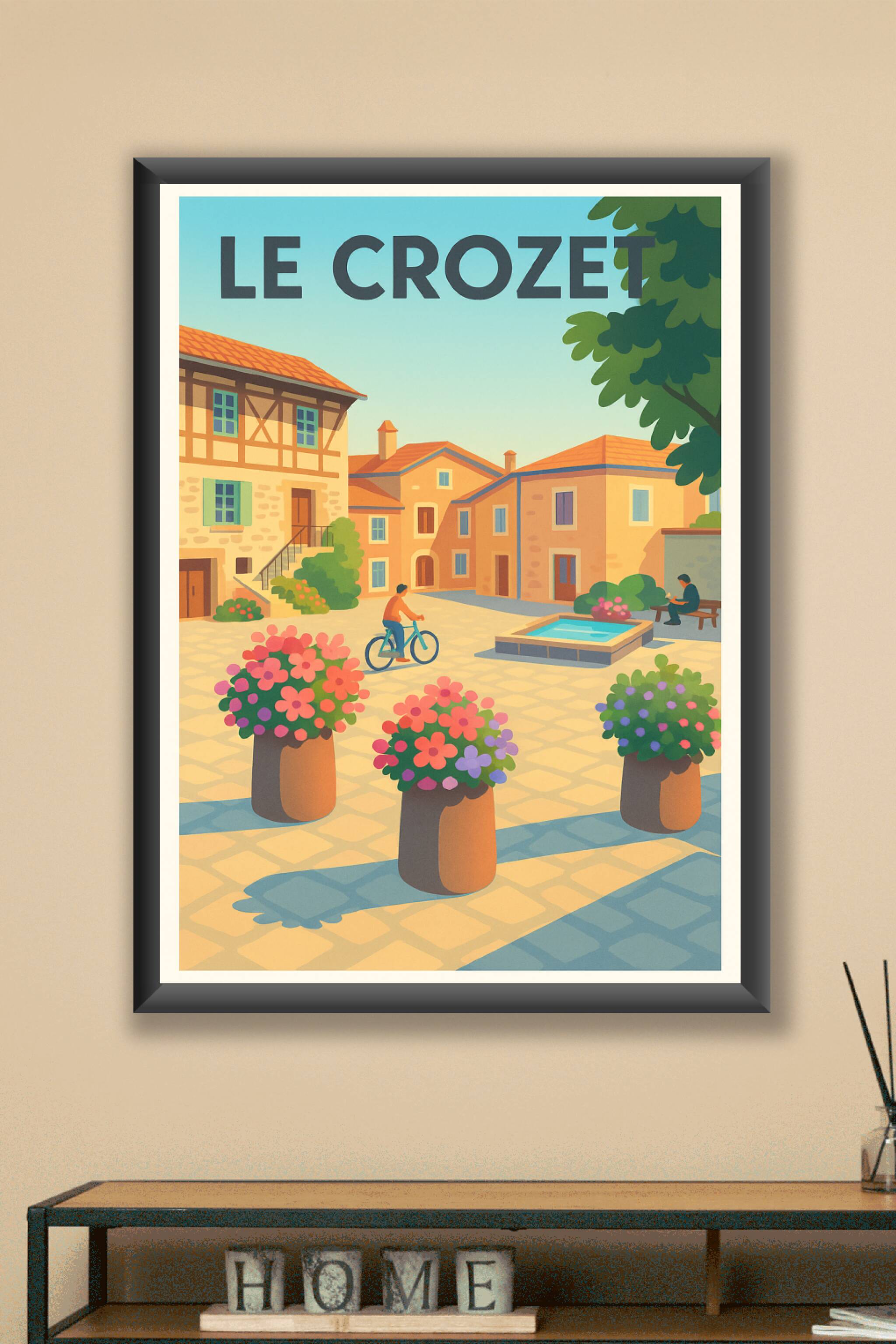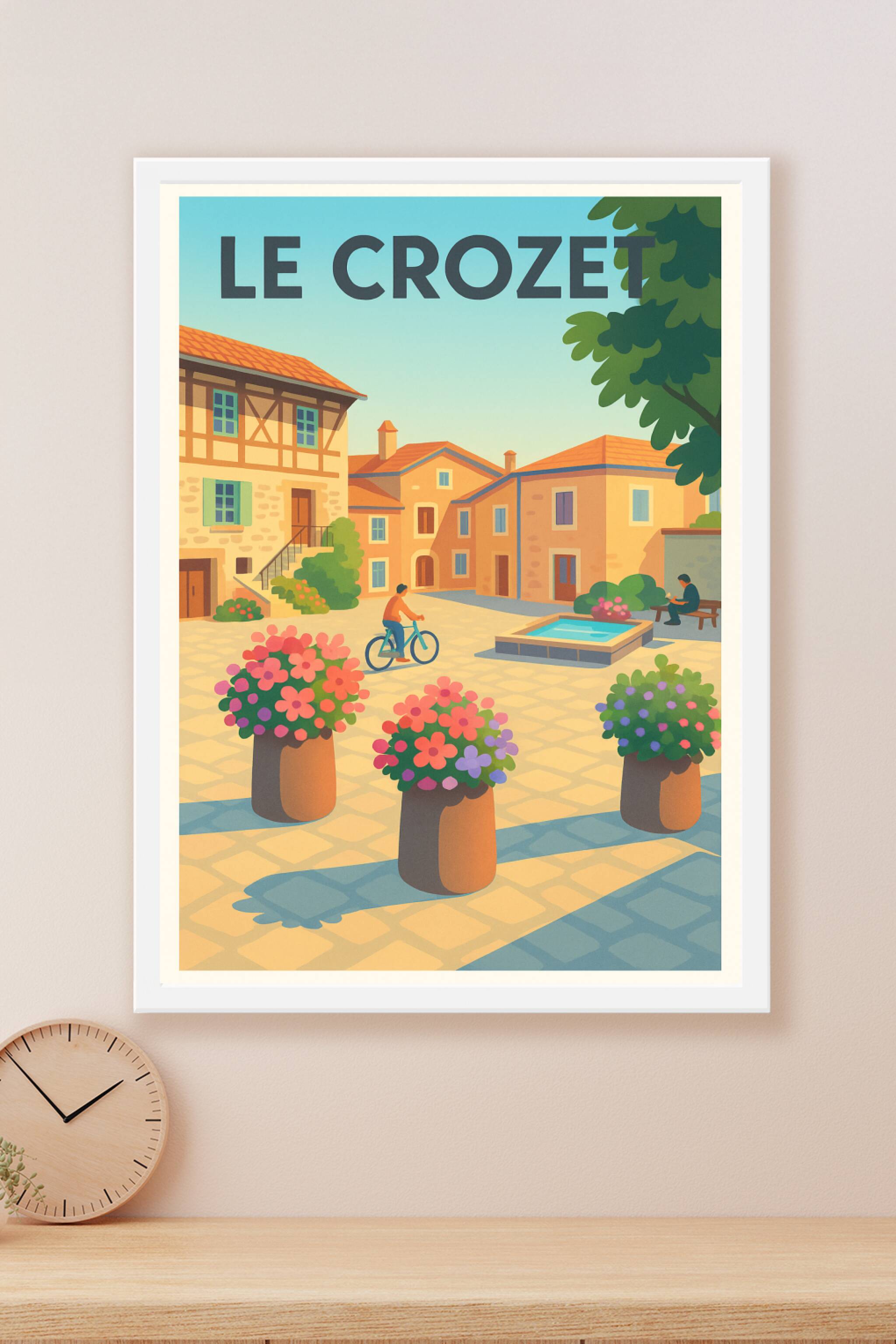 Découvrez le charme paisible du village de Le Crozet à travers cette affiche illustrée au style doux et coloré. Ce poster met en valeur les ruelles...