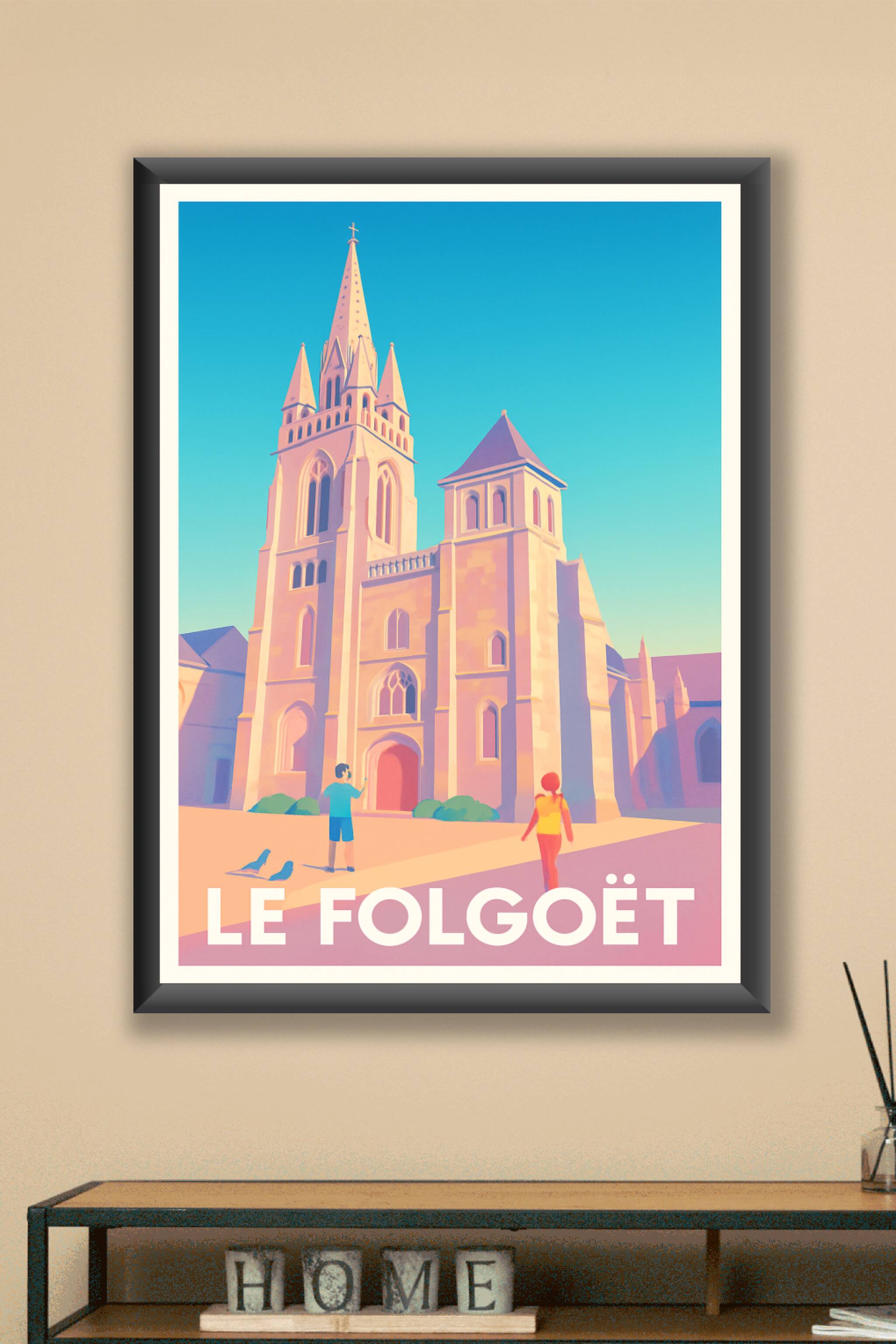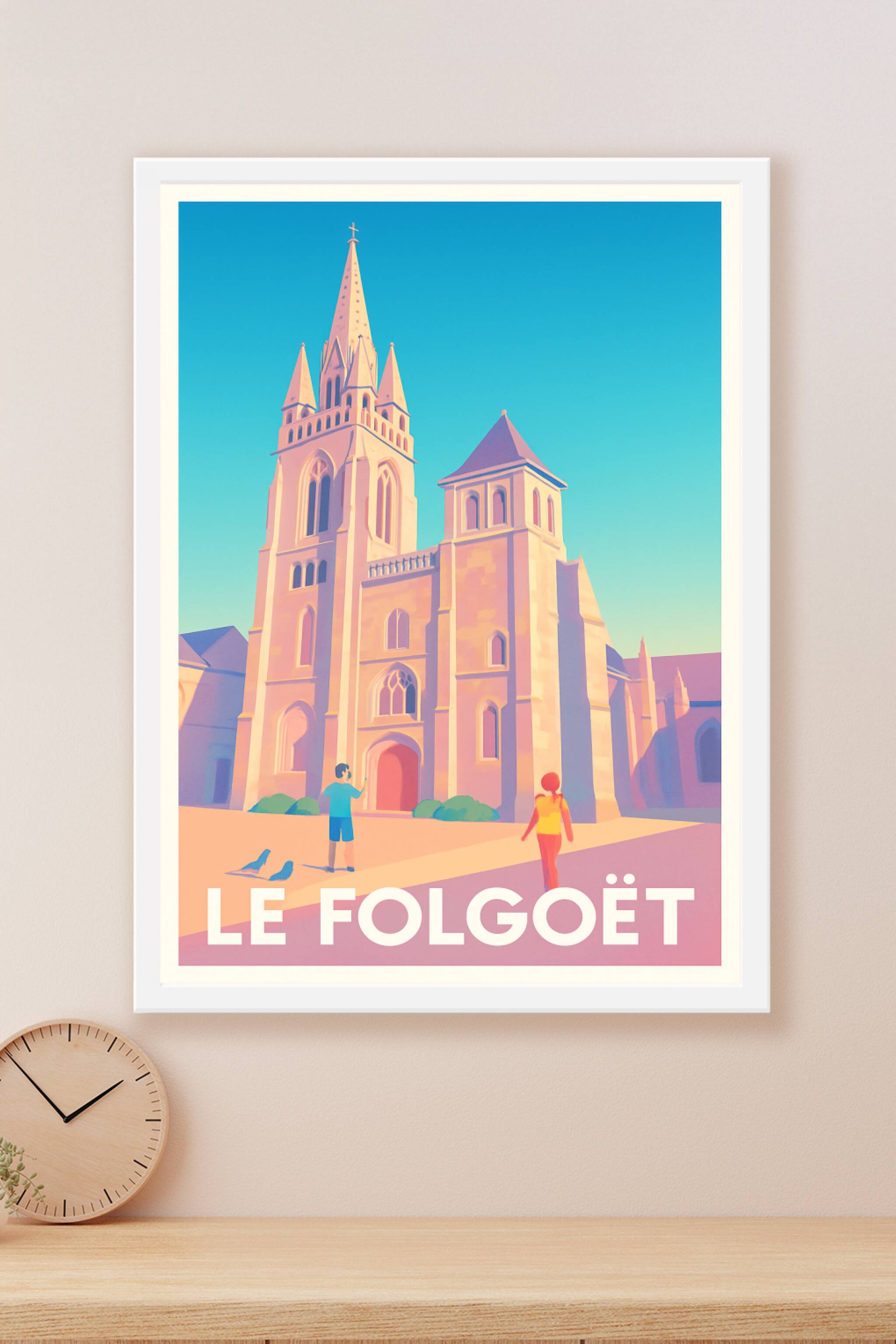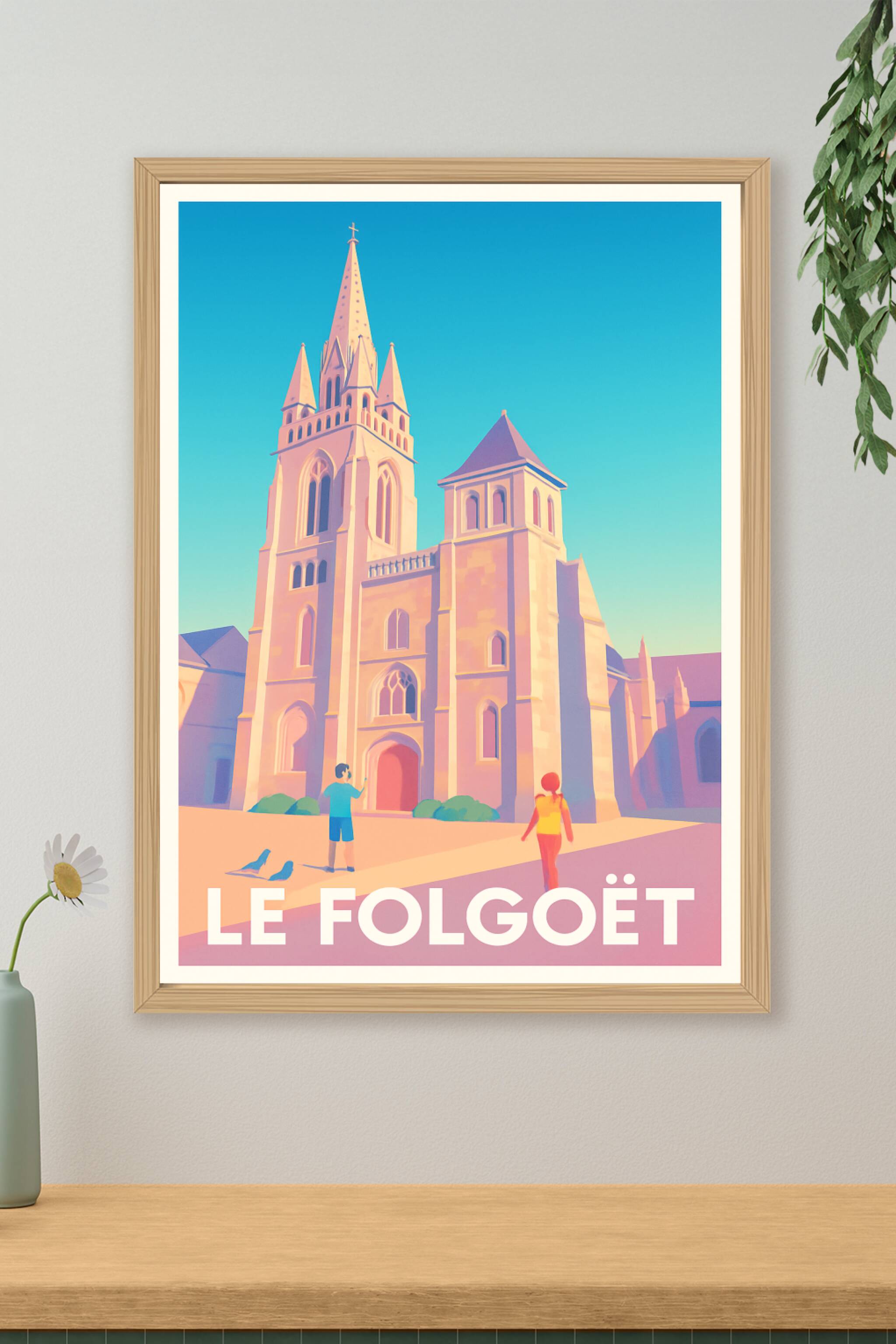 Découvrez la beauté architecturale du Folgoët avec cette affiche illustrée mettant en valeur son église emblématique baignée d'une douce lumière. C...