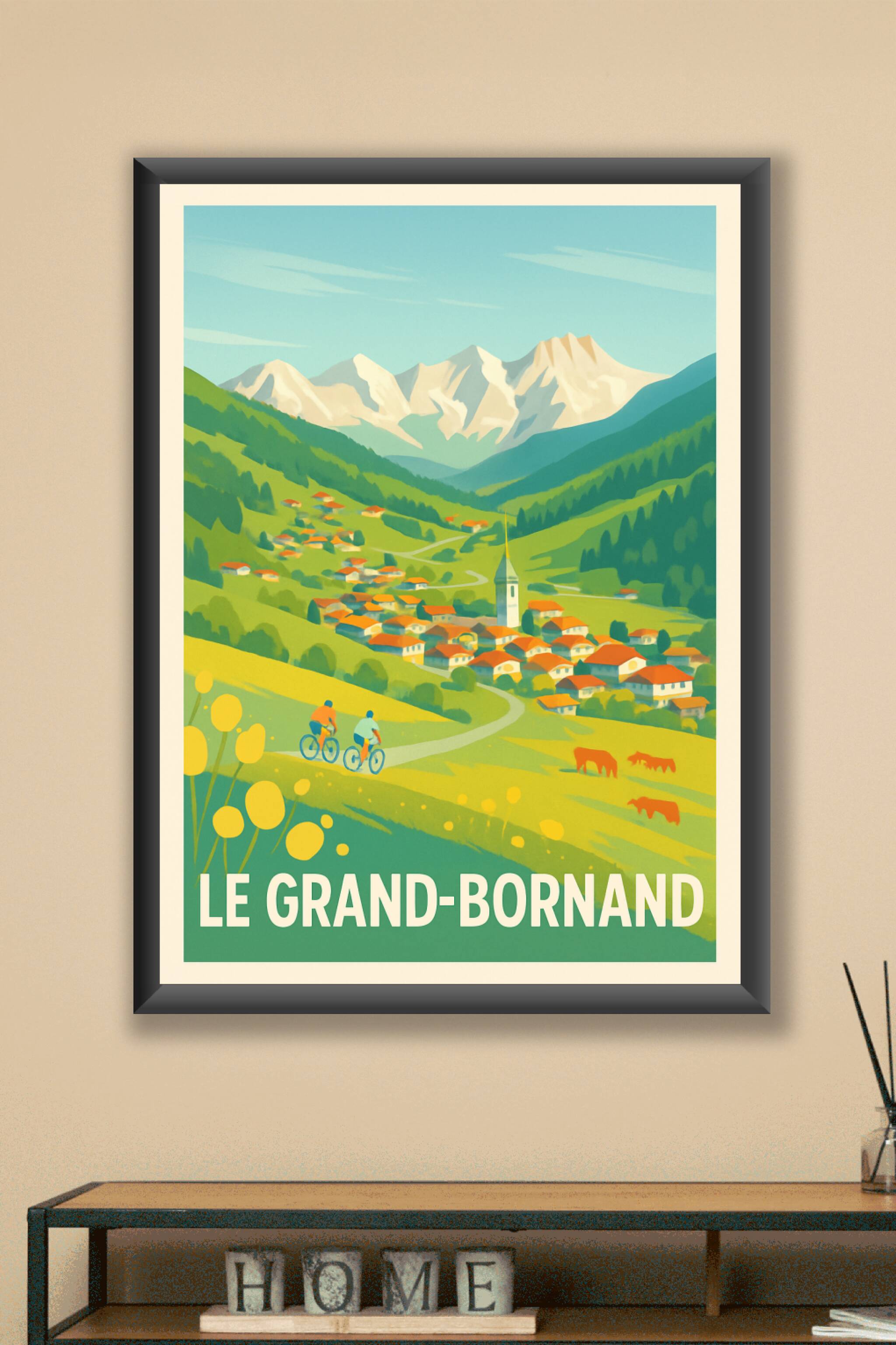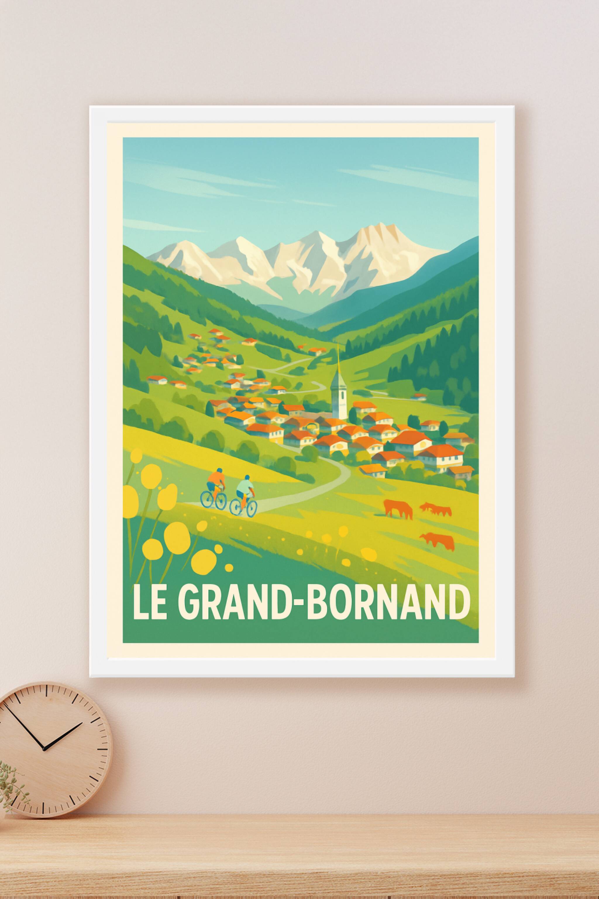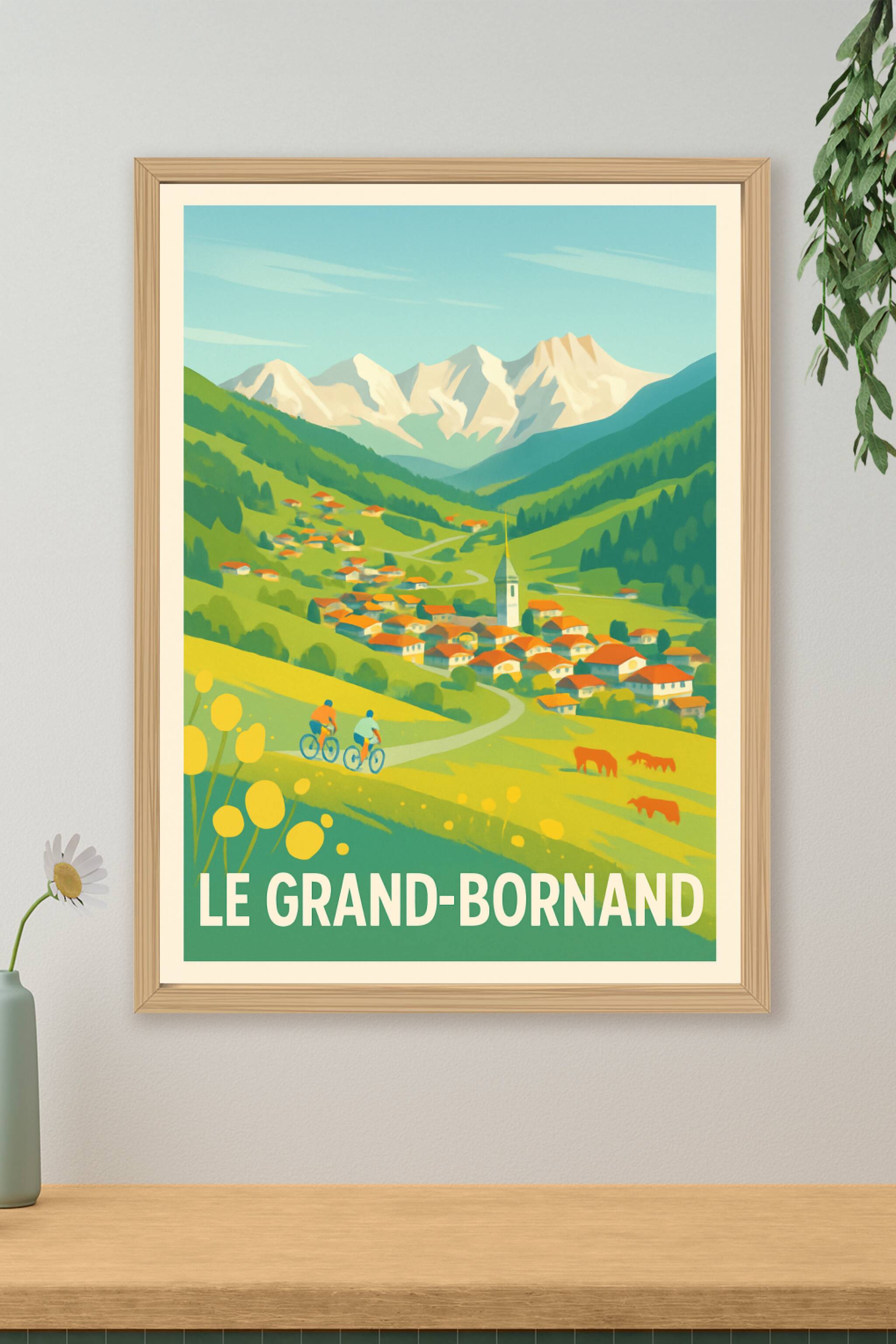 Découvrez la sérénité et la beauté naturelle du Grand-Bornand au travers de cette affiche illustrée inspirante. Ce poster met en valeur le charme authentique de ce village alpin, niché entre montagnes et prairies verdoyantes, avec ses maisons au toit rouge, ses cyclistes en balade et le panorama majestueux des sommets en arrière-plan. Imprimé en tirage "Fine Art" sur papier 305g coton, il garantit des couleurs vibrantes et une qualité d'impression exceptionnelle. Disponibles en formats A1 à A4, avec ou sans cadre, ces posters s'intègreront parfaitement à votre intérieur pour apporter une ambiance chaleureuse et rustique. Offrez-vous ou à vos proches un souvenir élégant et durable de cette destination d'exception, grâce à une production 100% française de haute qualité.