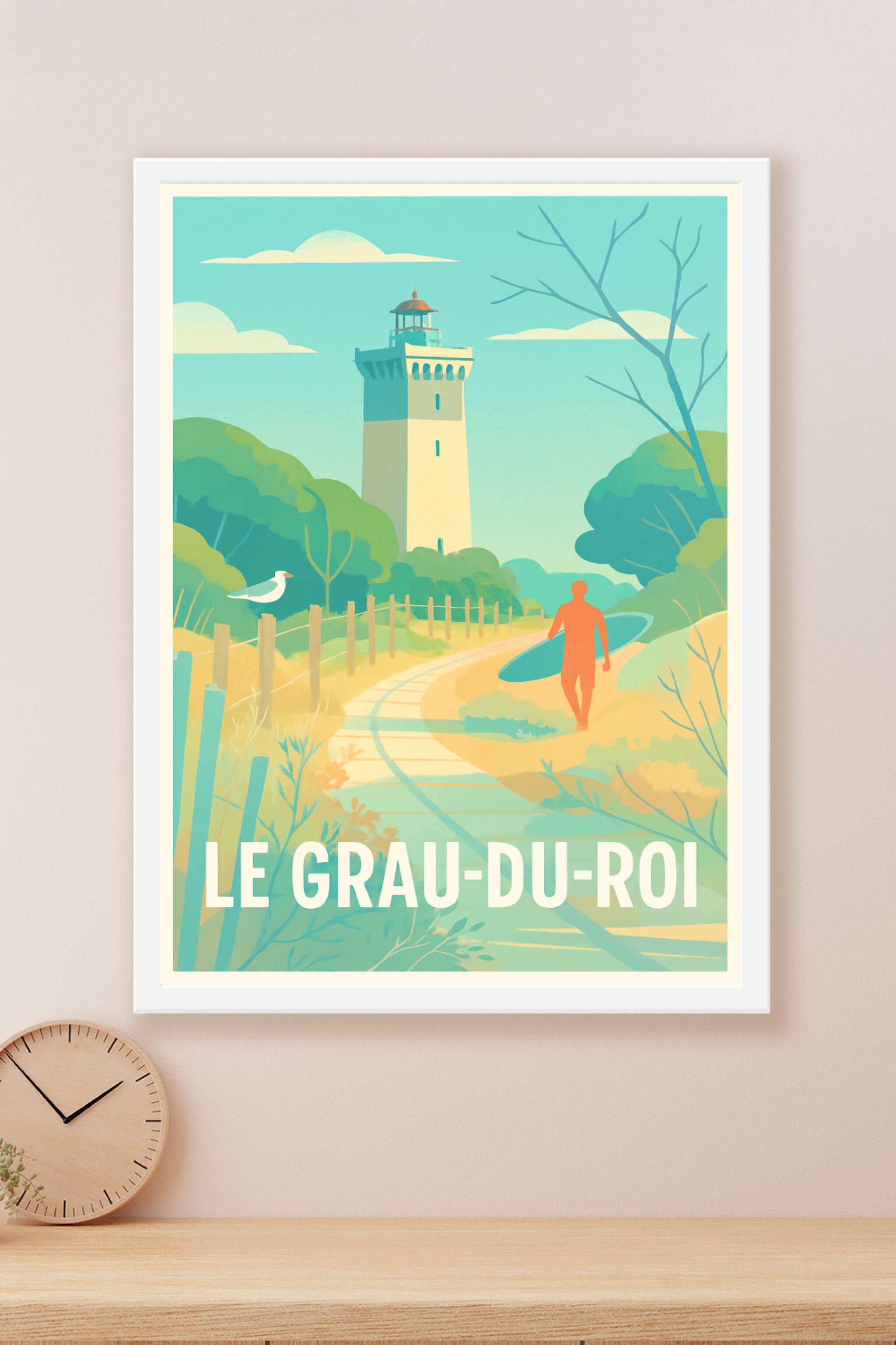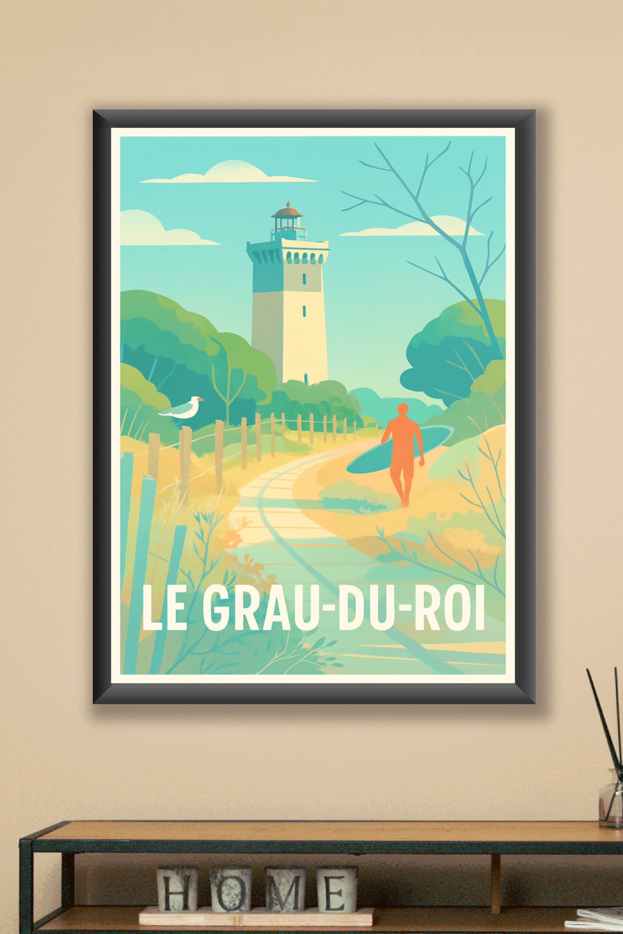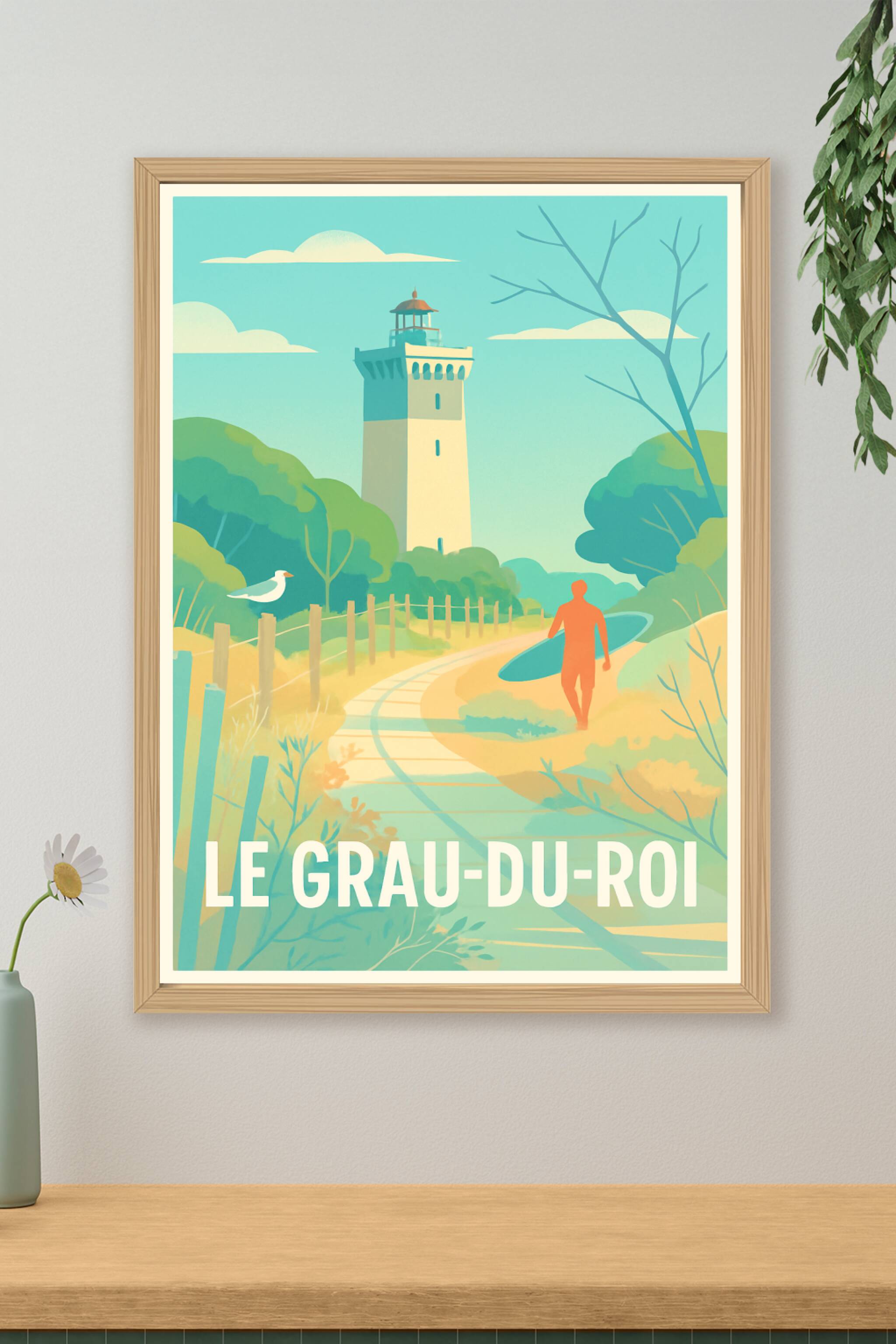 Découvrez l'atmosphère apaisante du Grau-du-Roi avec cette affiche illustrée représentant le phare emblématique et un surfeur prêt à conquérir les ...