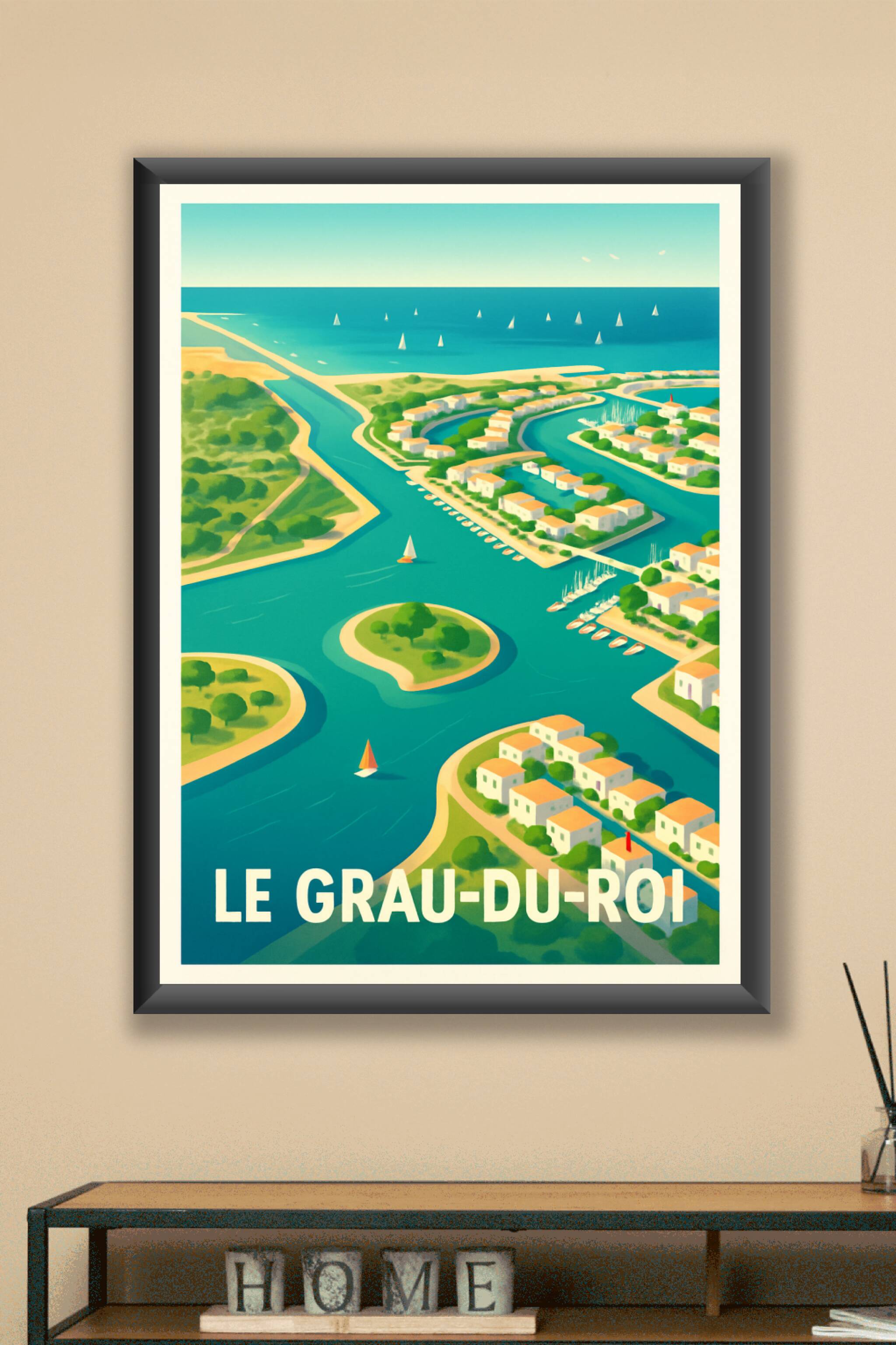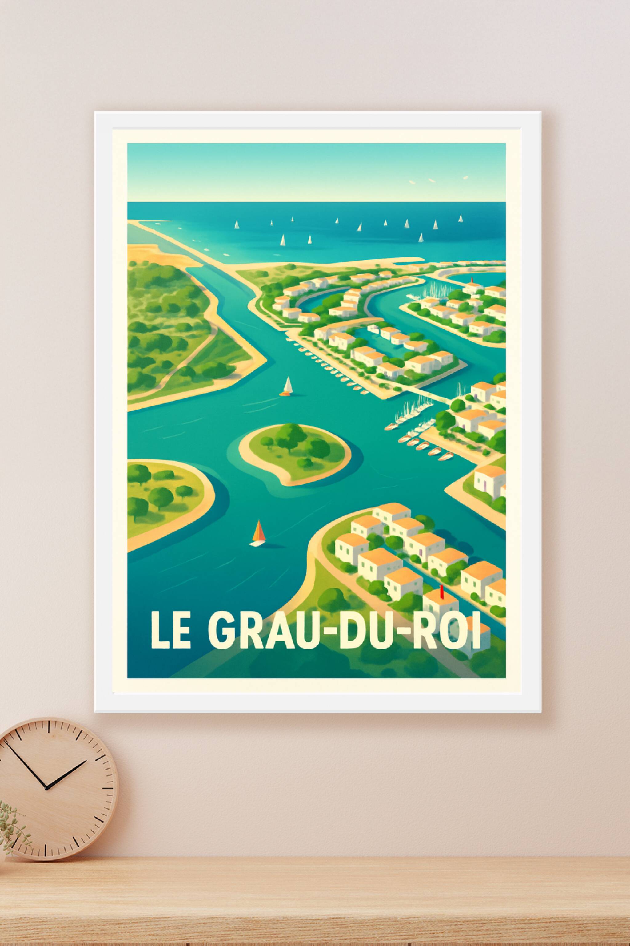Découvrez la beauté paisible et les canaux pittoresques de Le Grau-du-Roi à travers cette affiche élégante qui capture l'essence de cette charmante...