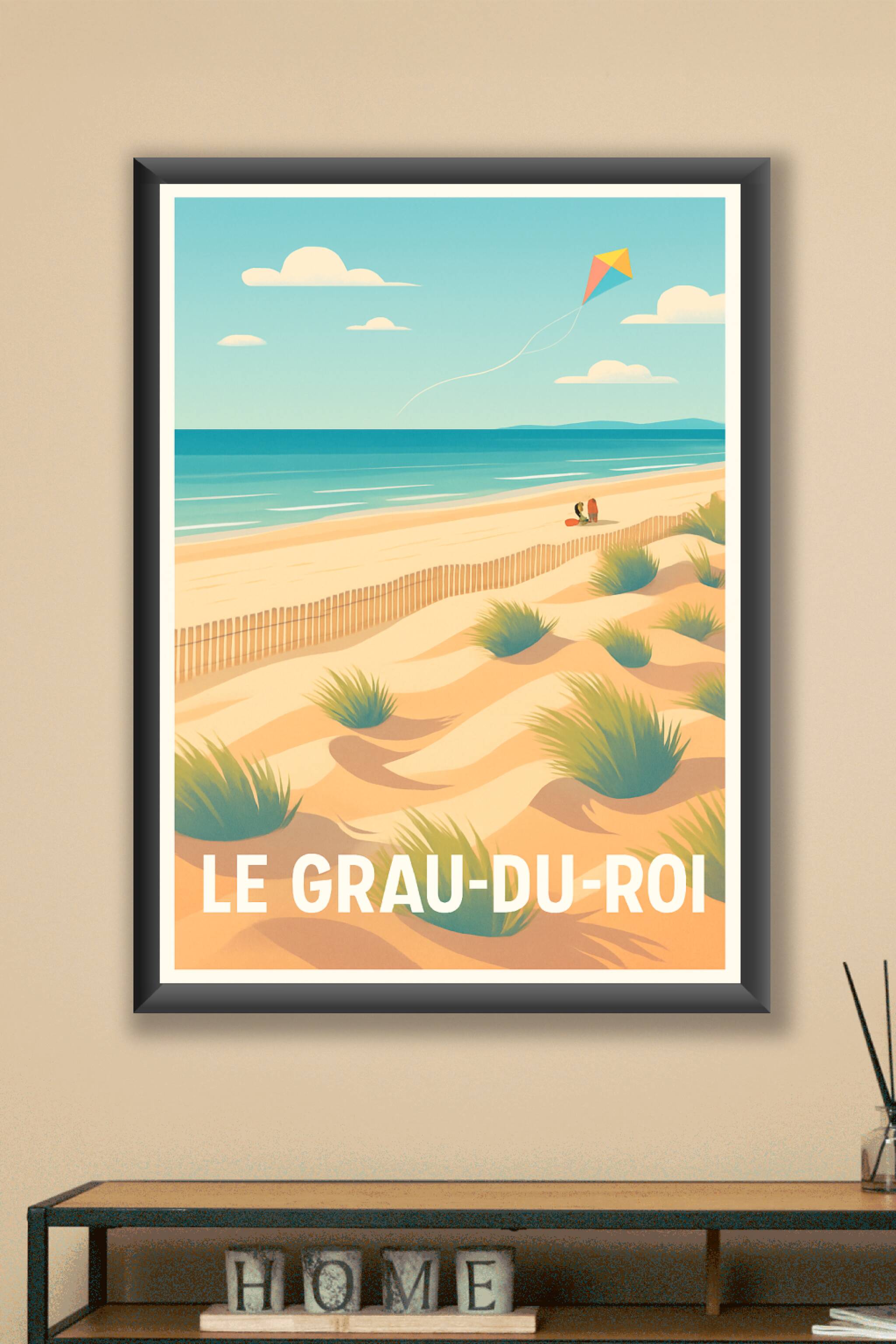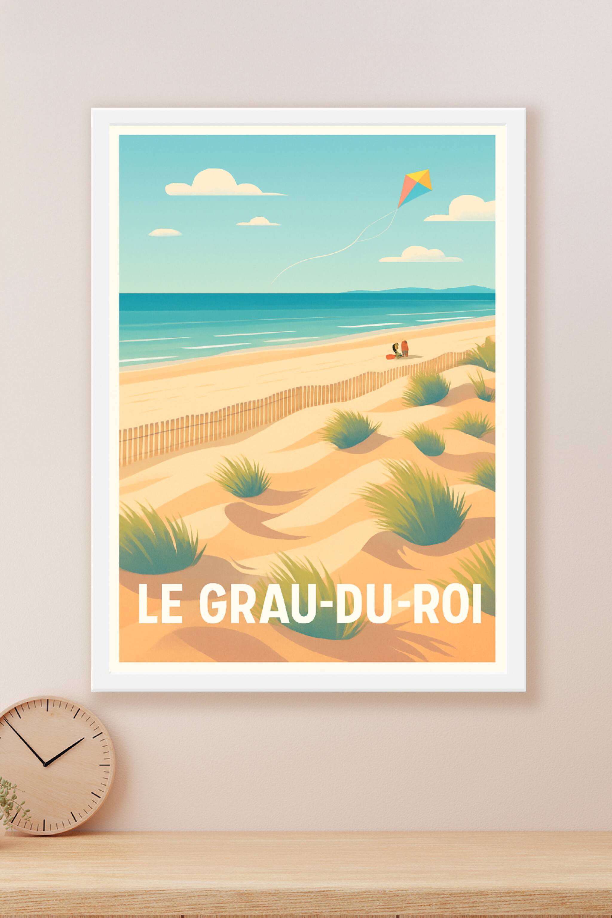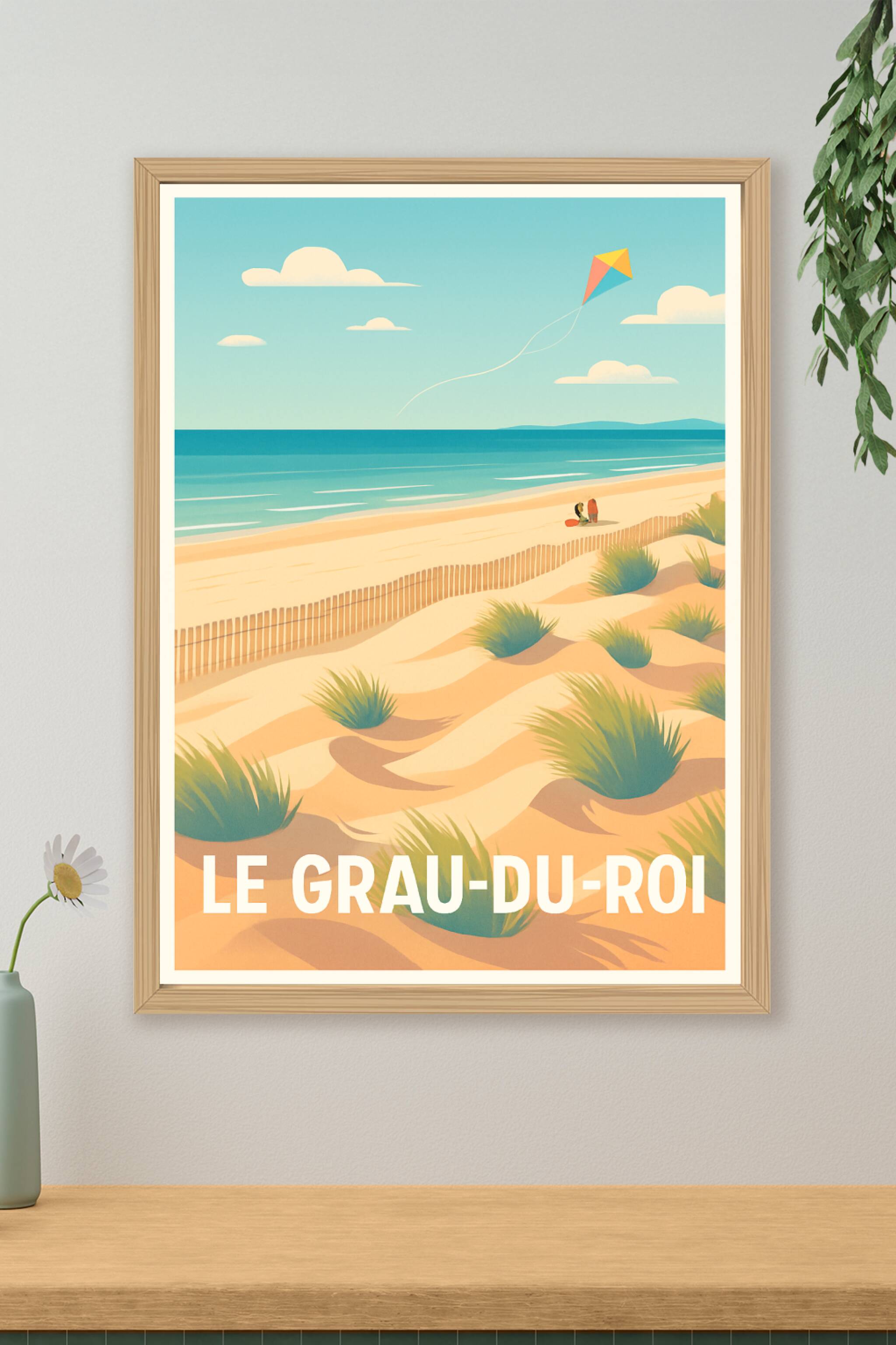 Découvrez la douceur et la beauté naturelle du littoral du Grau-du-Roi avec cette affiche au style vintage et épuré. Le poster illustre une plage p...