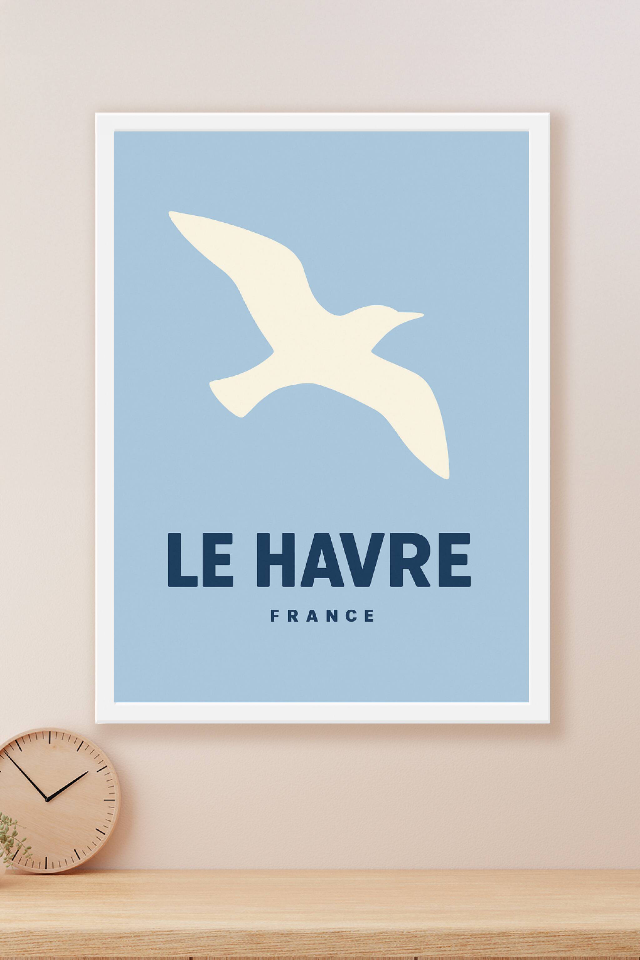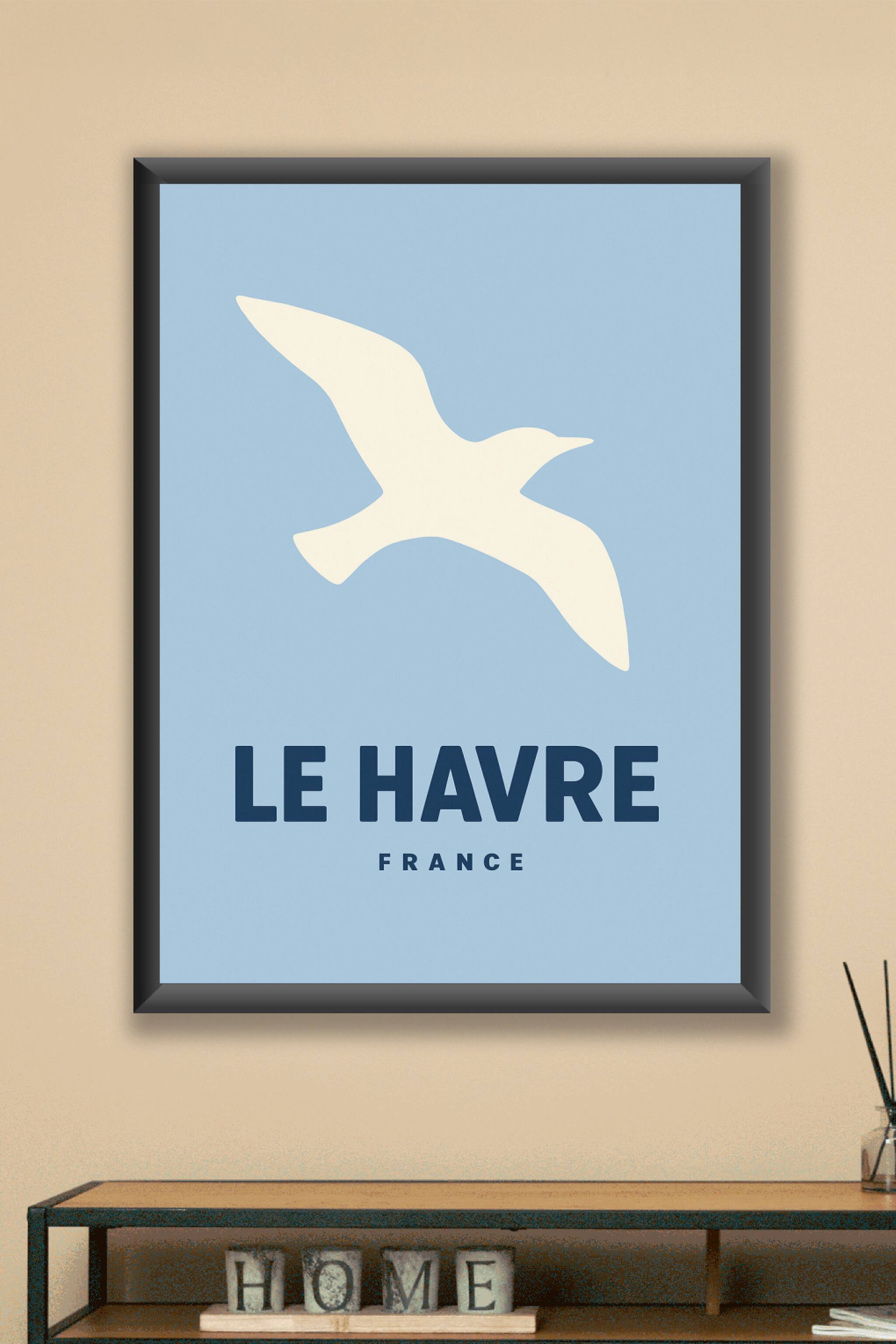 Découvrez cette affiche minimaliste dédiée à Le Havre, où la silhouette d'une mouette s'envole sur un fond bleu apaisant, symbole de la ville portu...